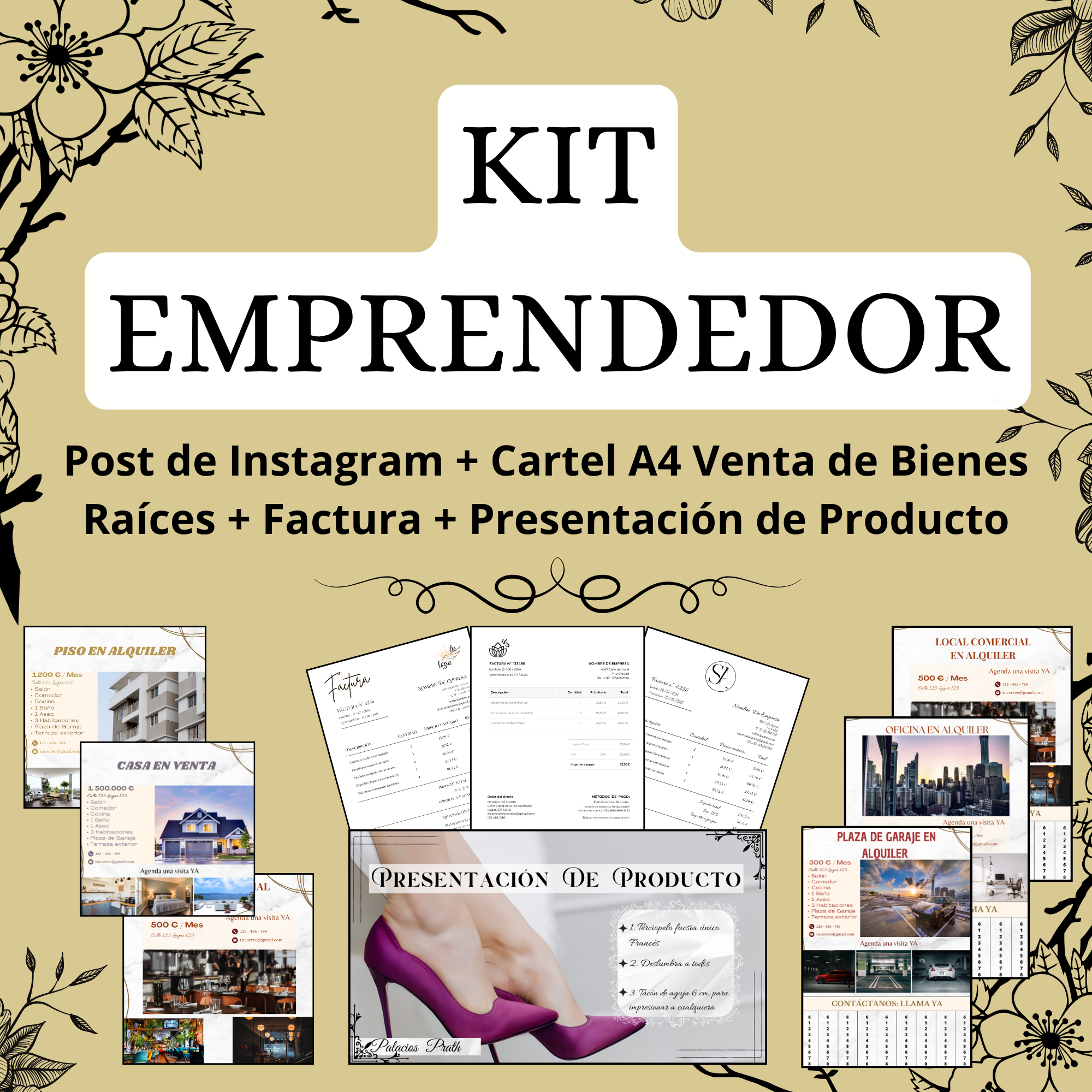 Formatos digitales listos para redes y para impresión: imprime los carteles, usa los posts en tu perfil y envía tu factura y presentación en PDF.