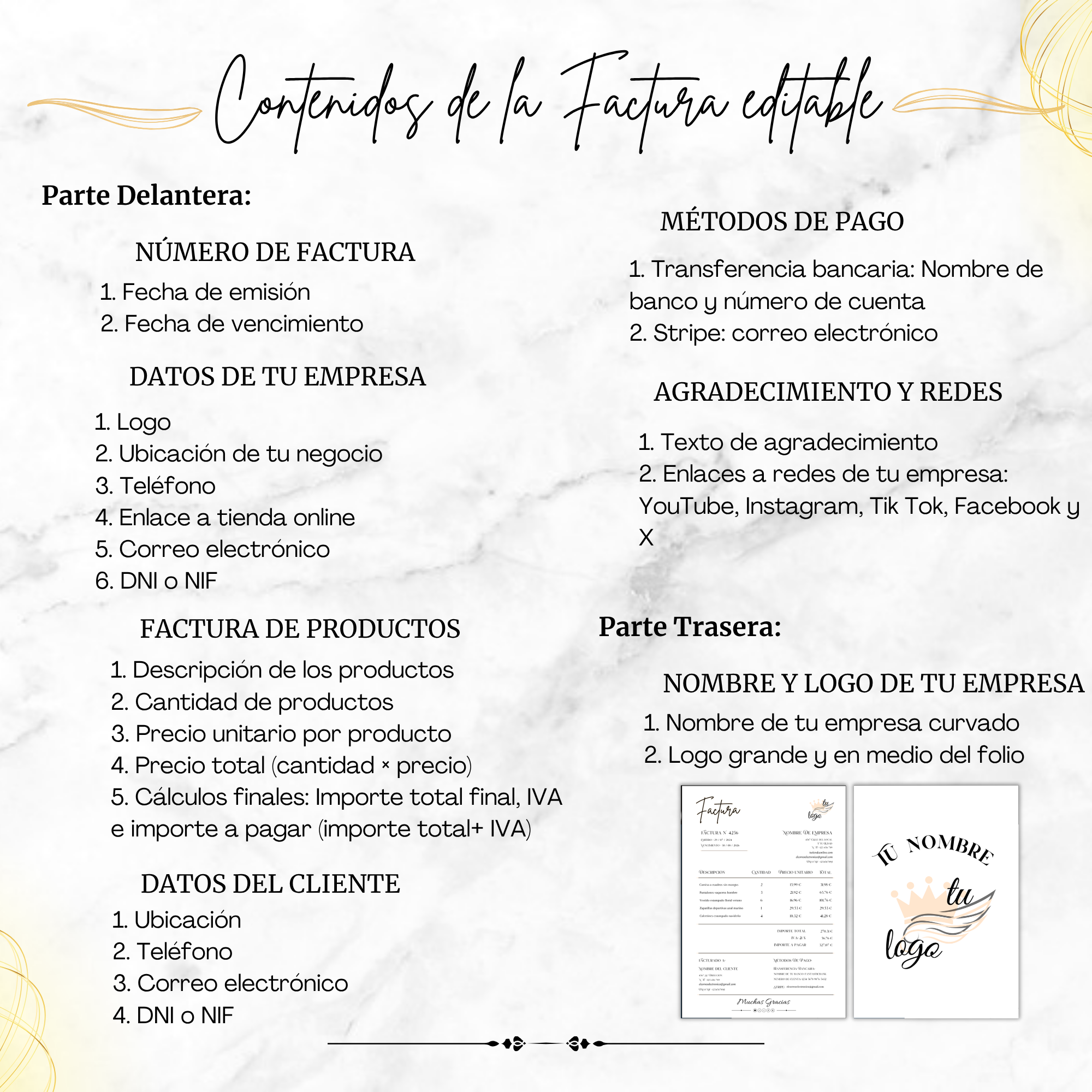 Incluye todos los elementos requeridos para una factura profesional: