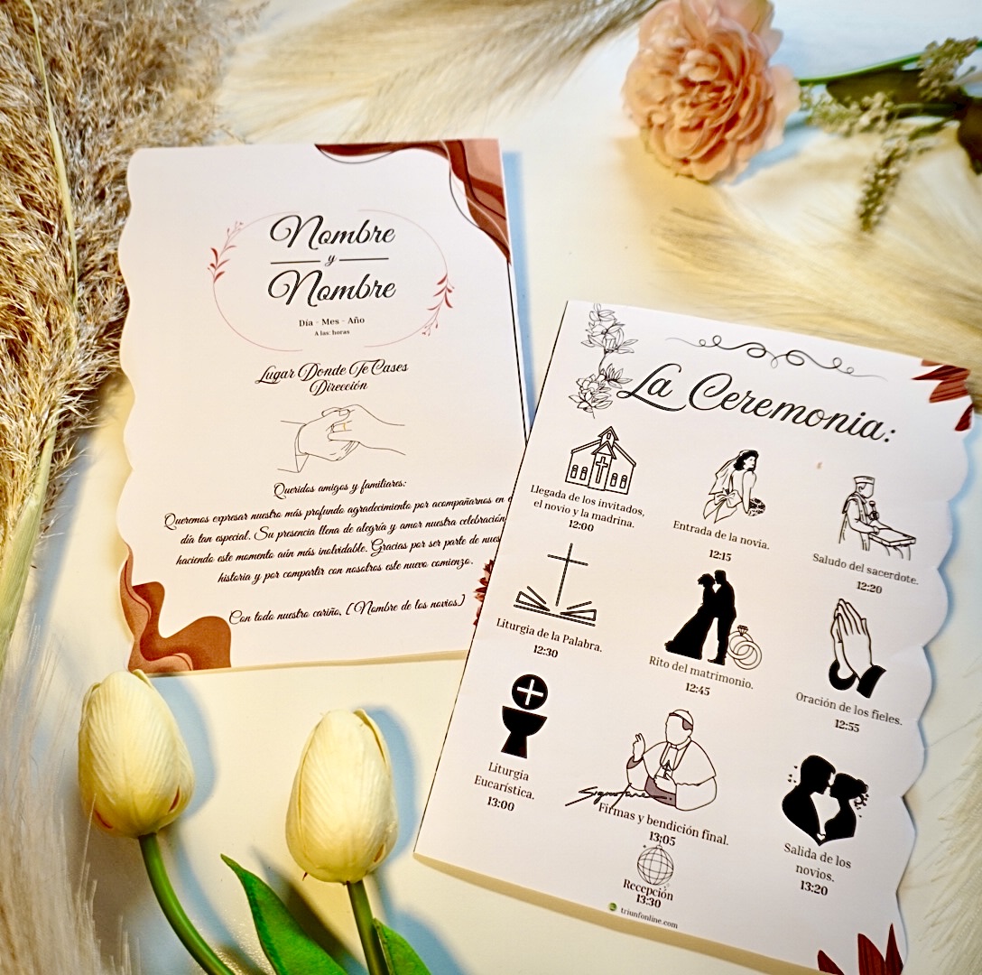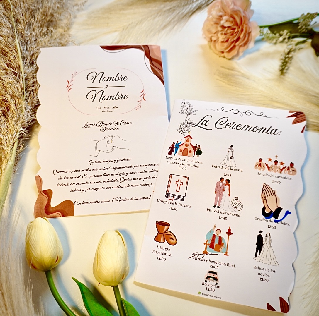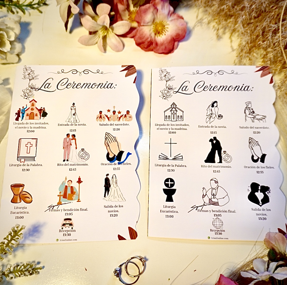 Este diseño organiza de forma elegante cada uno de los momentos de la ceremonia, ayudando a los invitados a seguir el orden del acto con armonía visual.
