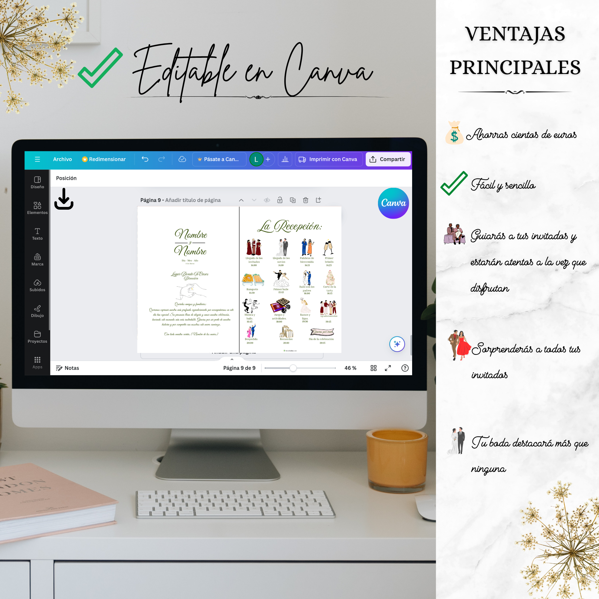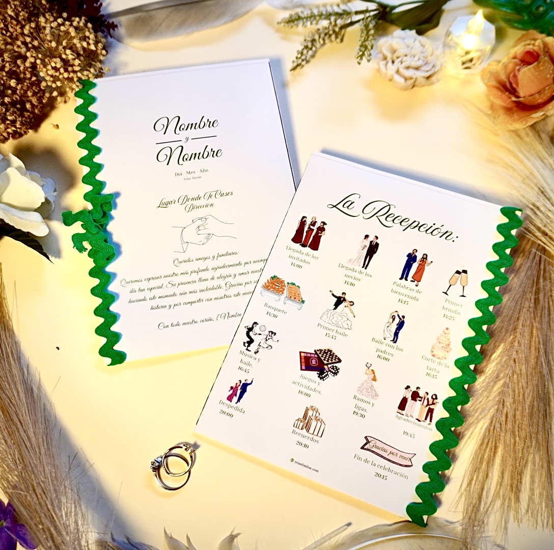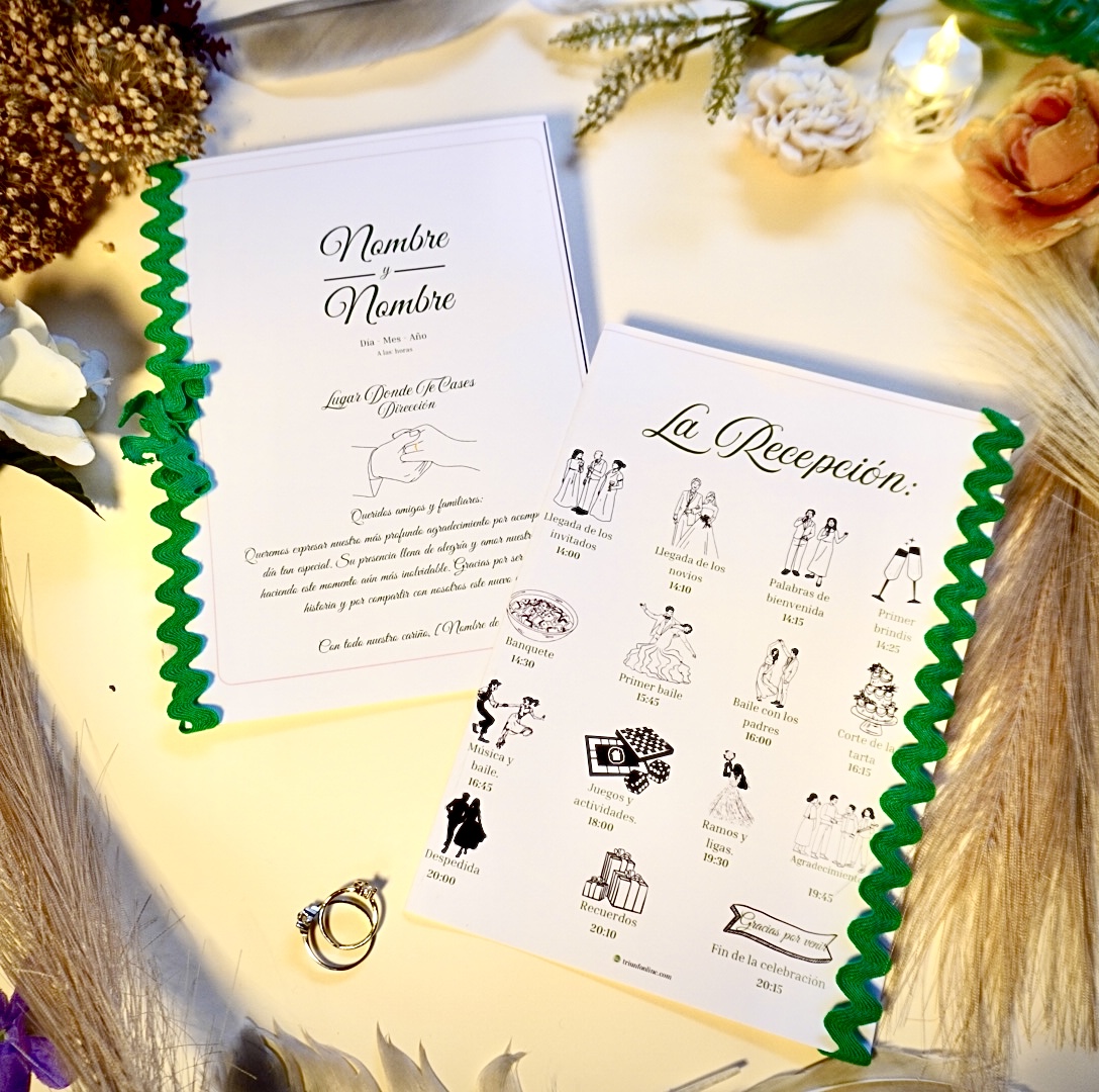 📥 Entrega digital automática, totalmente personalizable con los nombres de los novios, fecha, lugar, frases, agradecimientos o lo que desees añadir.