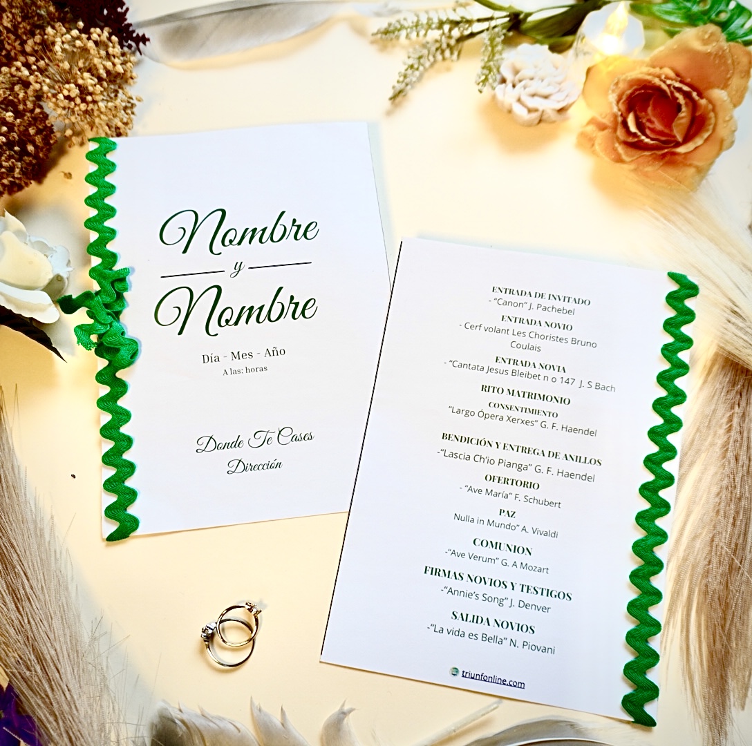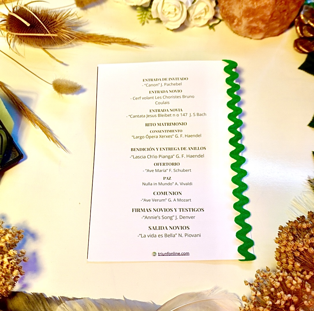 Incluye todos los momentos musicales clave de tu ceremonia (entrada, lecturas, alianzas, ritos, salida…) presentados con claridad y orden, sin recargar, para que los invitados lo sigan fácilmente.