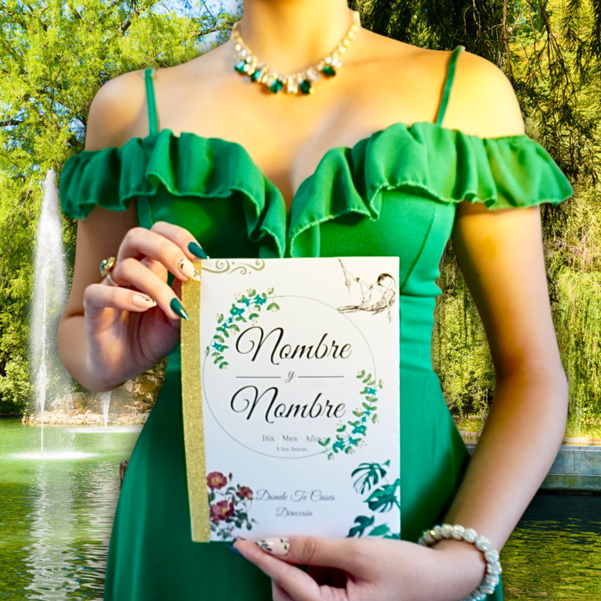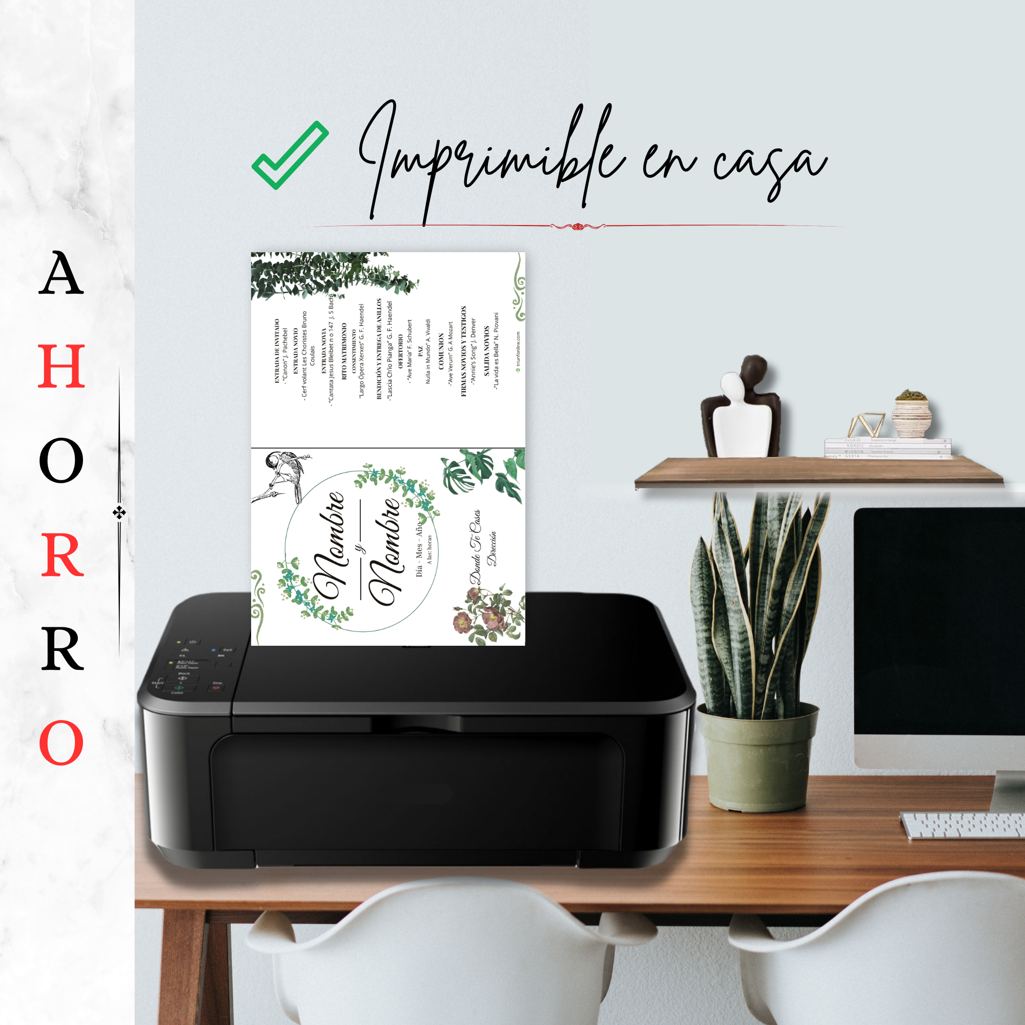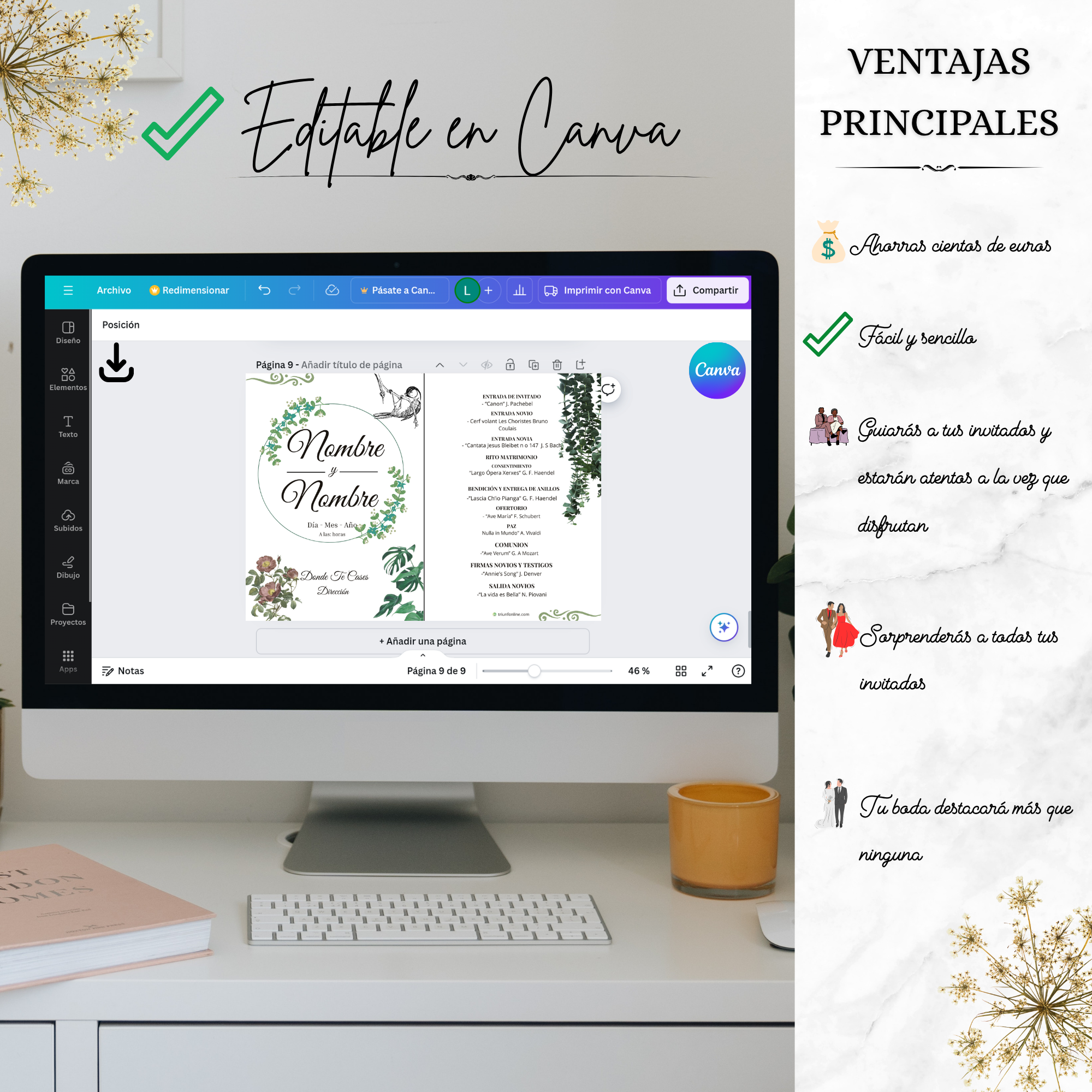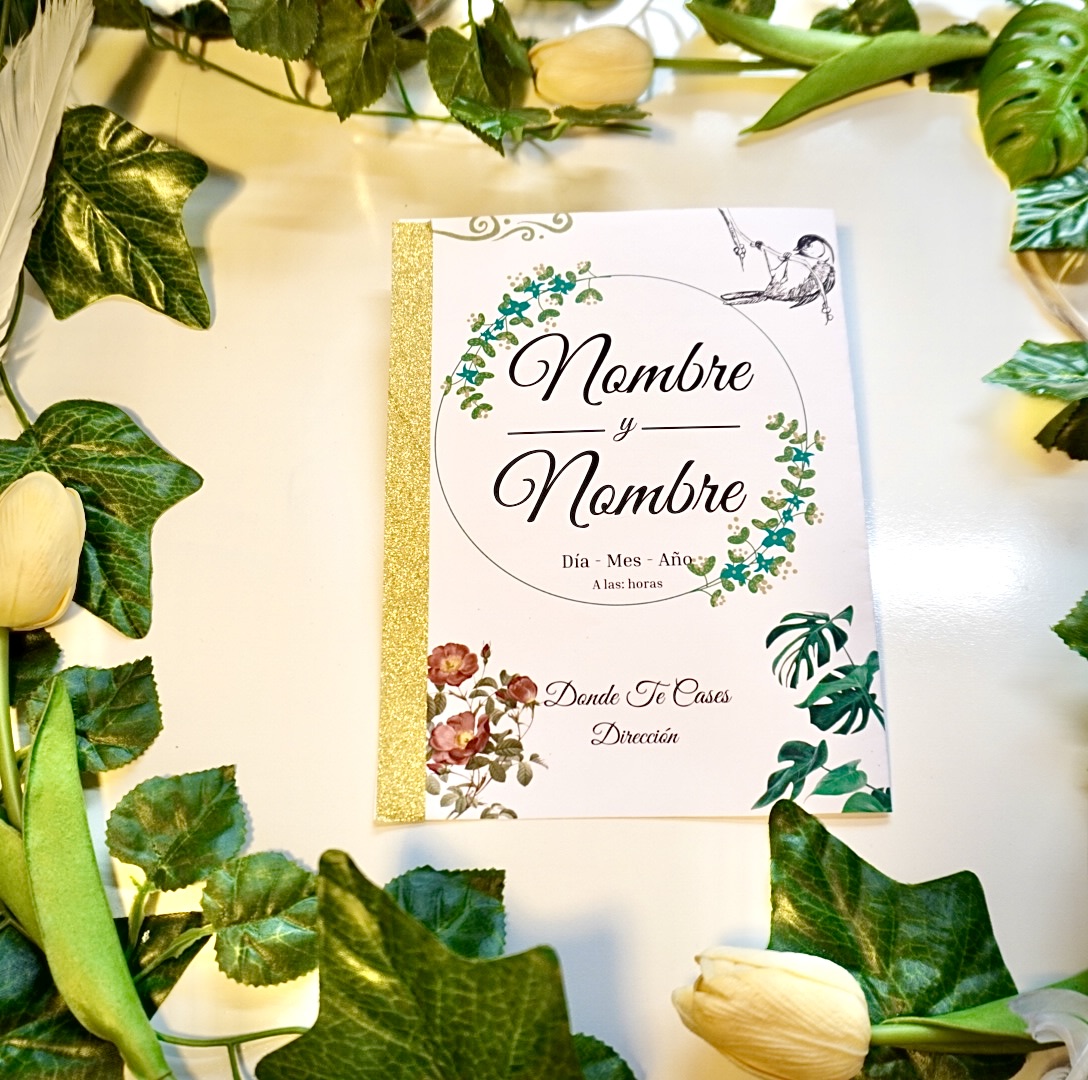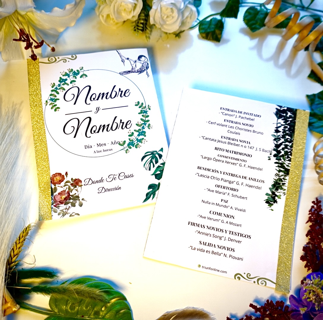 Este programa transmite la esencia de una boda conectada con la naturaleza: fondo blanco puro, decorado con ramas verdes, hojas suaves y un pequeño pajarillo que aporta un toque tierno y orgánico. El estilo es fresco, luminoso y natural, perfecto para ceremonias al aire libre o en entornos campestres.