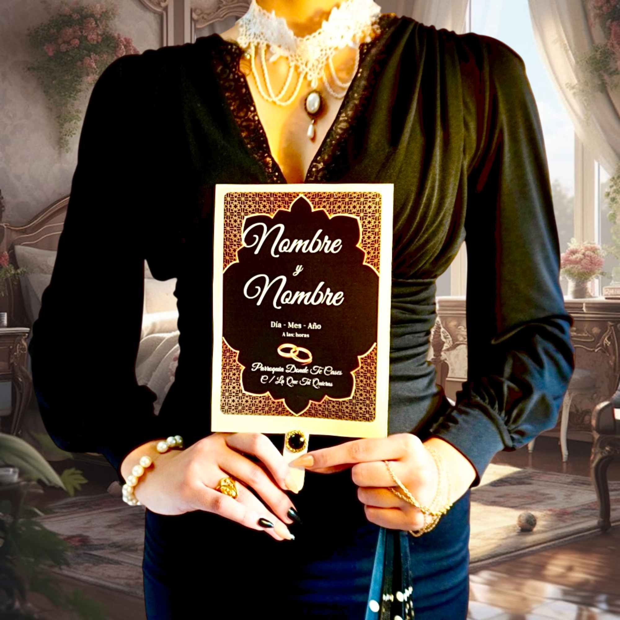 Un diseño con carácter, elegancia y nostalgia. Esta opción destaca por un doble fondo: el principal en tono amarillo dorado y otro fondo interior en negro profundo, creando un fuerte contraste con la tipografía blanca, que resalta con claridad. El conjunto se enmarca con detalles dorados, evocando el aire clásico del estilo vintage sin perder sofisticación.