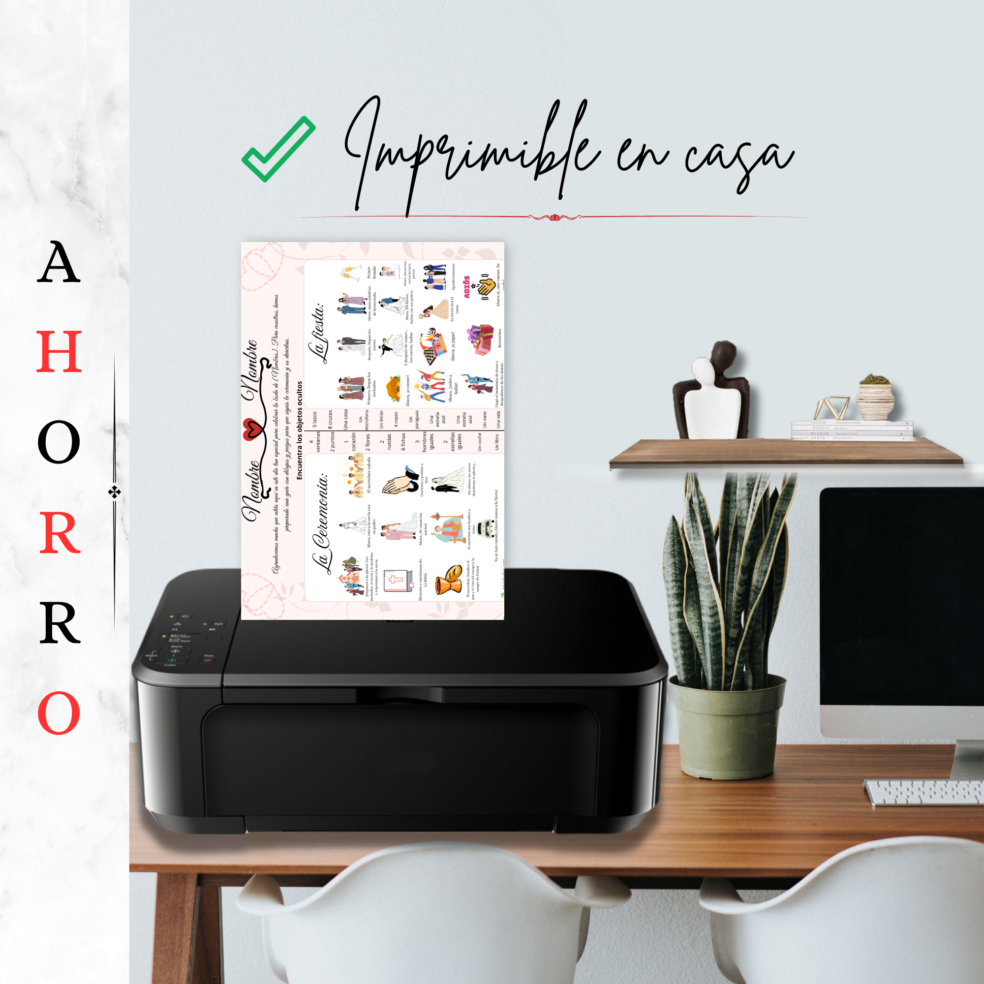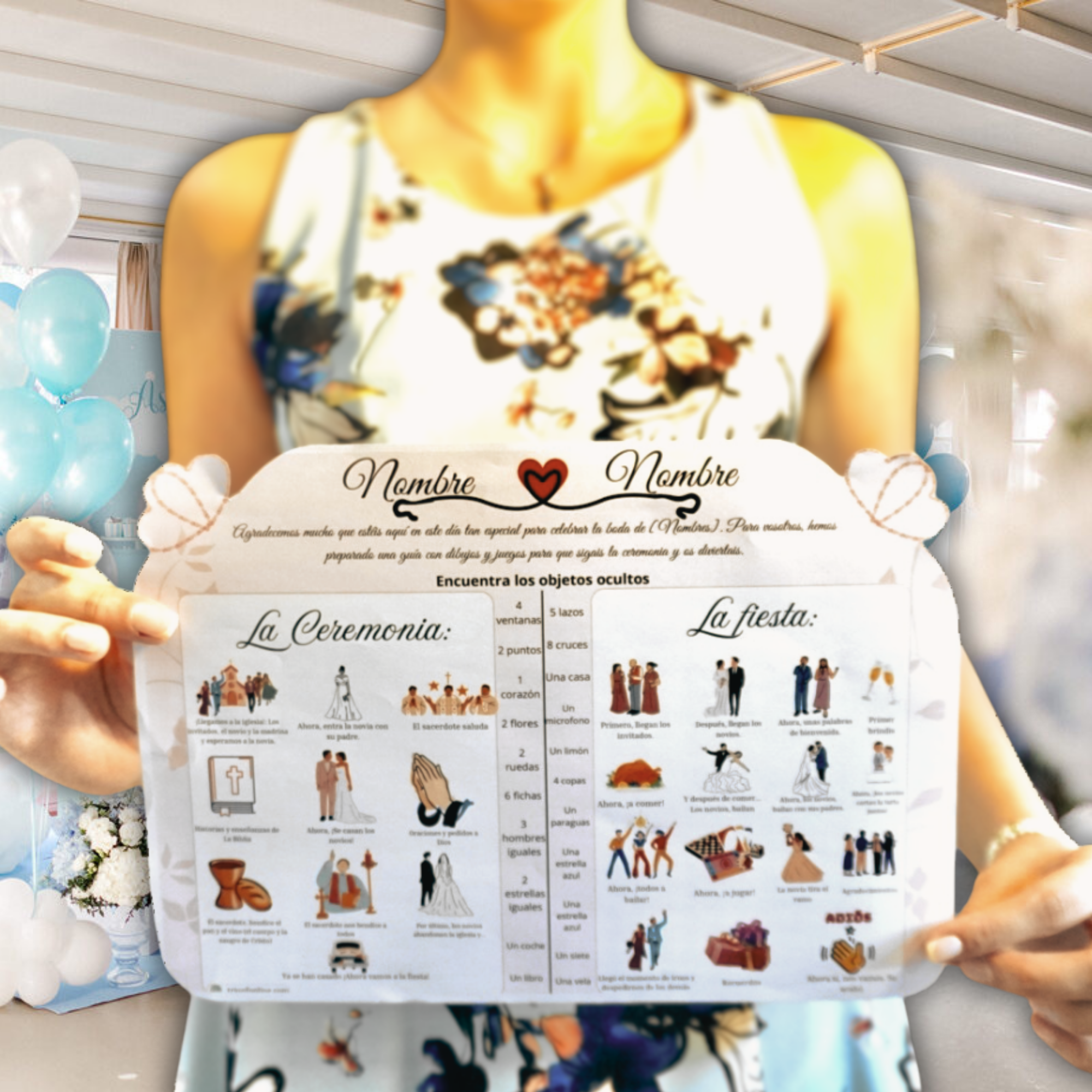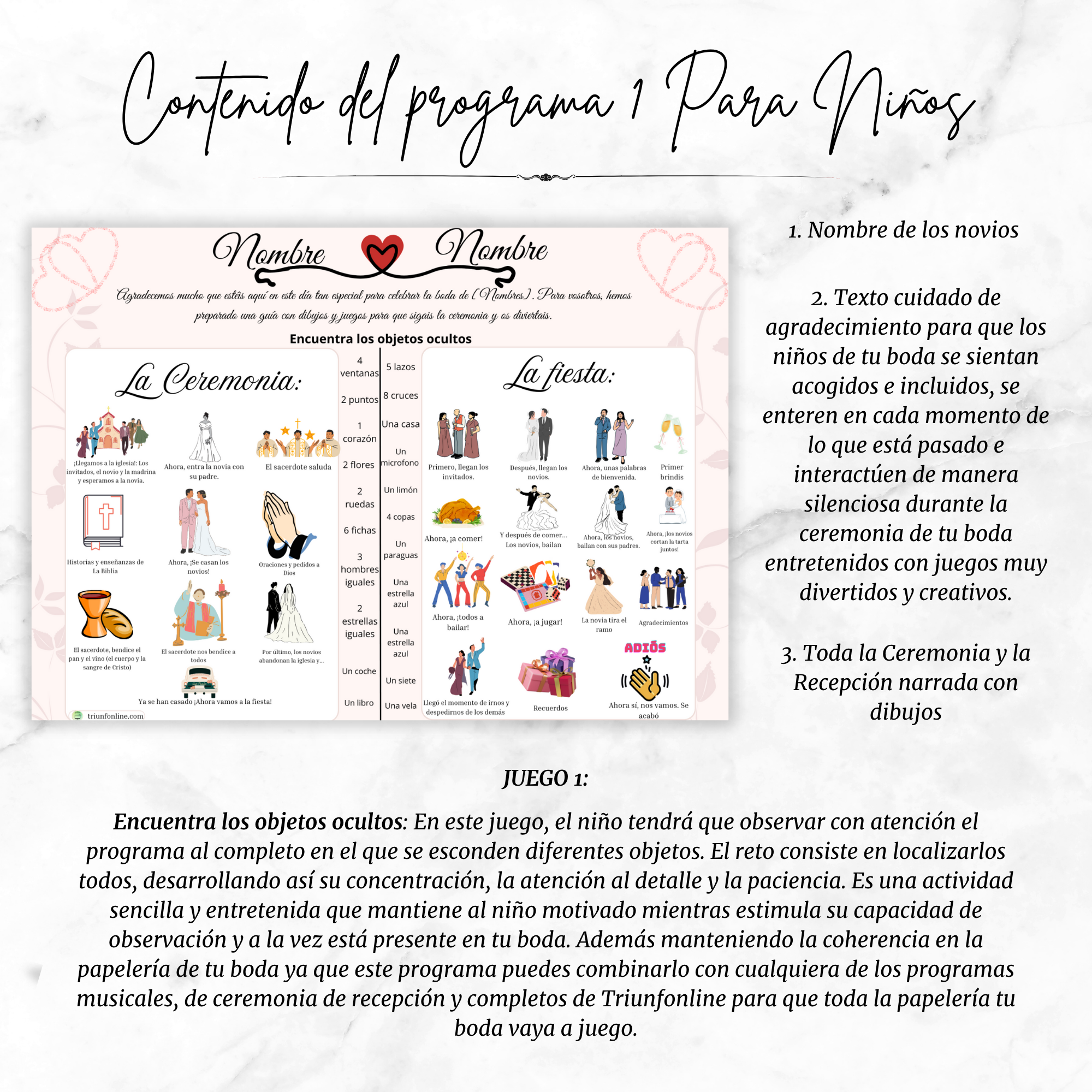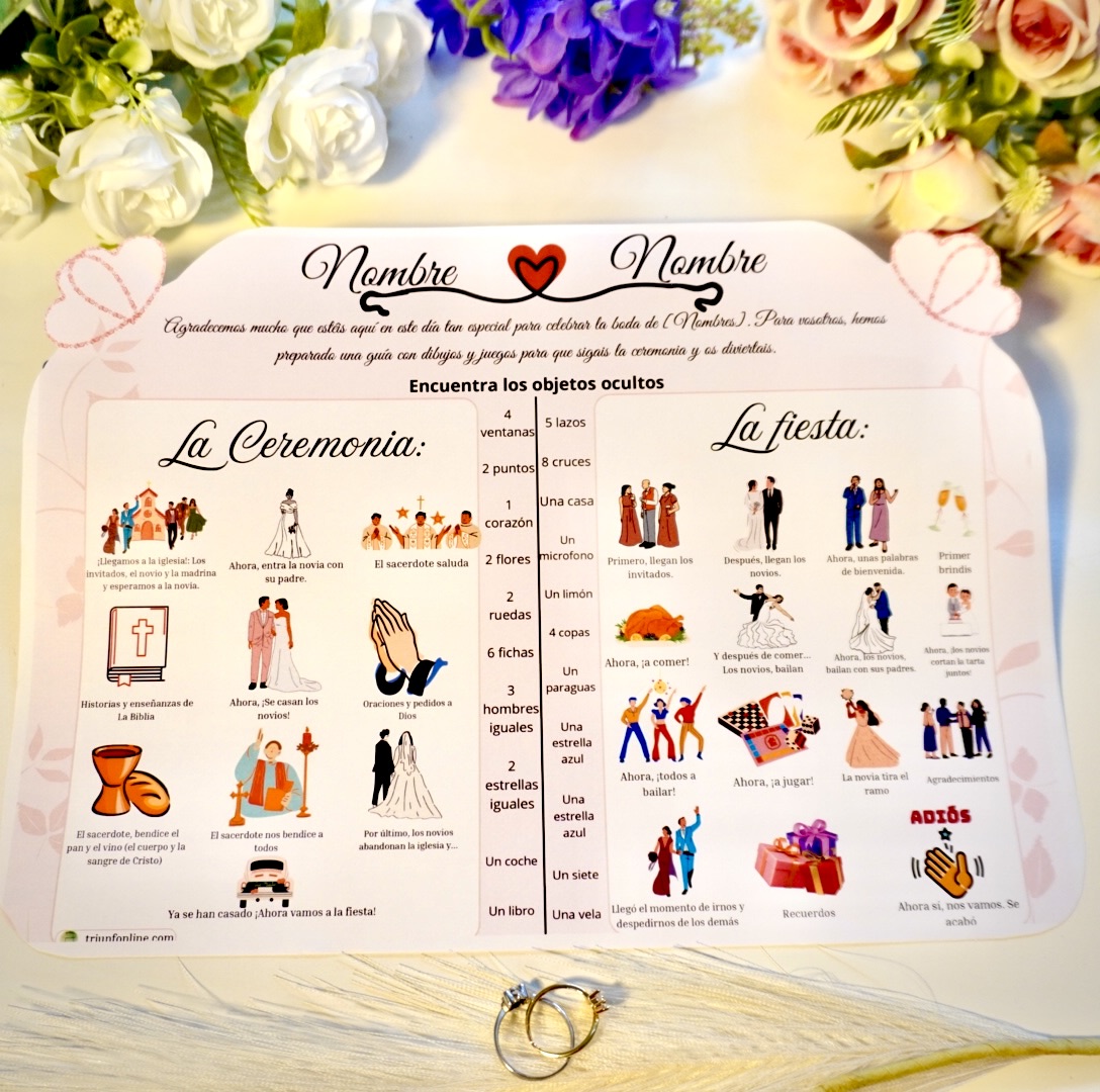 Para mantener su atención sin que se aburran ni hagan ruido durante la ceremonia, este programa incluye un divertido juego visual: una lista de objetos ocultos repartidos por las ilustraciones que deberán encontrar.