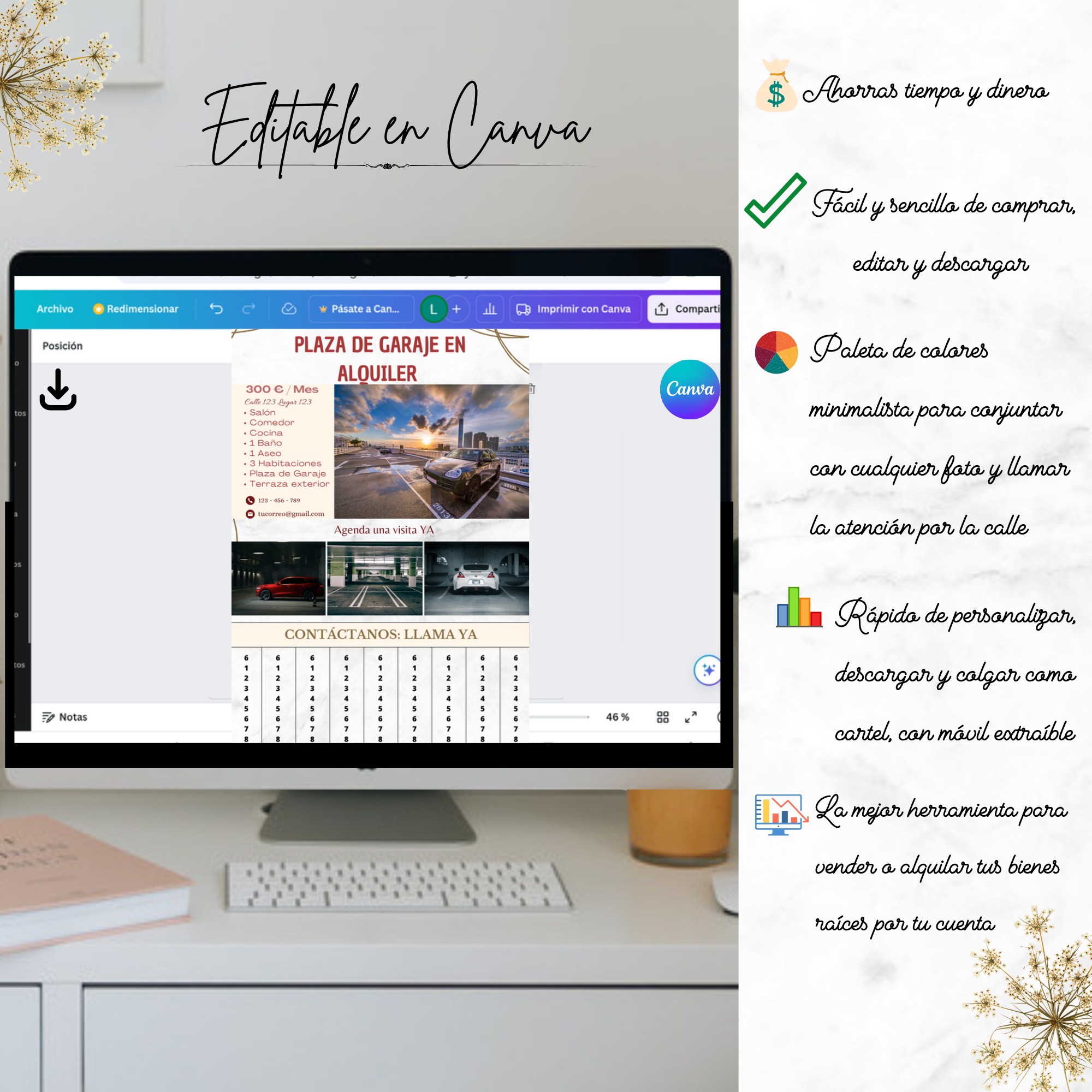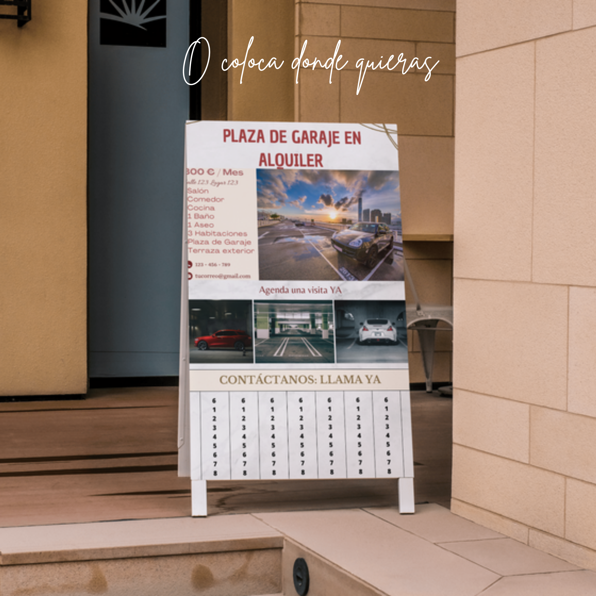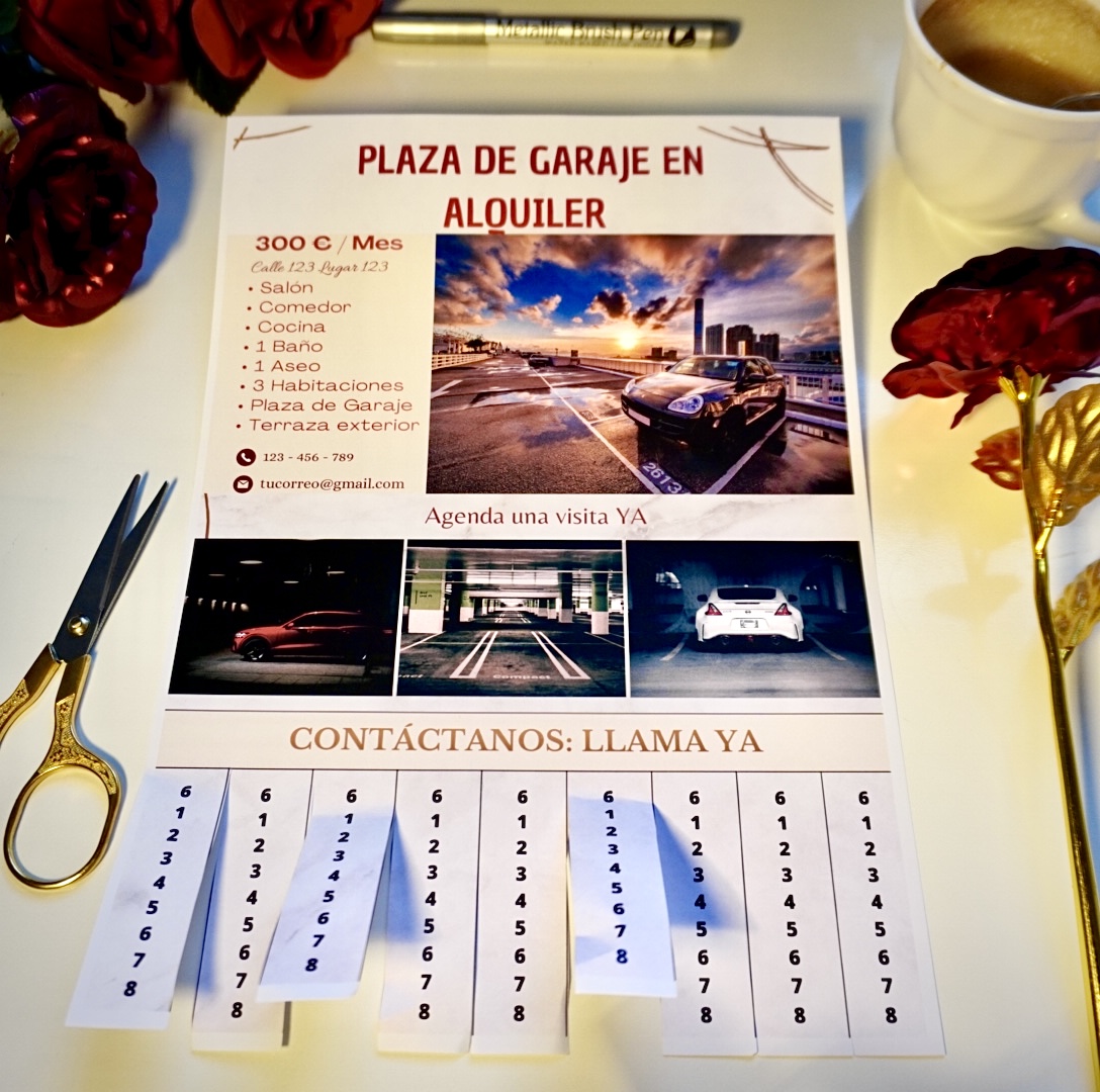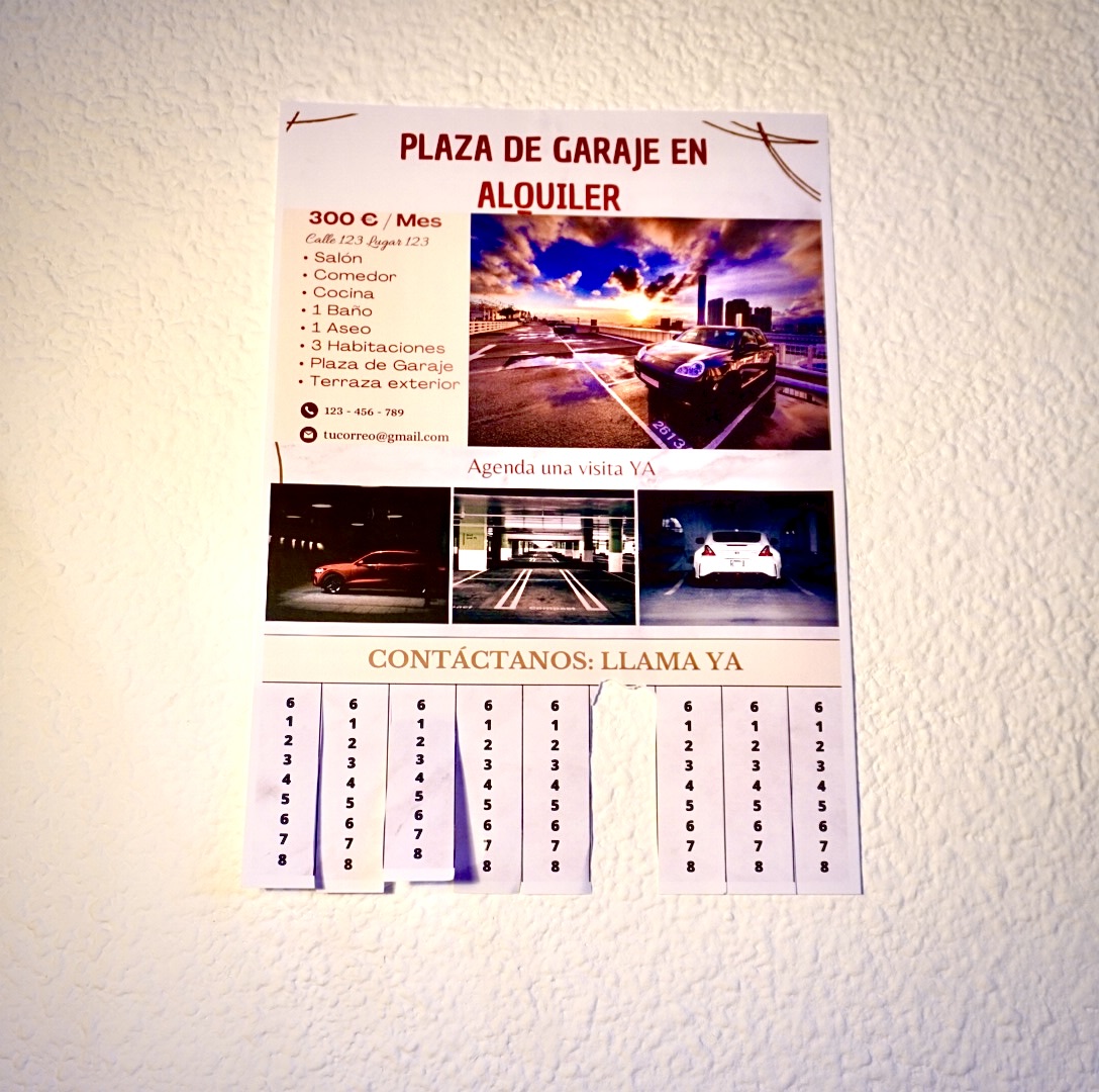 Diseñado para captar rápidamente la atención en portales, ascensores, comunidades, supermercados o universidades. Una solución directa para alquilar tu plaza sin depender de plataformas digitales.