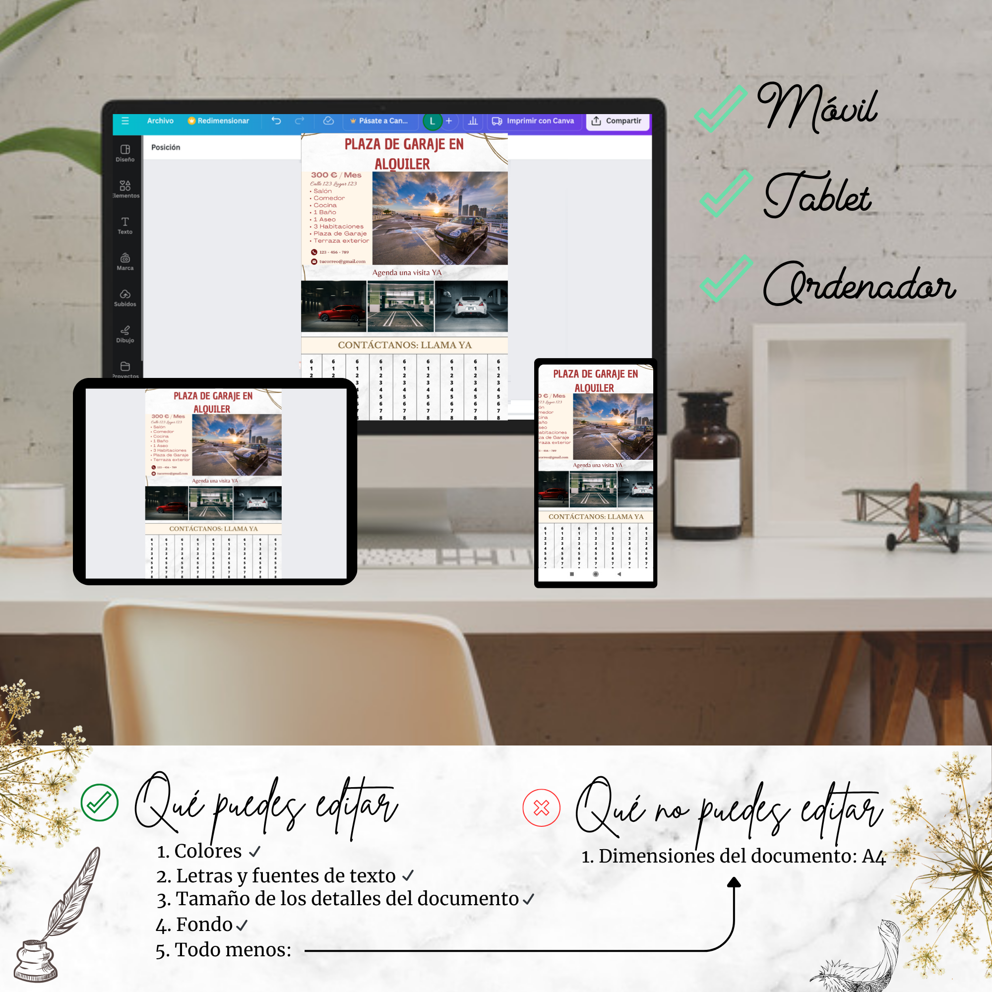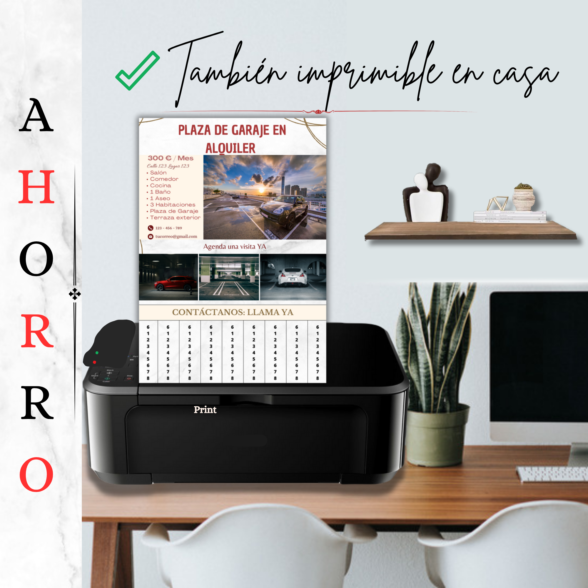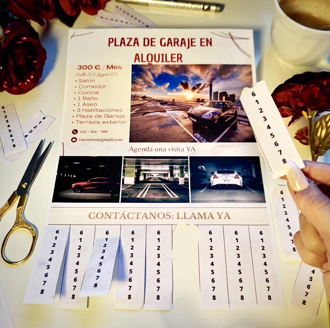 Incluye una franja con varias repeticiones del número de contacto, listas para cortar, permitiendo que los interesados se lleven fácilmente tu teléfono sin afectar la estética del cartel.