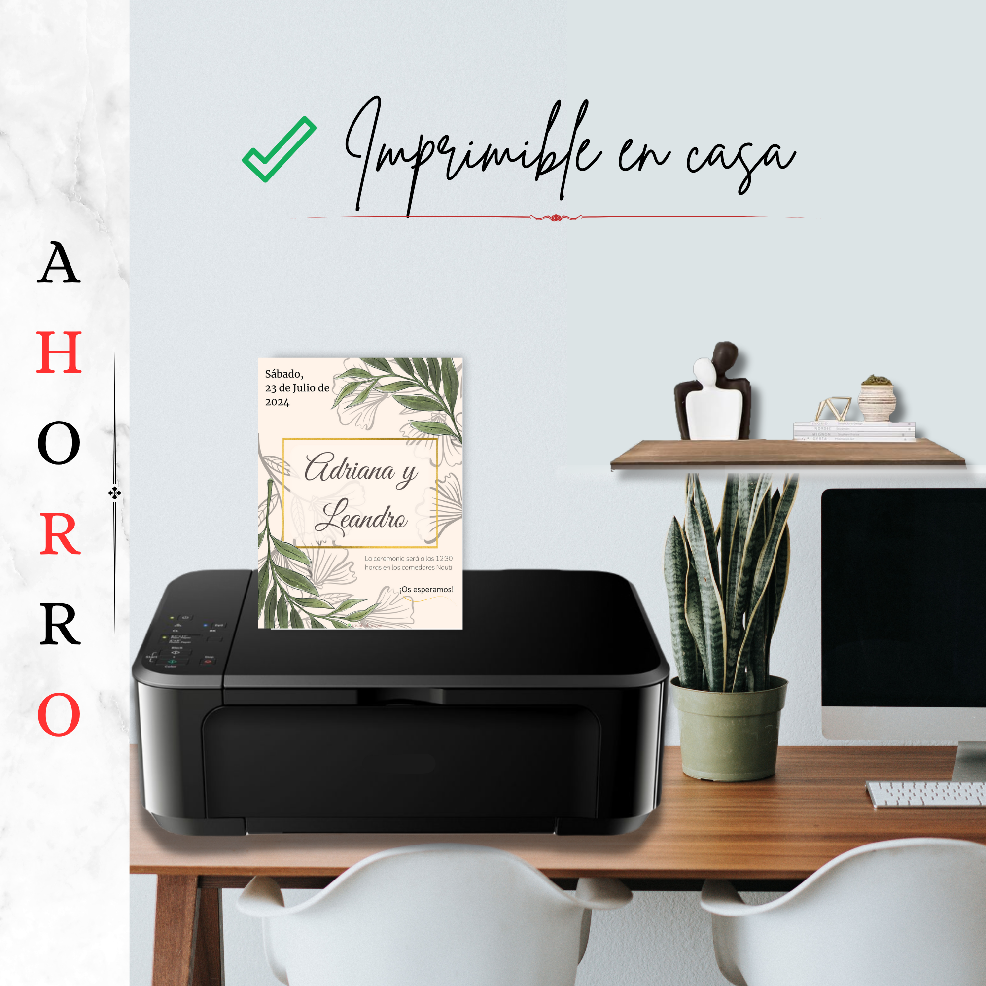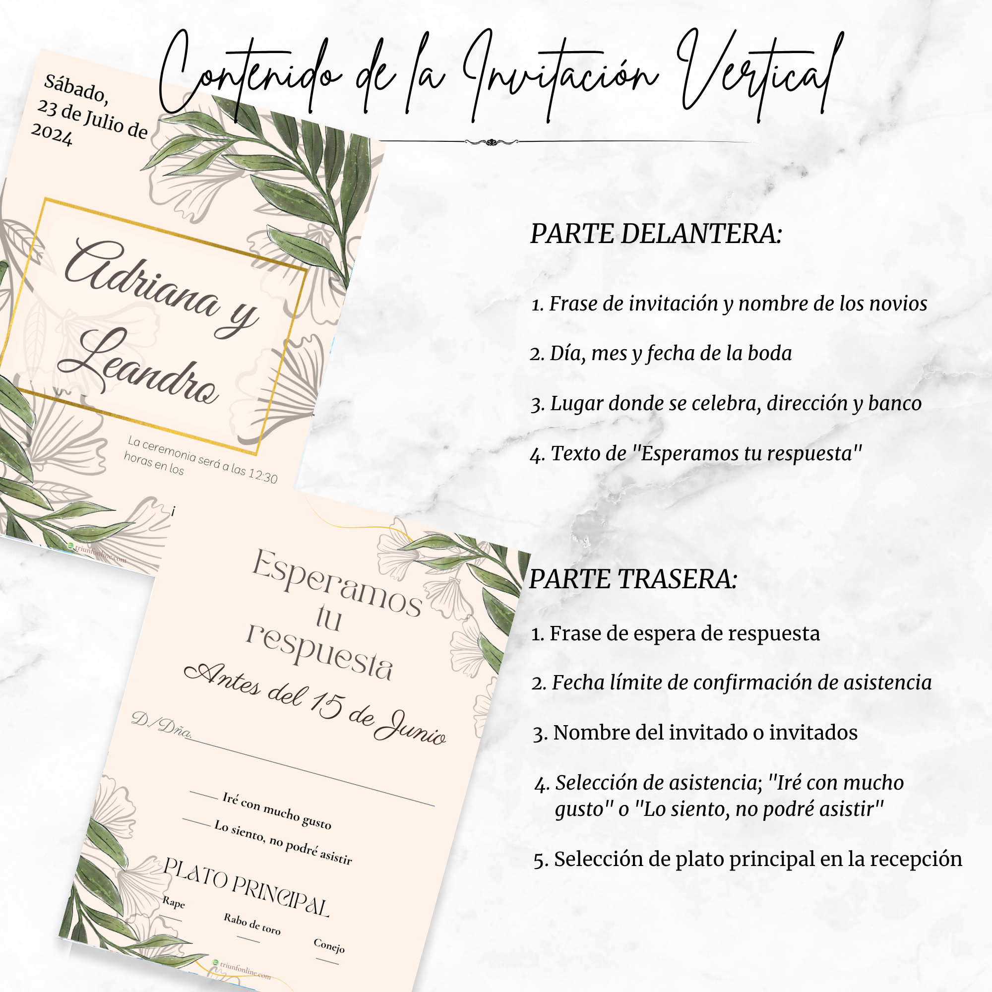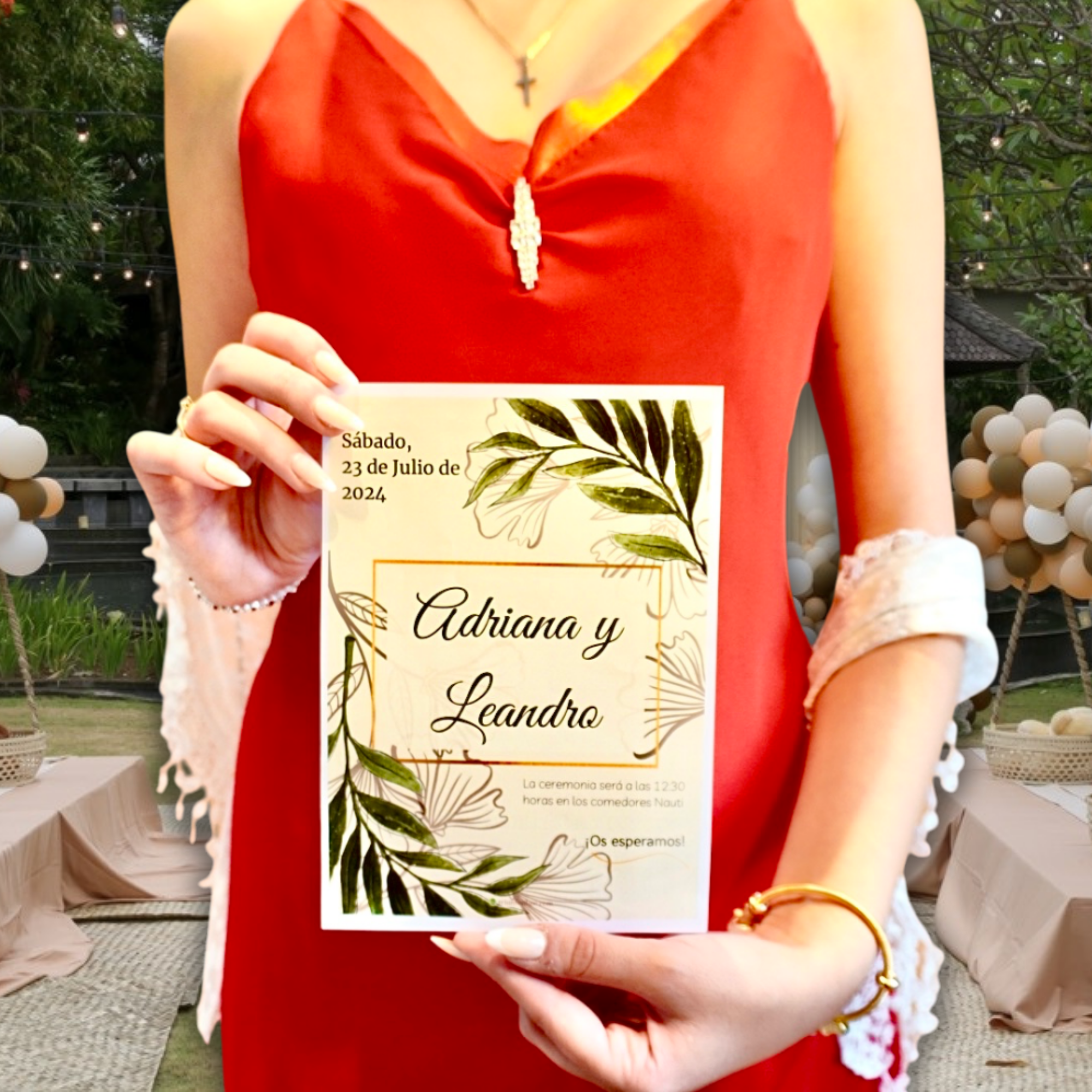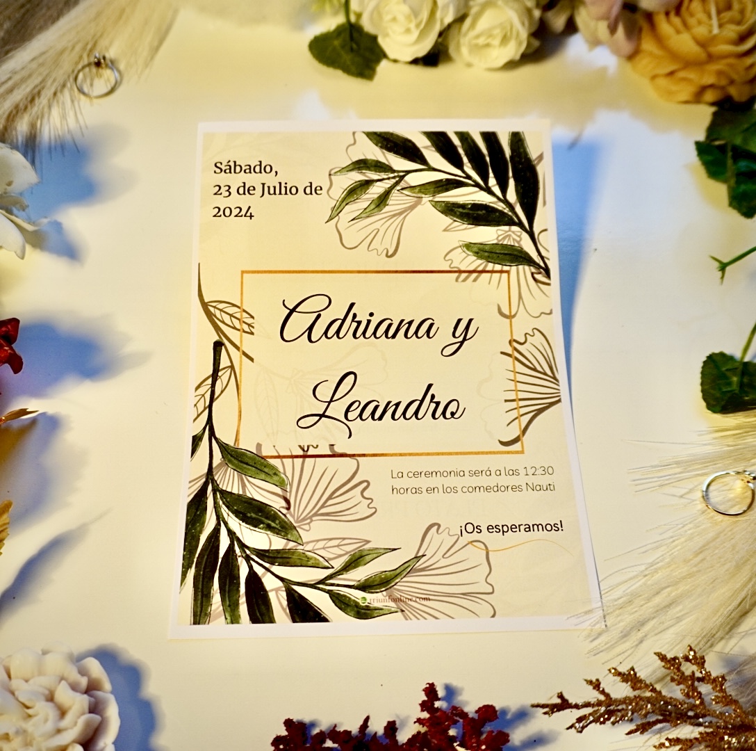 Una propuesta elegante y serena, con un fondo color crema que aporta calidez y sofisticación. Las hojas verdes de gran volumen dan presencia visual, mientras que los detalles en negro equilibran con fuerza y estilo. Perfecta para una boda natural y sobria con un toque moderno.