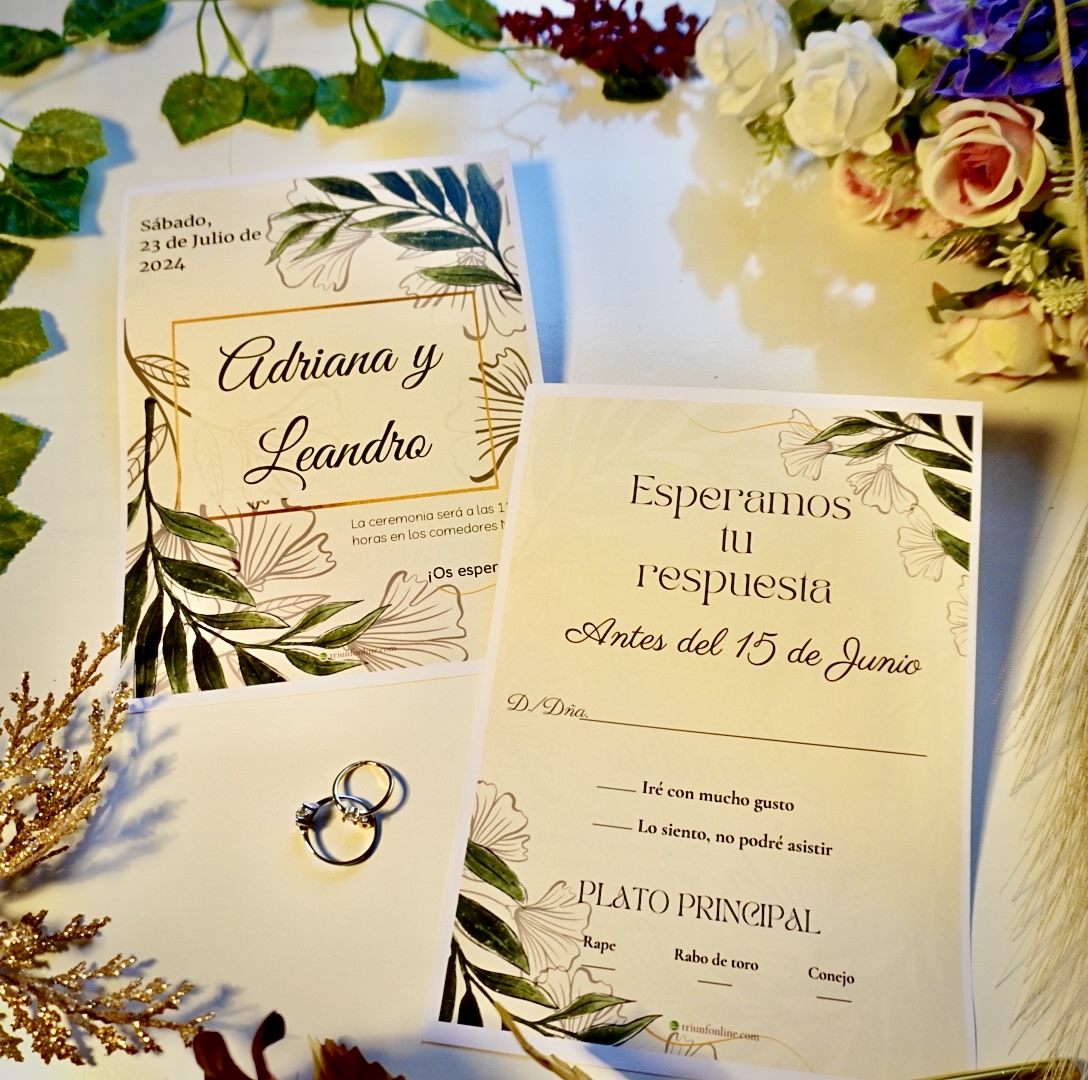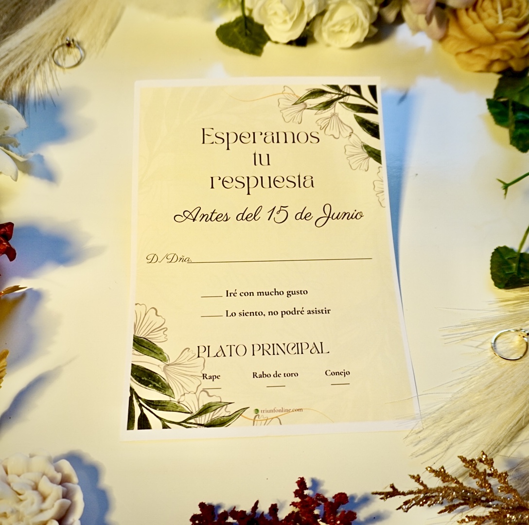 Harás saber a tus familiares, amigos y todos tus invitados el día, fecha, hora y lugar de tu boda. Además de su confirmación de asistencia (respuesta) y preferencia de plato principal de menú.