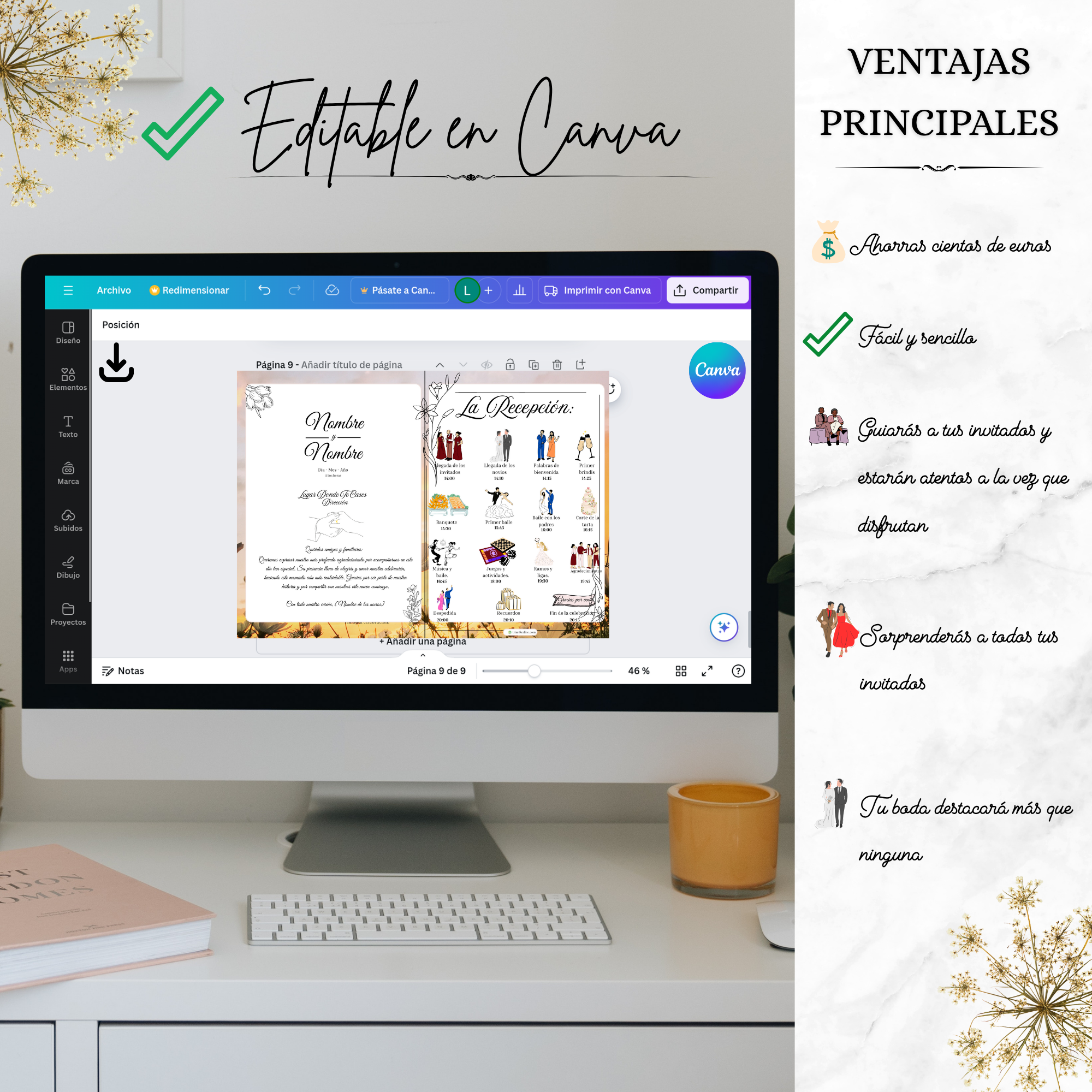 El fondo es una fotografía de un campo cálido lleno de flores, con detalles negros y flores Aesthetic que aportan contraste y elegancia, ideal para bodas con una estética cálida y sofisticada.