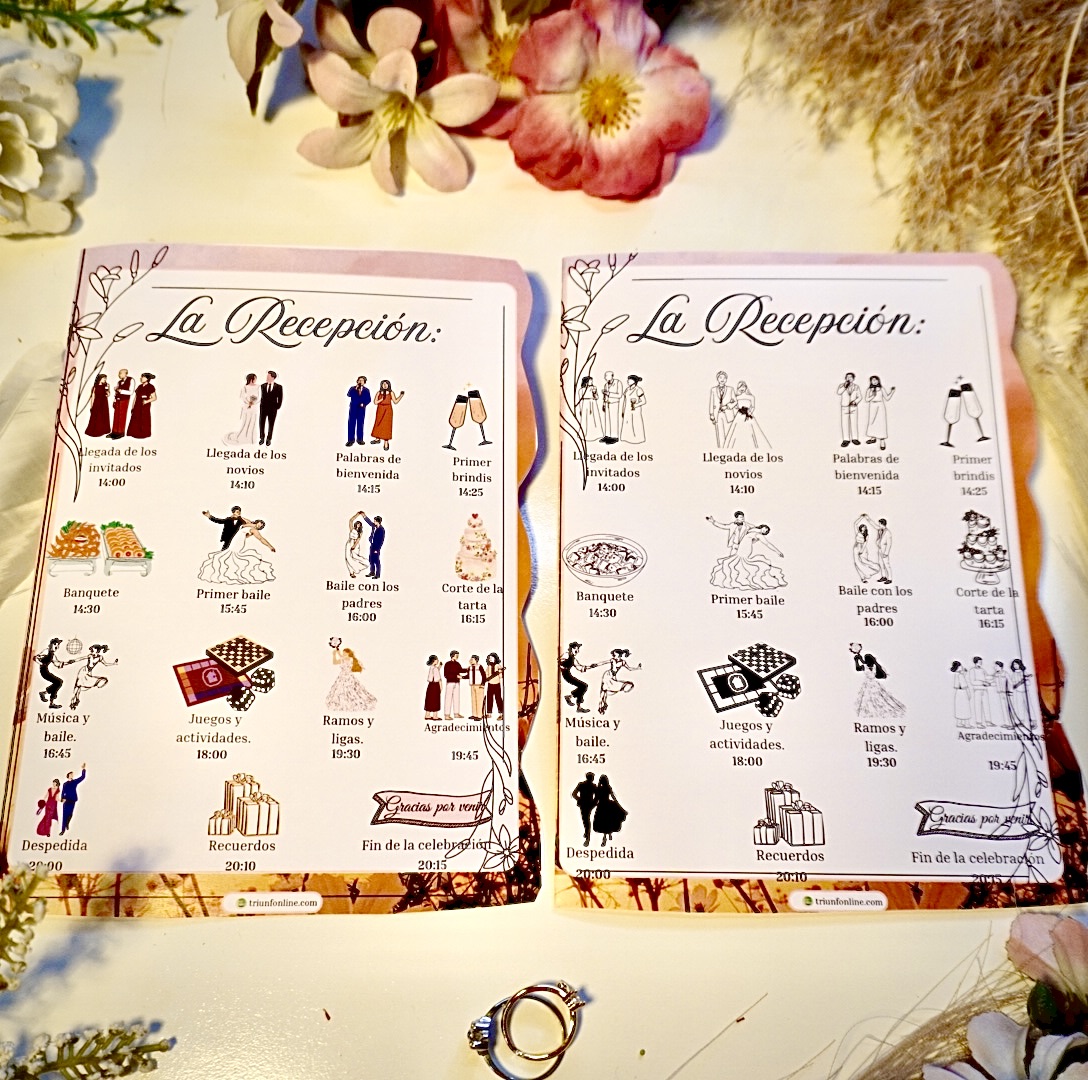Recepción: entrada, brindis, discursos, banquete, corte de tarta, primer baile, fiesta…