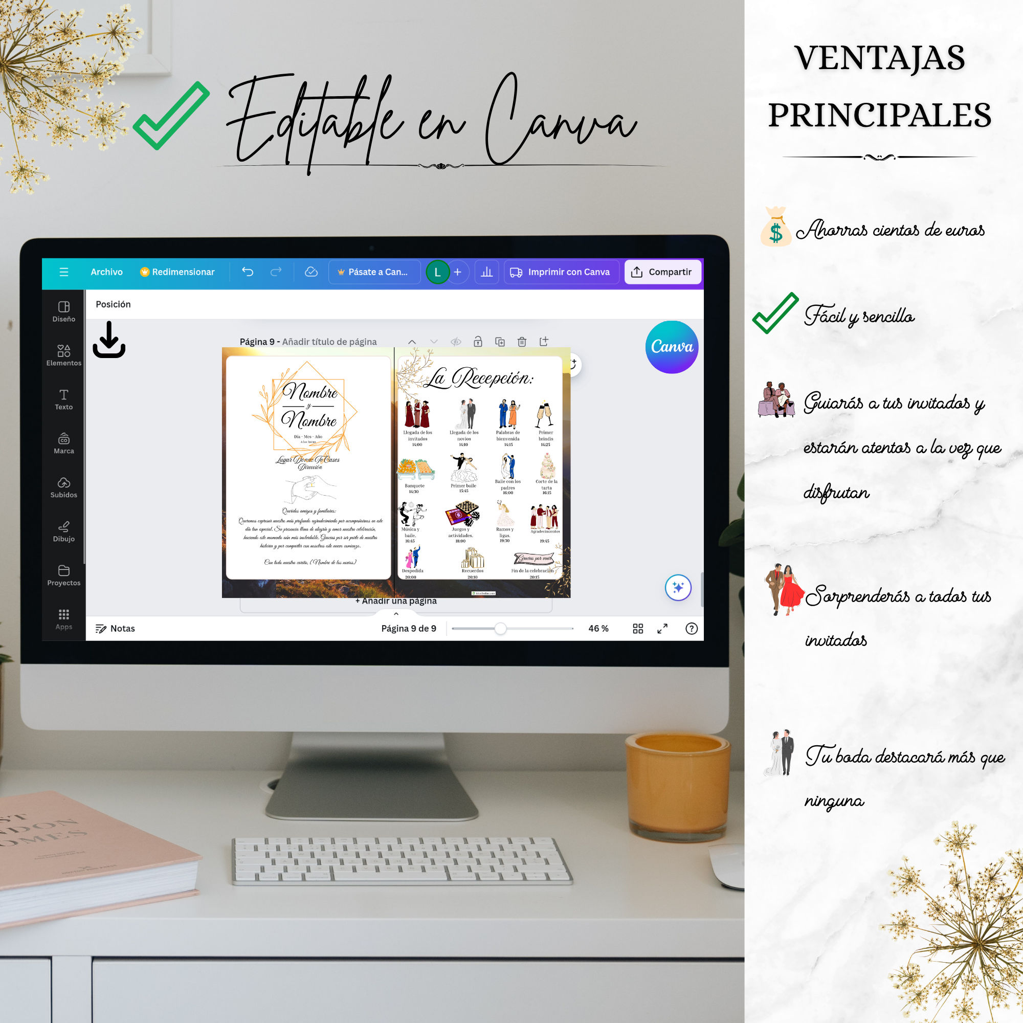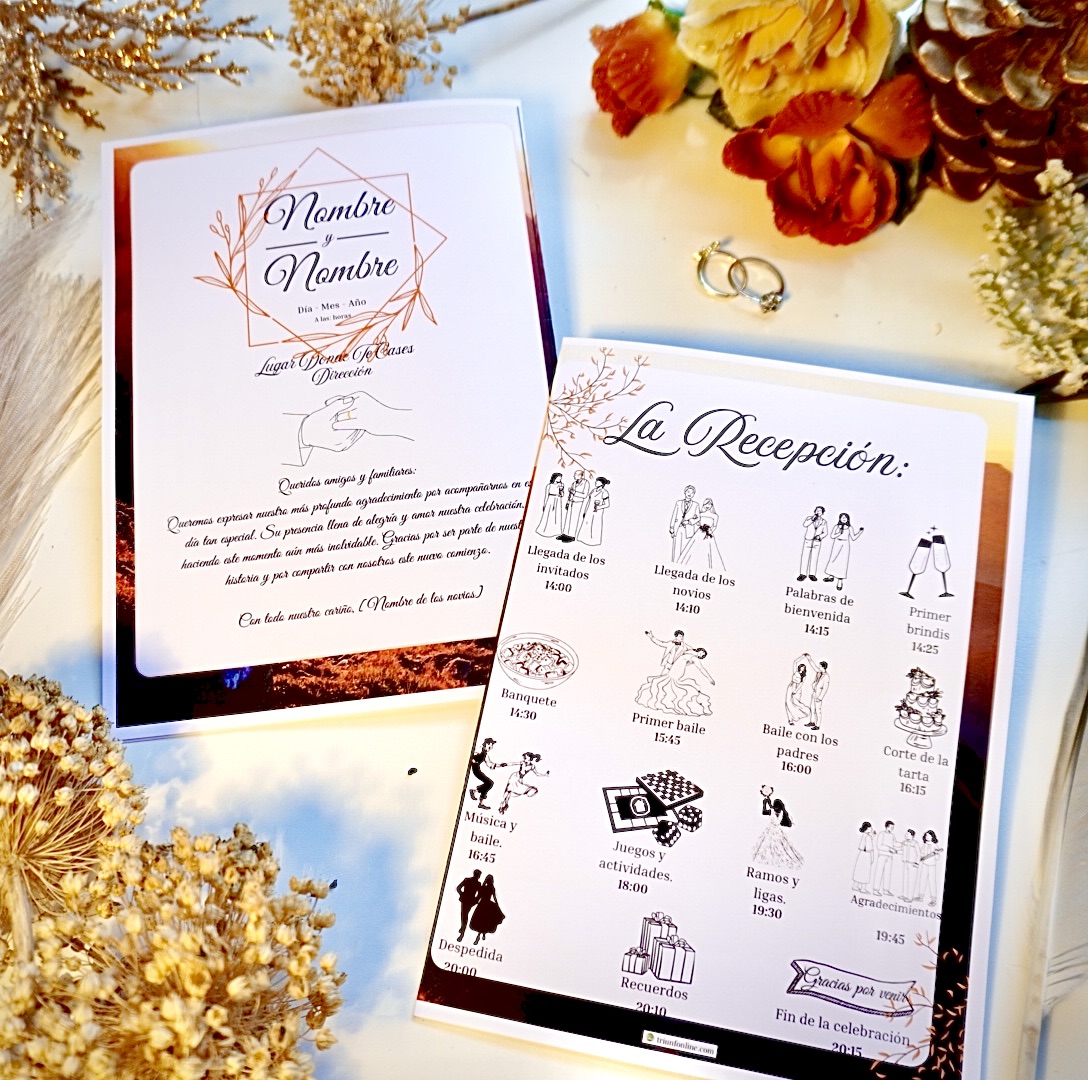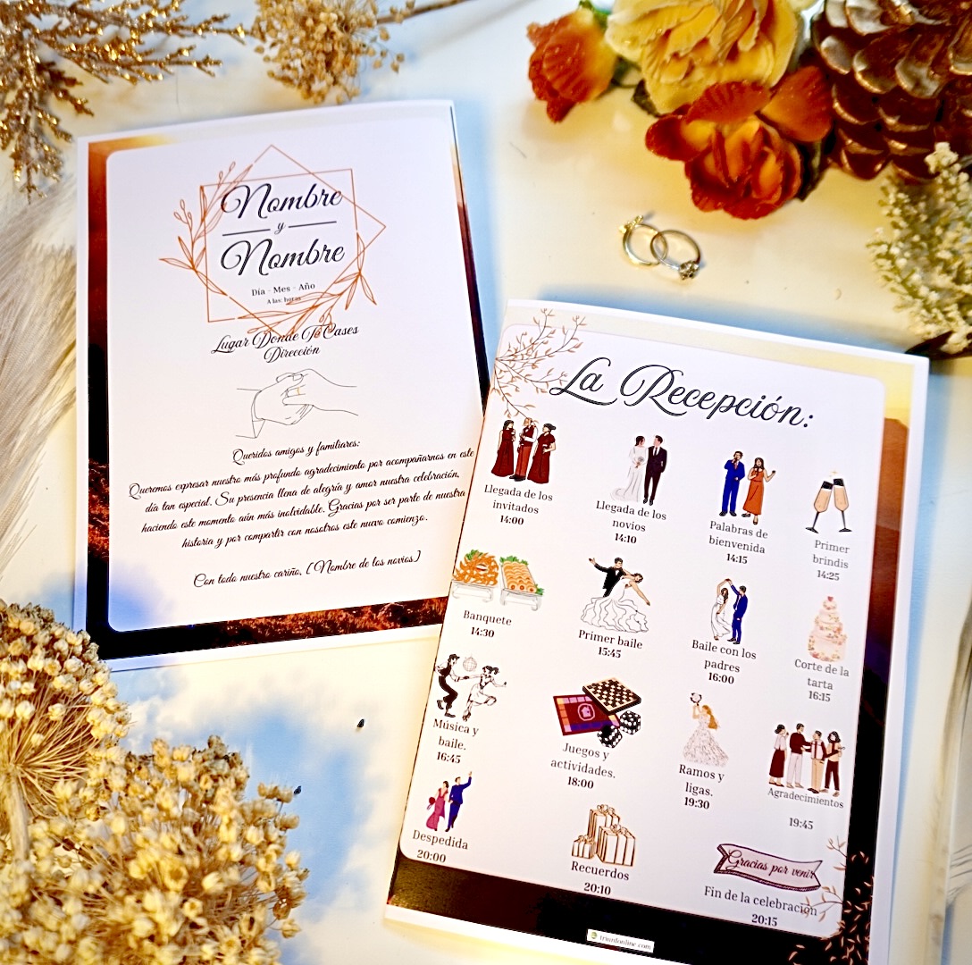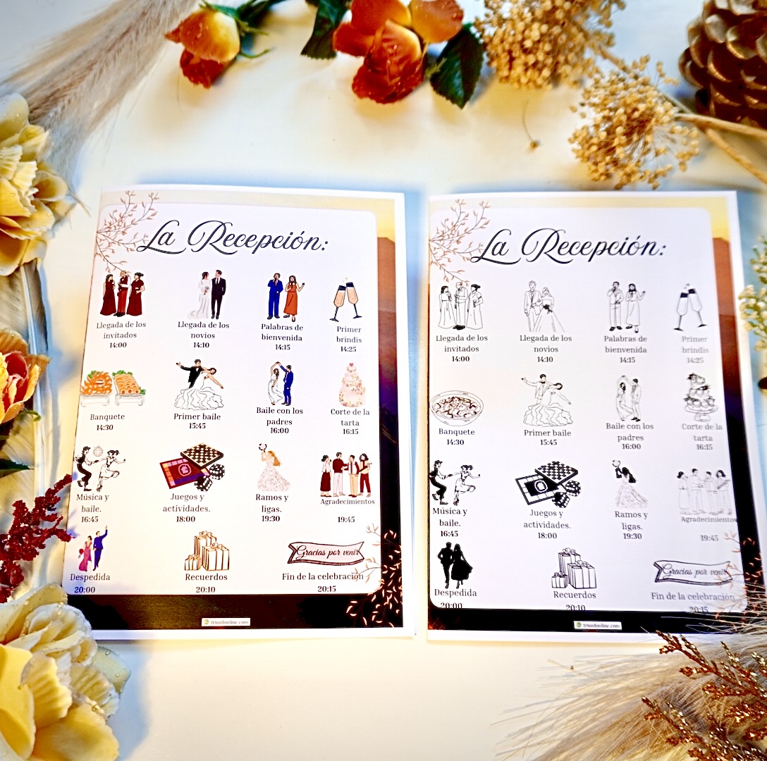 Diseñado para guiar a tus invitados en cada parte de la recepción de forma ordenada y estética. Desde la entrada al banquete hasta el primer baile, todo se muestra con elegancia y coherencia visual.