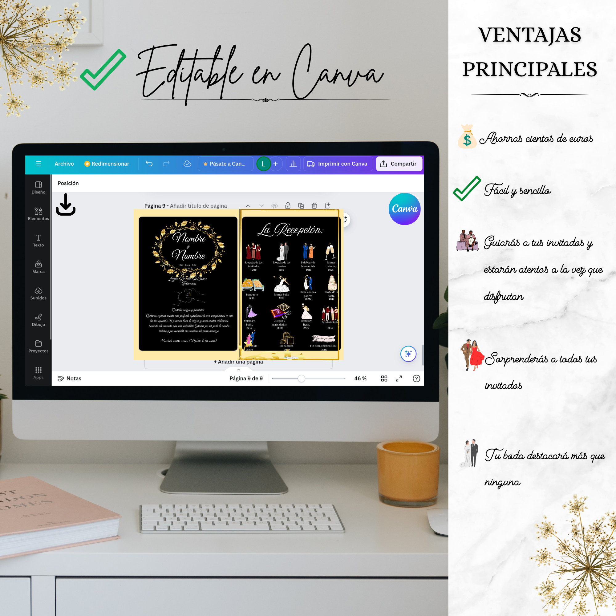 💡 Todo personalizable con nombres, lugar, fecha y los horarios o partes únicas de tu evento. Adáptalo fácilmente a cualquier tipo de celebración.