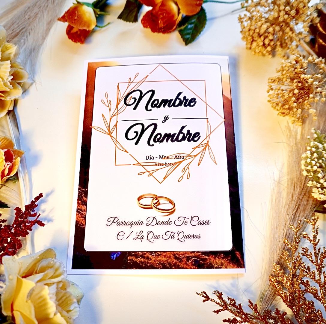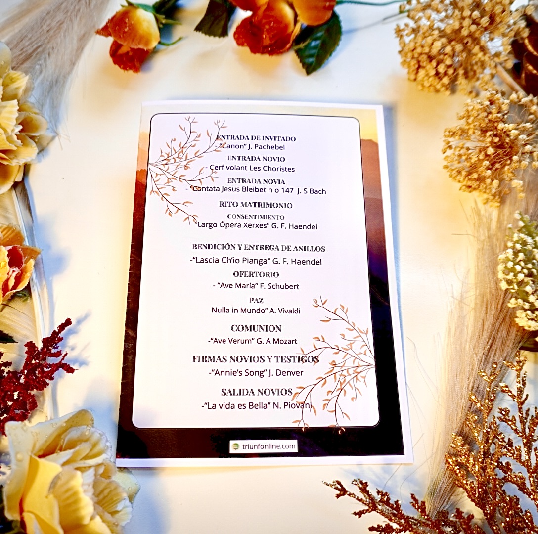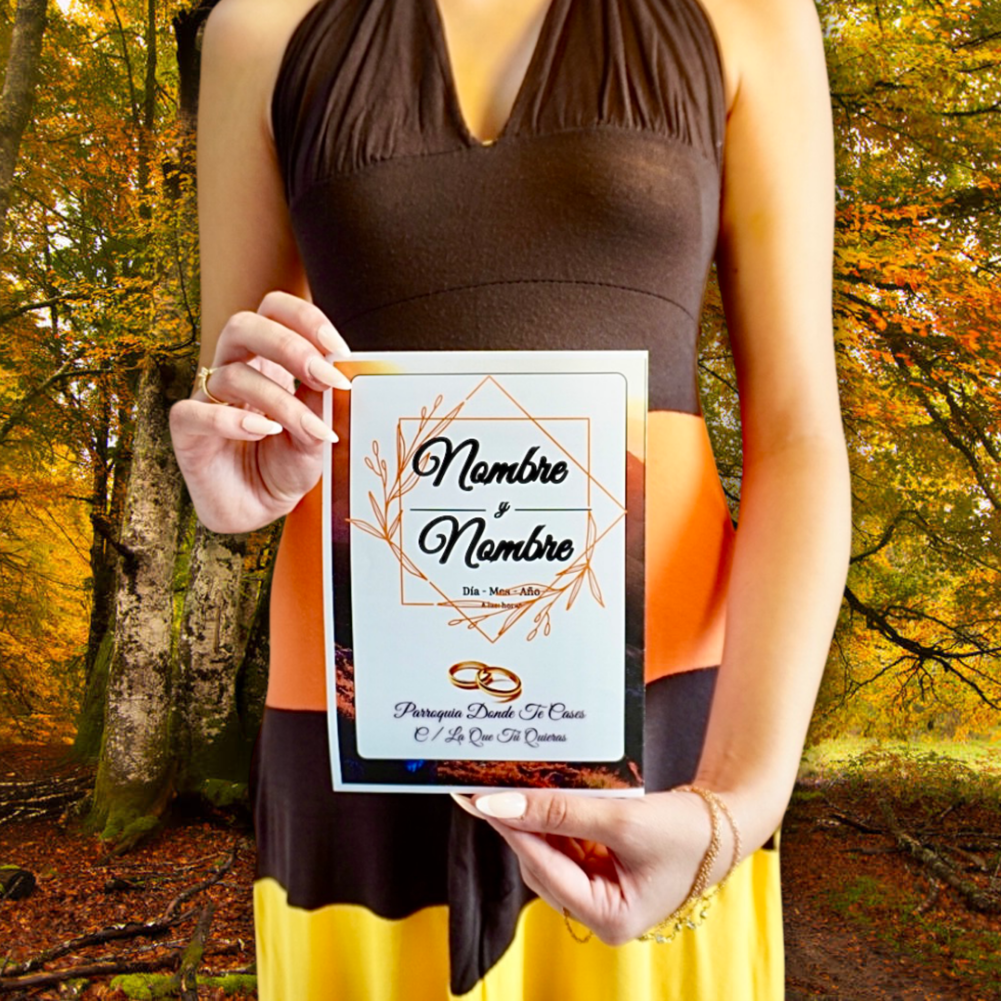Este diseño captura la esencia más auténtica del otoño: un fondo cálido y suave, decorado con hojas y plantas anaranjadas, marrones y terracota que evocan el crujir de las hojas bajo los pies y la calidez de una boda otoñal. Ideal para ceremonias celebradas en el corazón del otoño, rodeadas de naturaleza, fuego lento y ternura.