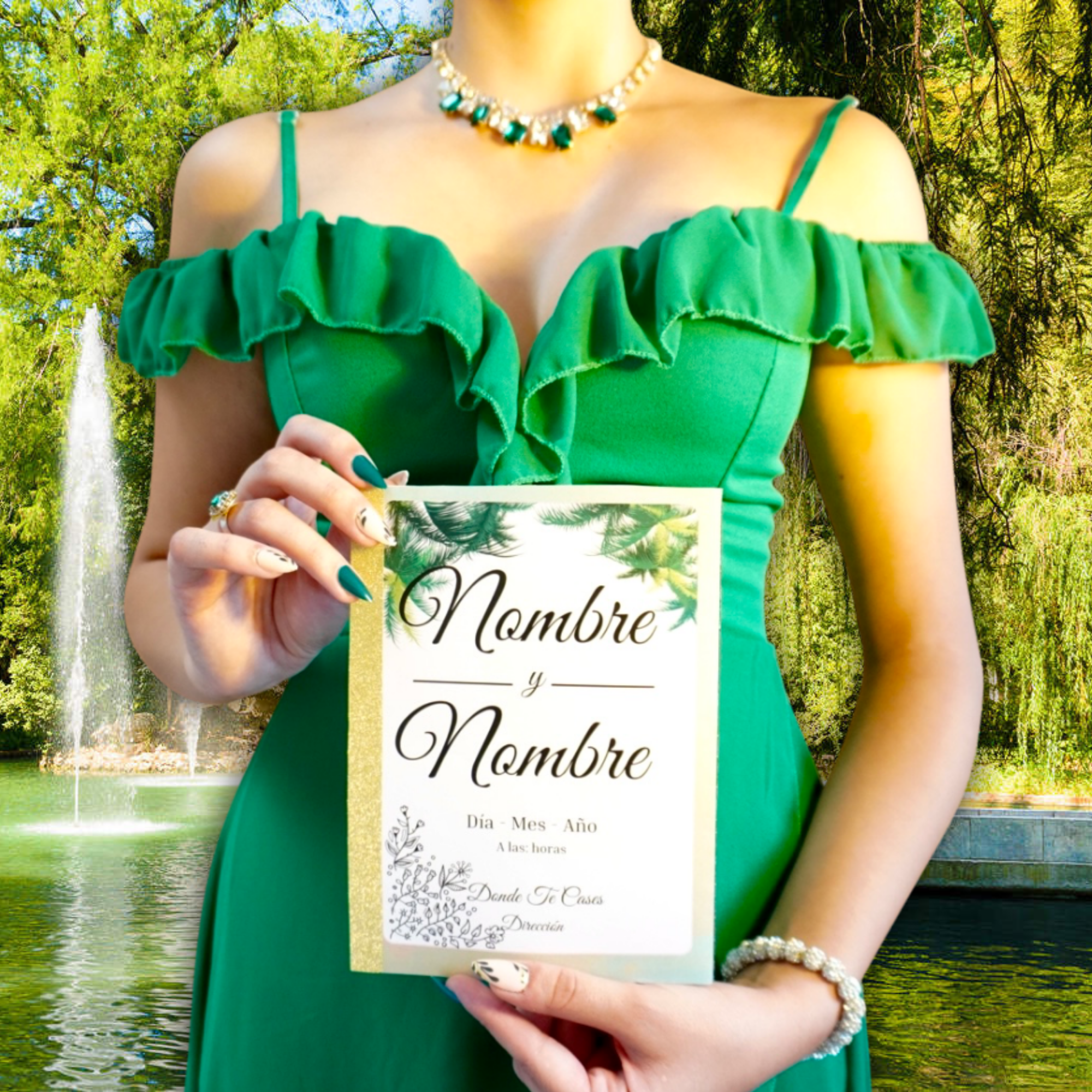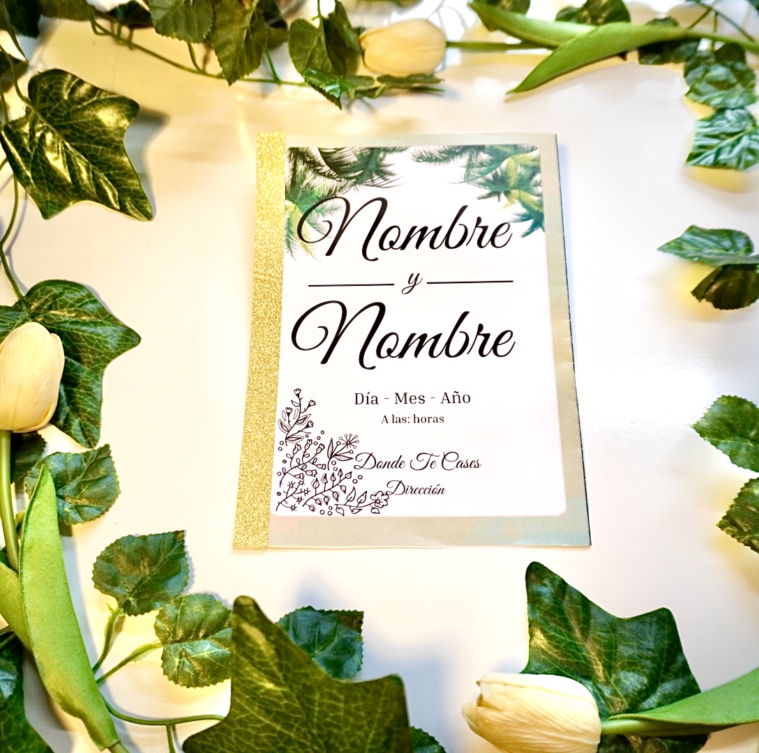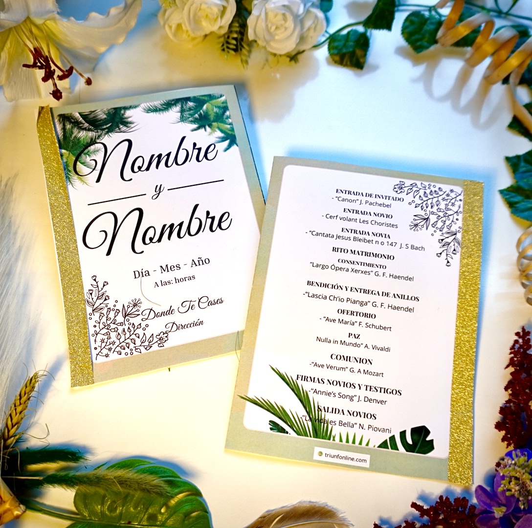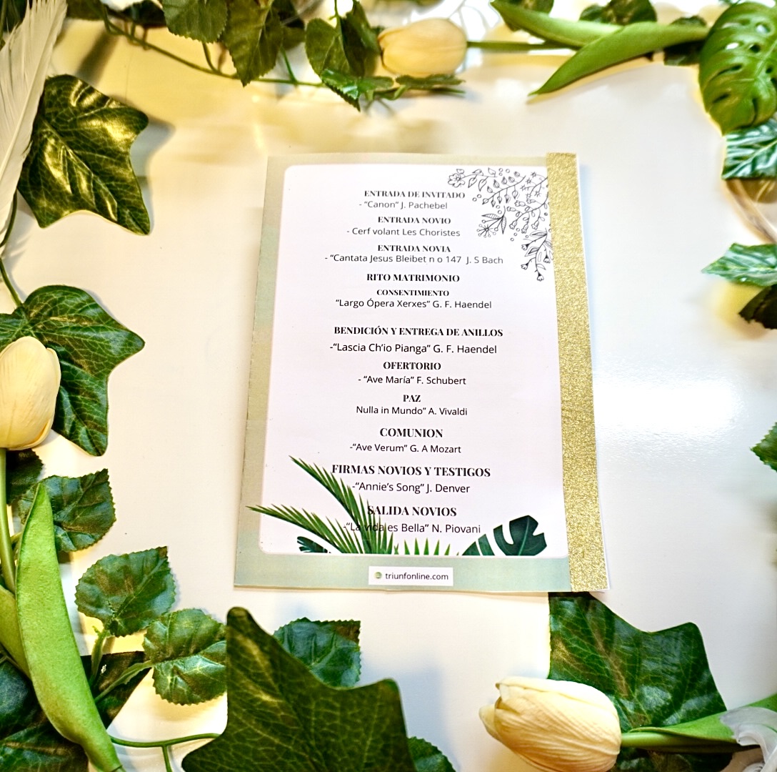Este programa evoca el frescor y la suavidad de una boda junto al mar. Su fondo combina tonos verde pastel y amarillo suave, fusionados de forma armoniosa para crear una atmósfera natural y luminosa. Las ilustraciones de hojas y palmeras le dan un toque tropical, ideal para ceremonias en la playa o entornos cálidos.