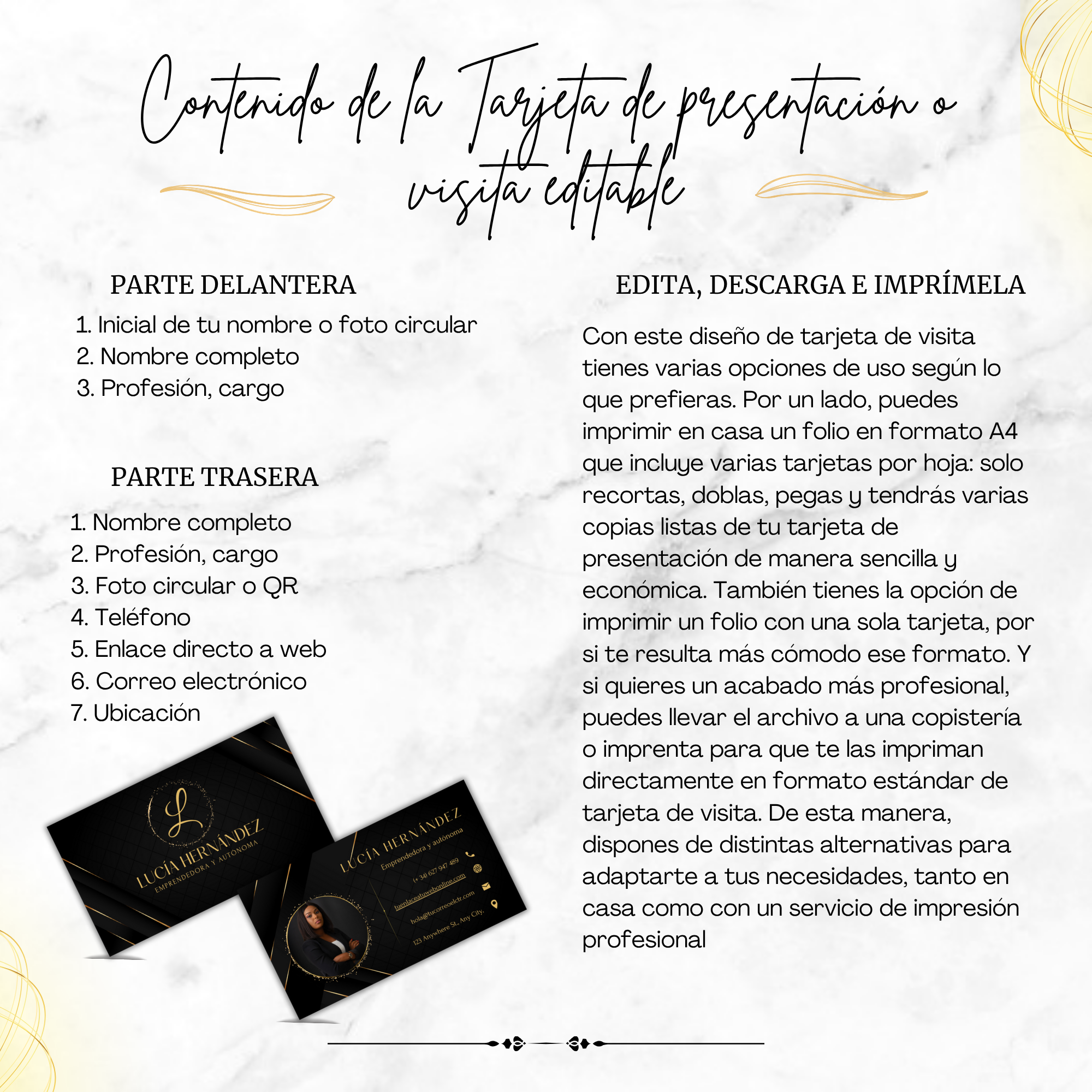 El reverso mantiene la misma estética elegante y añade: