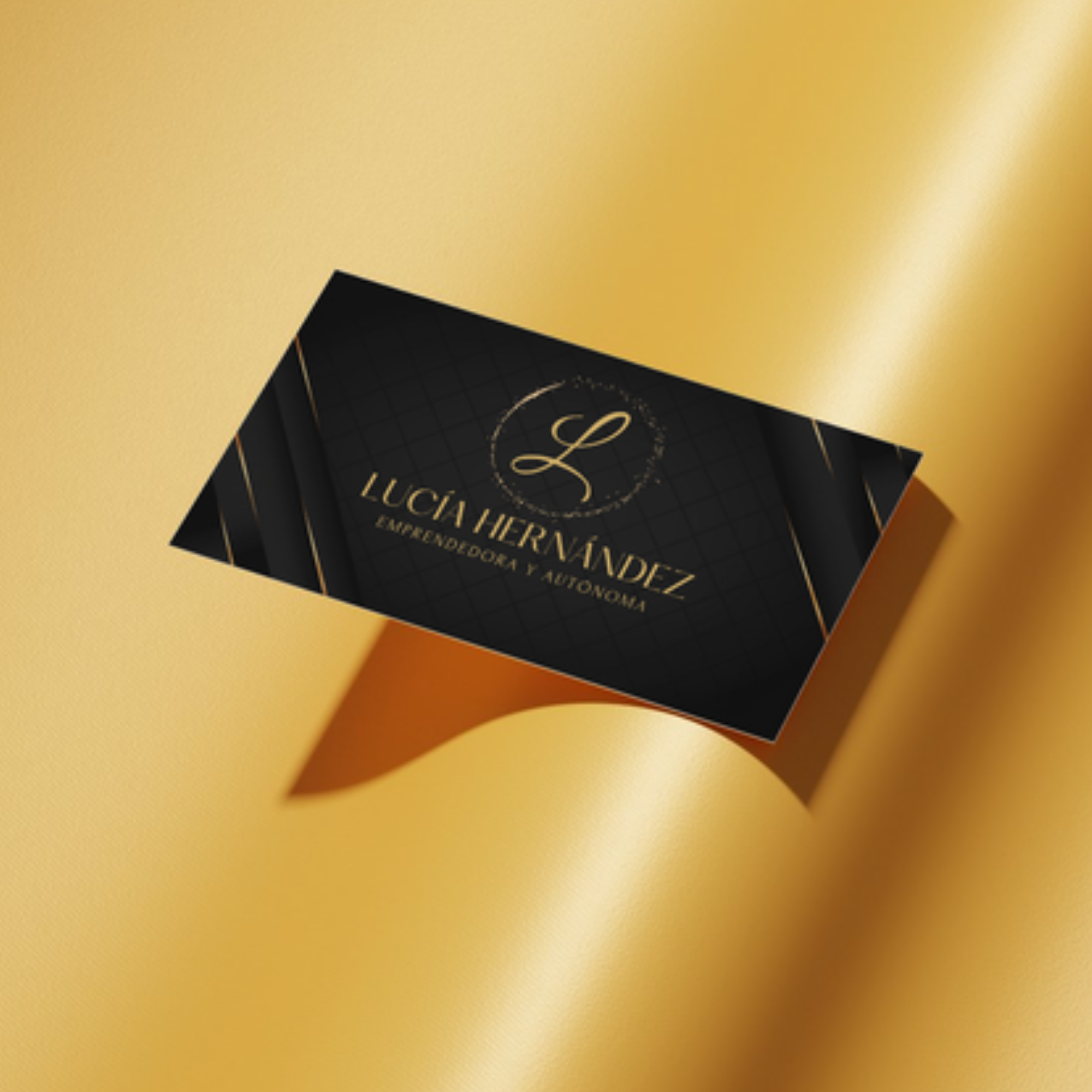 Una tarjeta pensada para quienes desean proyectar autoridad, estilo y confianza. El fondo negro profundo, atravesado por ráfagas doradas, genera un efecto visual dinámico y lujoso. Ideal para emprendedores seguros de sí mismos, con una imagen fuerte y decidida.