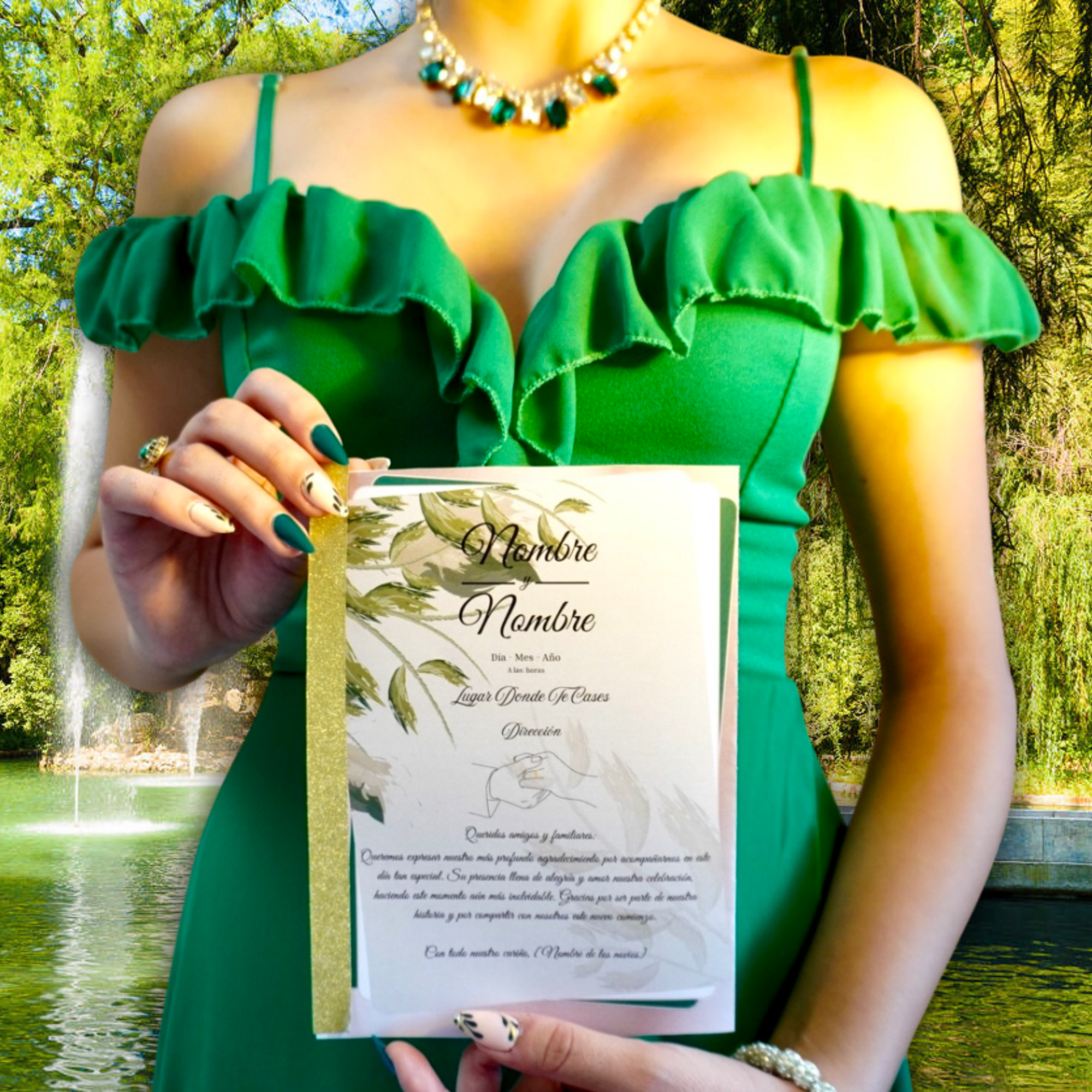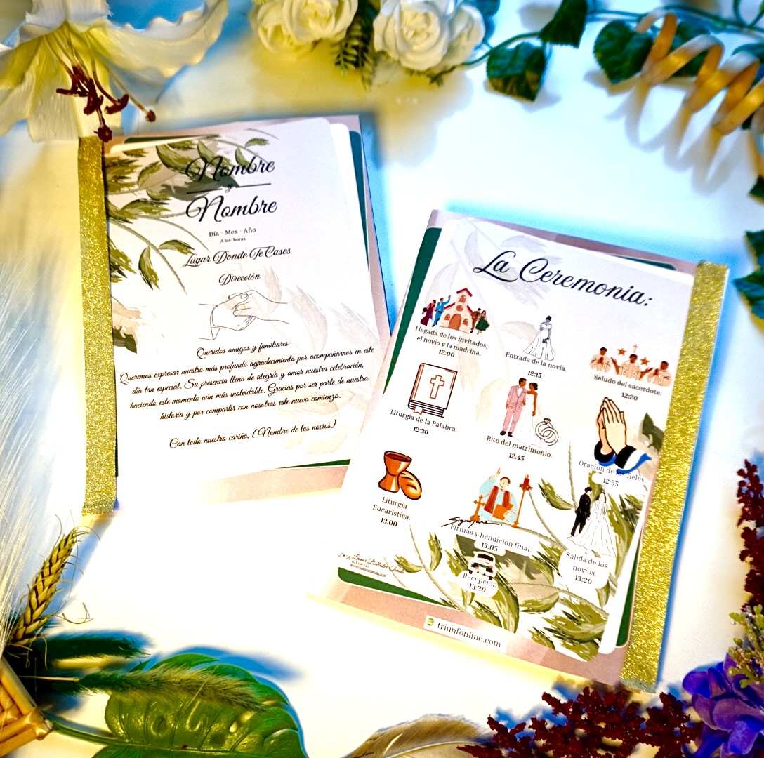 Un diseño elegante y sofisticado para ceremonias naturalistas que buscan un toque de distinción. Esta opción presenta un fondo verde con decoraciones de hojas y una estructura simétrica que da un efecto asimétrico muy atractivo y moderno.