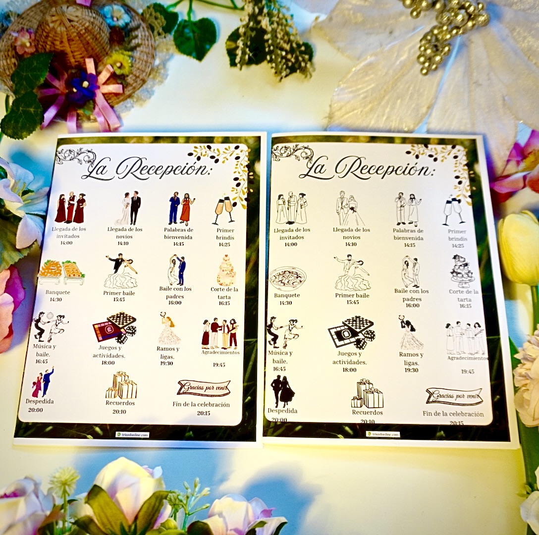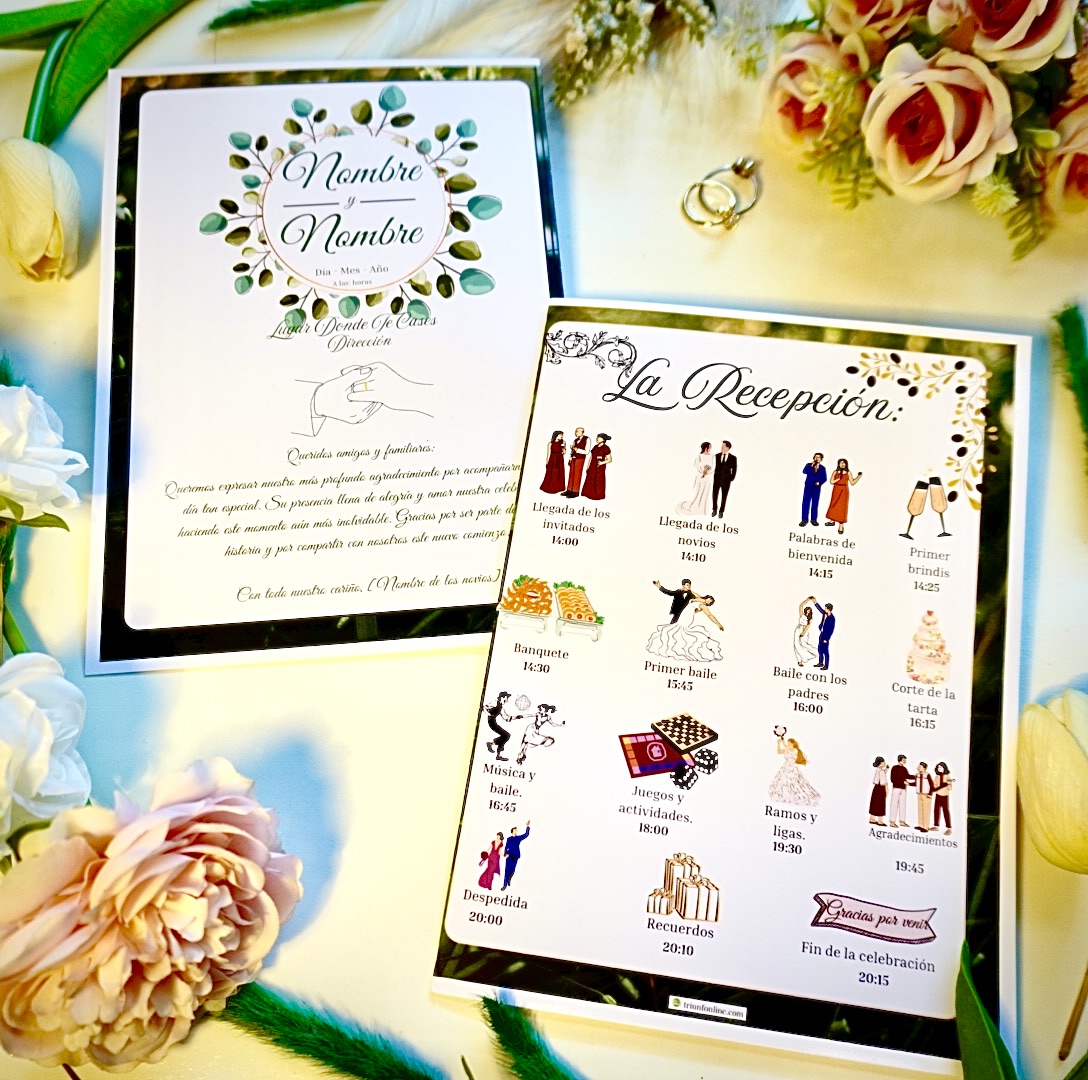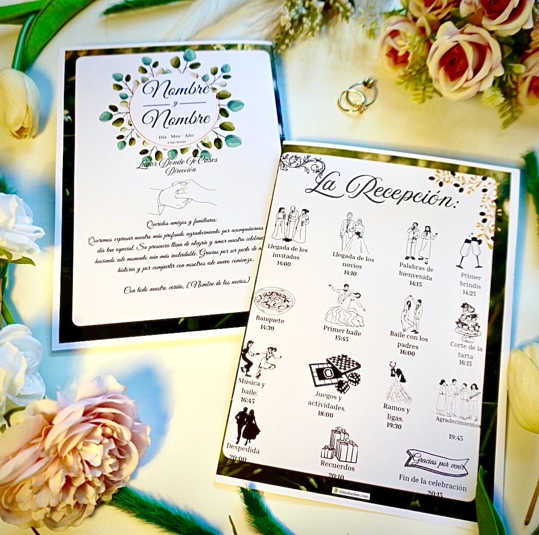 Incluye todos los momentos importantes del evento, con claridad visual y estilo sencillo. Todo lo necesario para acompañar a tus invitados en esta recepción al aire libre o en un entorno natural.