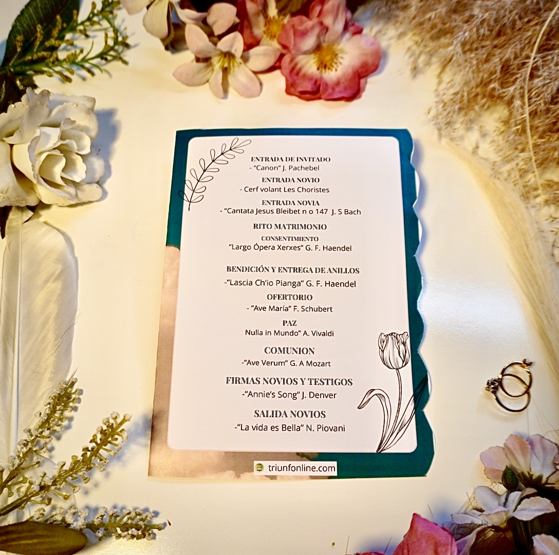 Incluye el repertorio musical completo de la ceremonia y/o la celebración, destacando cada intervención musical.