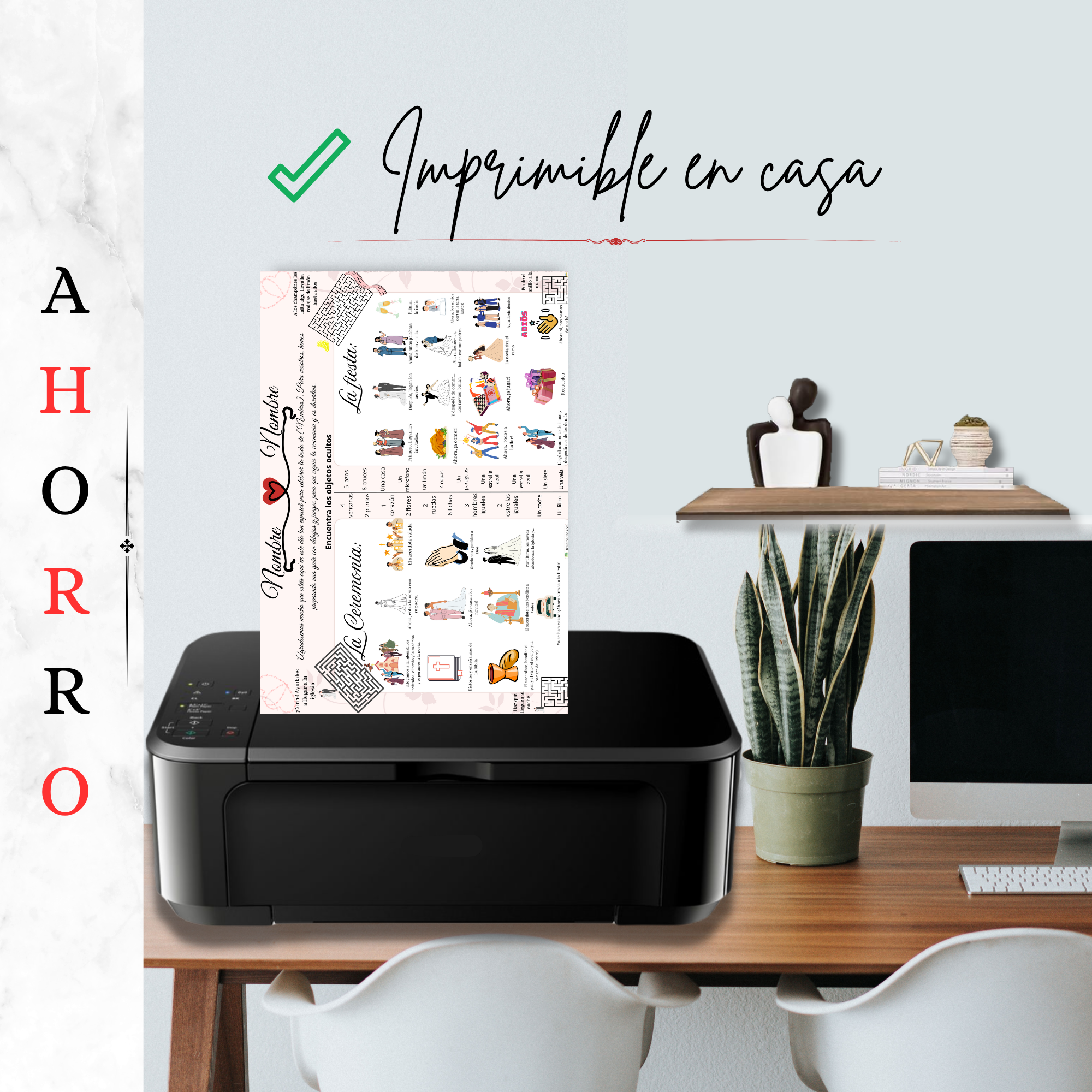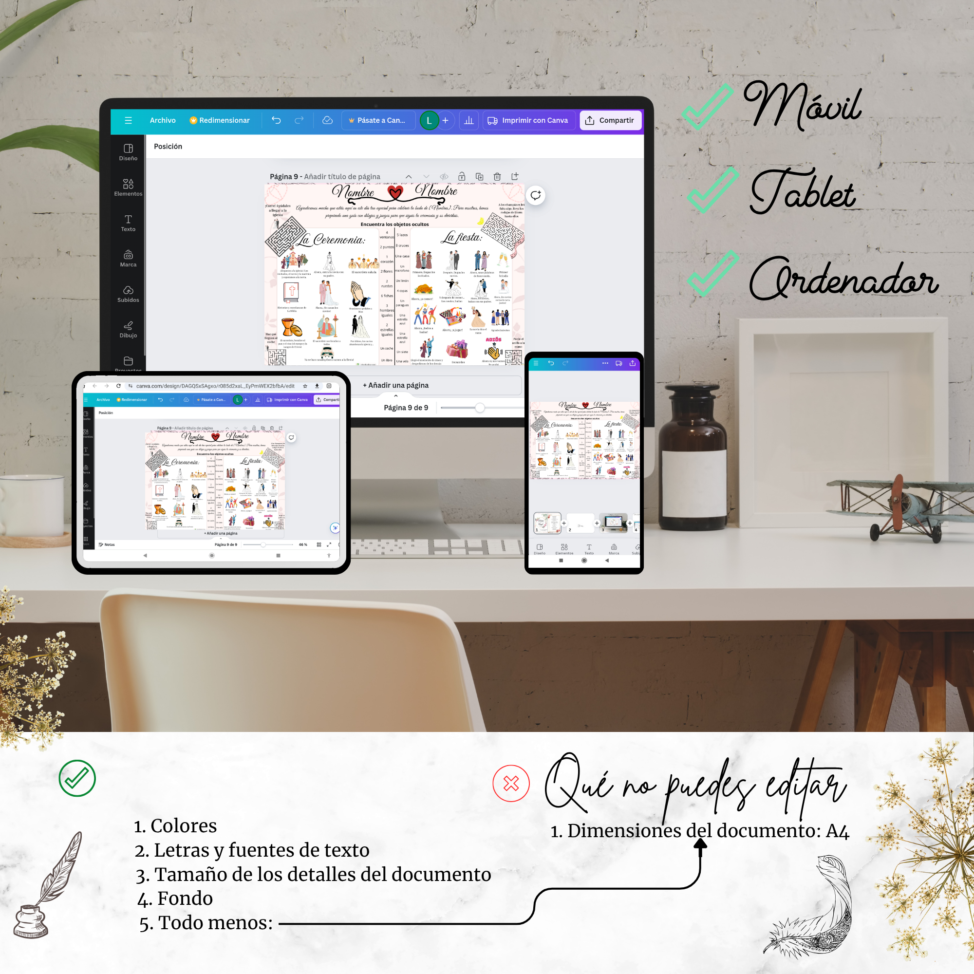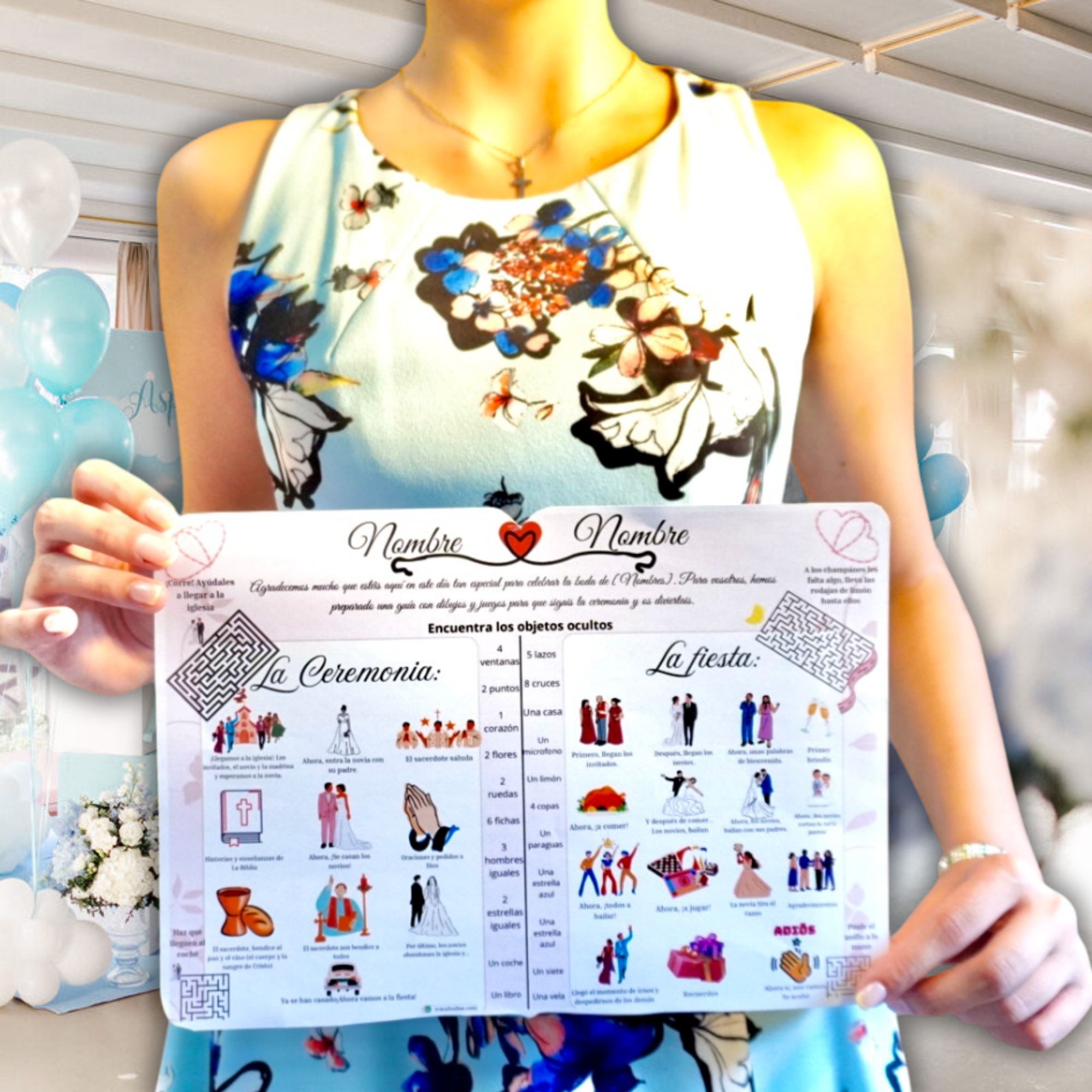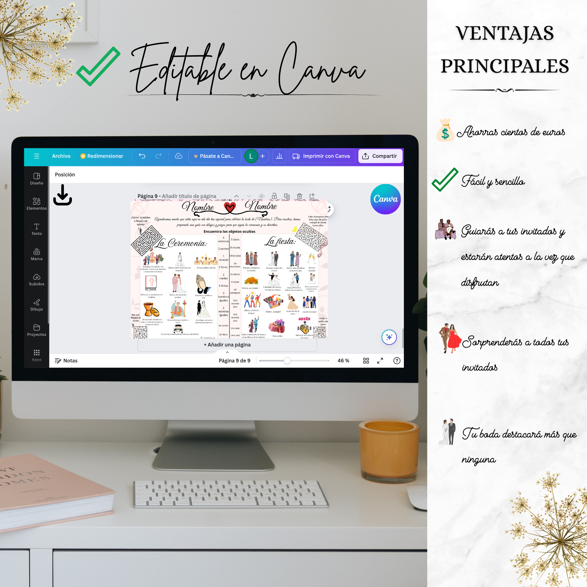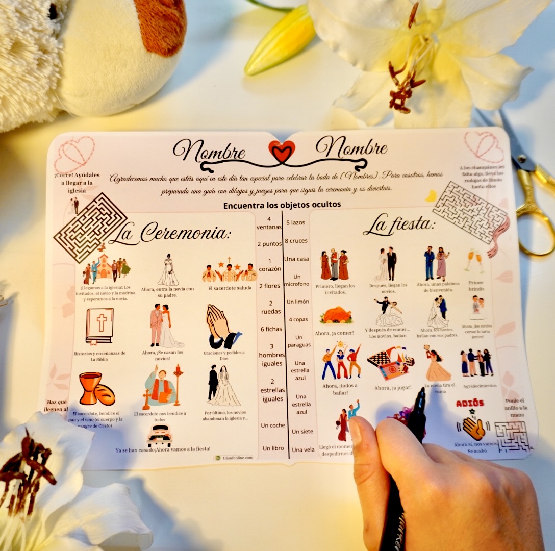 📥 Entrega digital editable, con los nombres, fecha y lugar de la boda, y los dibujos y juegos adaptados a vuestra celebración.