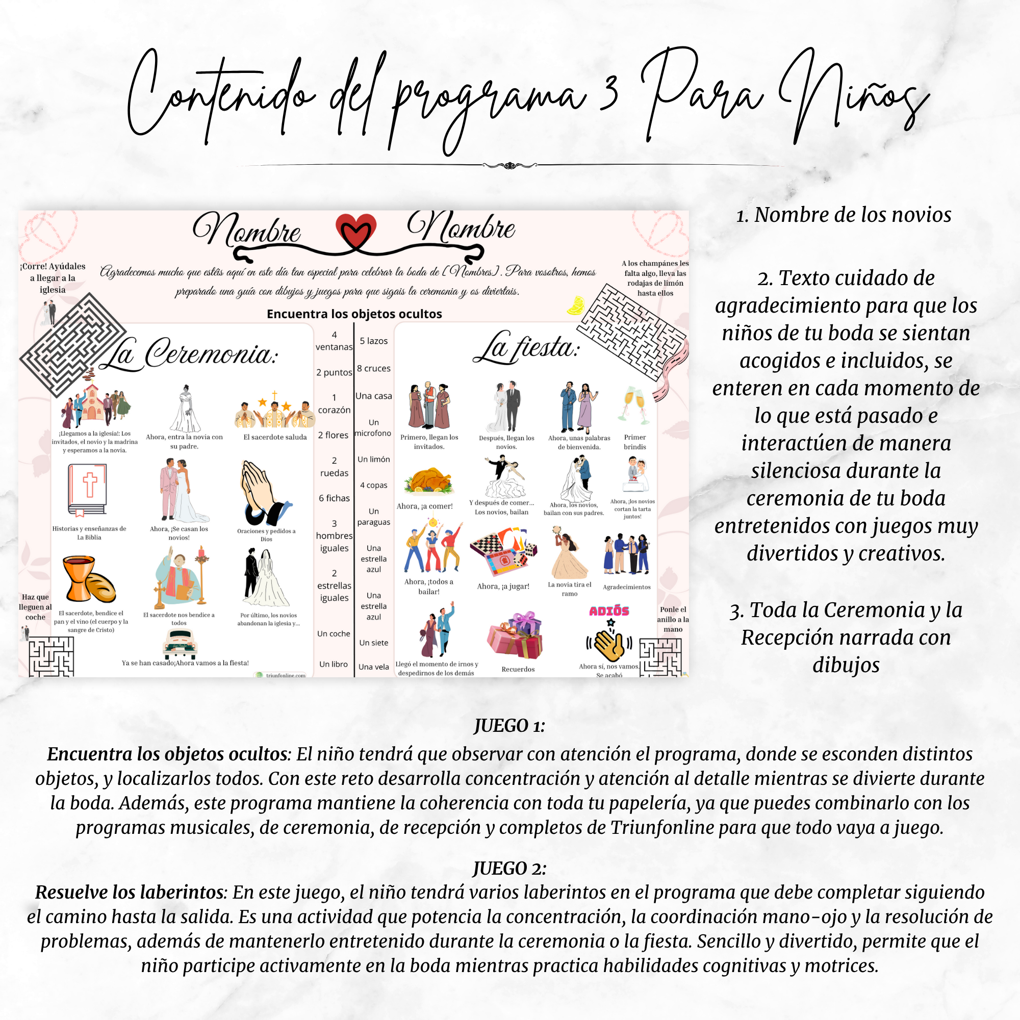 Este programa ha sido diseñado con mimo para que los niños disfruten de la boda entendiendo cada momento y participando de forma divertida y tranquila. Combina ilustraciones a todo color, explicaciones sencillas de la ceremonia y la recepción, y juegos visuales para mantenerlos entretenidos… ¡sin perderse nada!