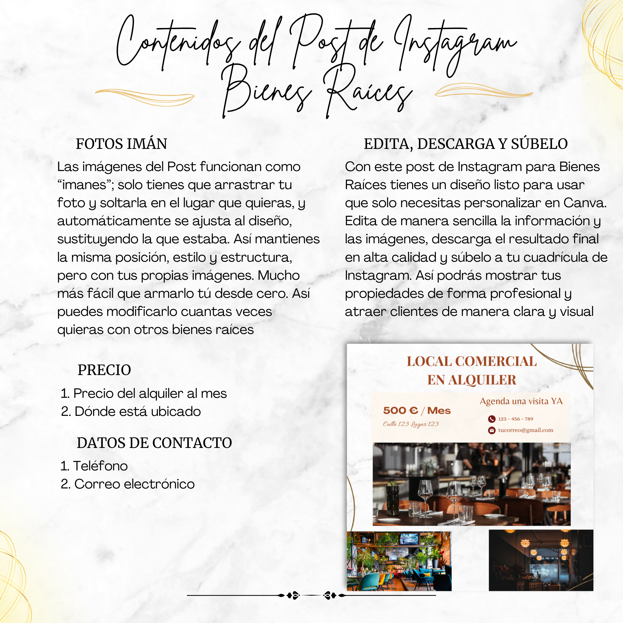 Puedes cambiar las imágenes de muestra por fotos reales del local, mostrando su distribución, entrada, interior y fachada. Una presentación auténtica genera confianza y mejora la conversión.