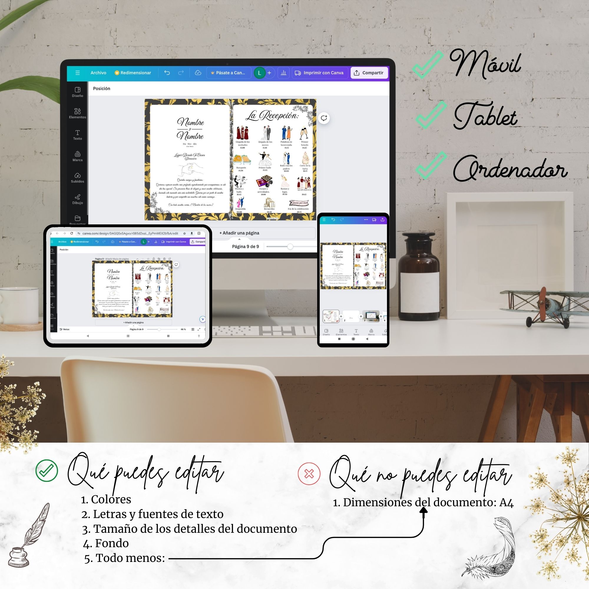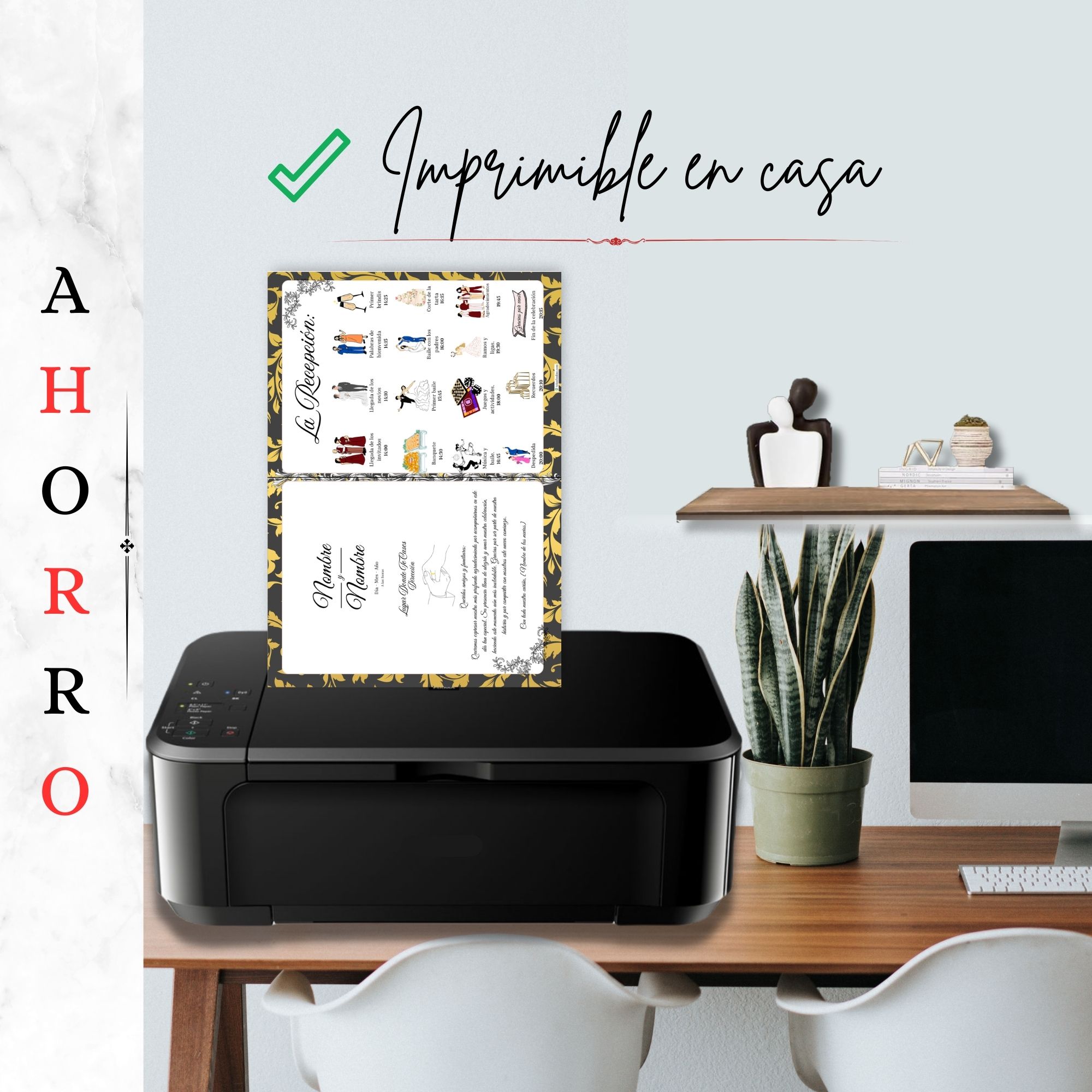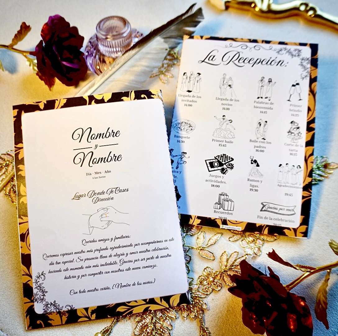 Fondo negro profundo con hojas doradas y detalles gris oscuro. Ideal para recepciones nocturnas, sofisticadas y teatrales. Los nombres de la pareja en mayúsculas añaden solemnidad y protagonismo.
