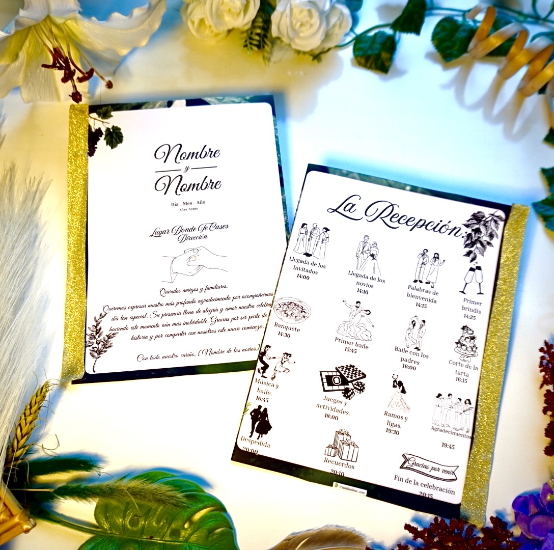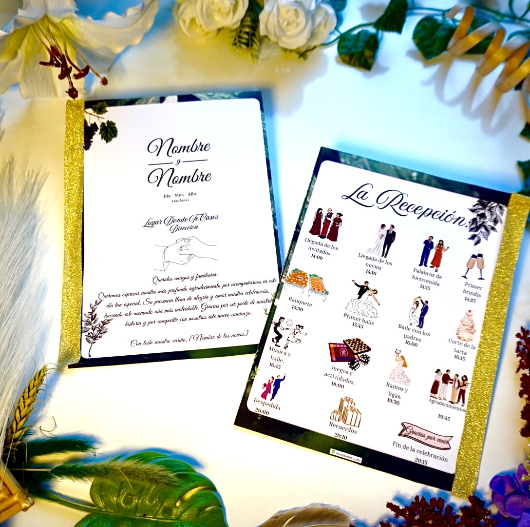 💡 Todo personalizable con nombres, lugar, fecha y los horarios o partes únicas de tu evento. Adáptalo fácilmente a cualquier tipo de celebración.