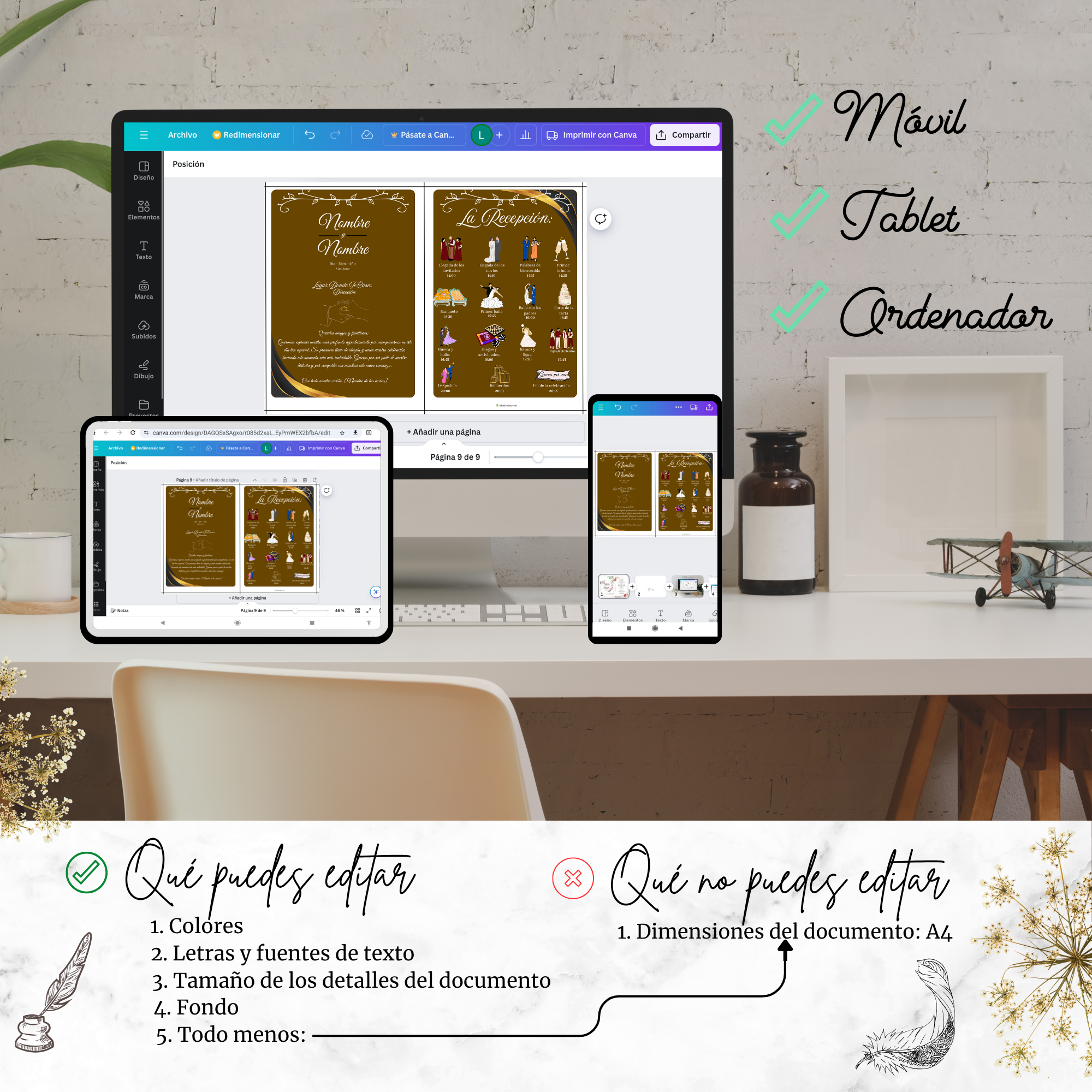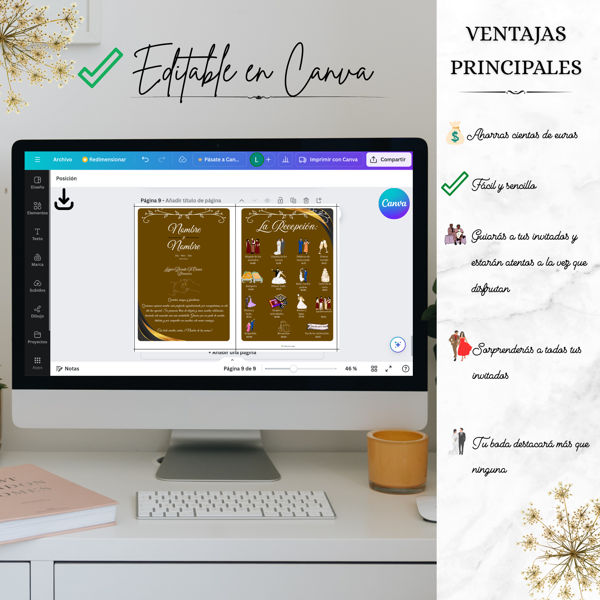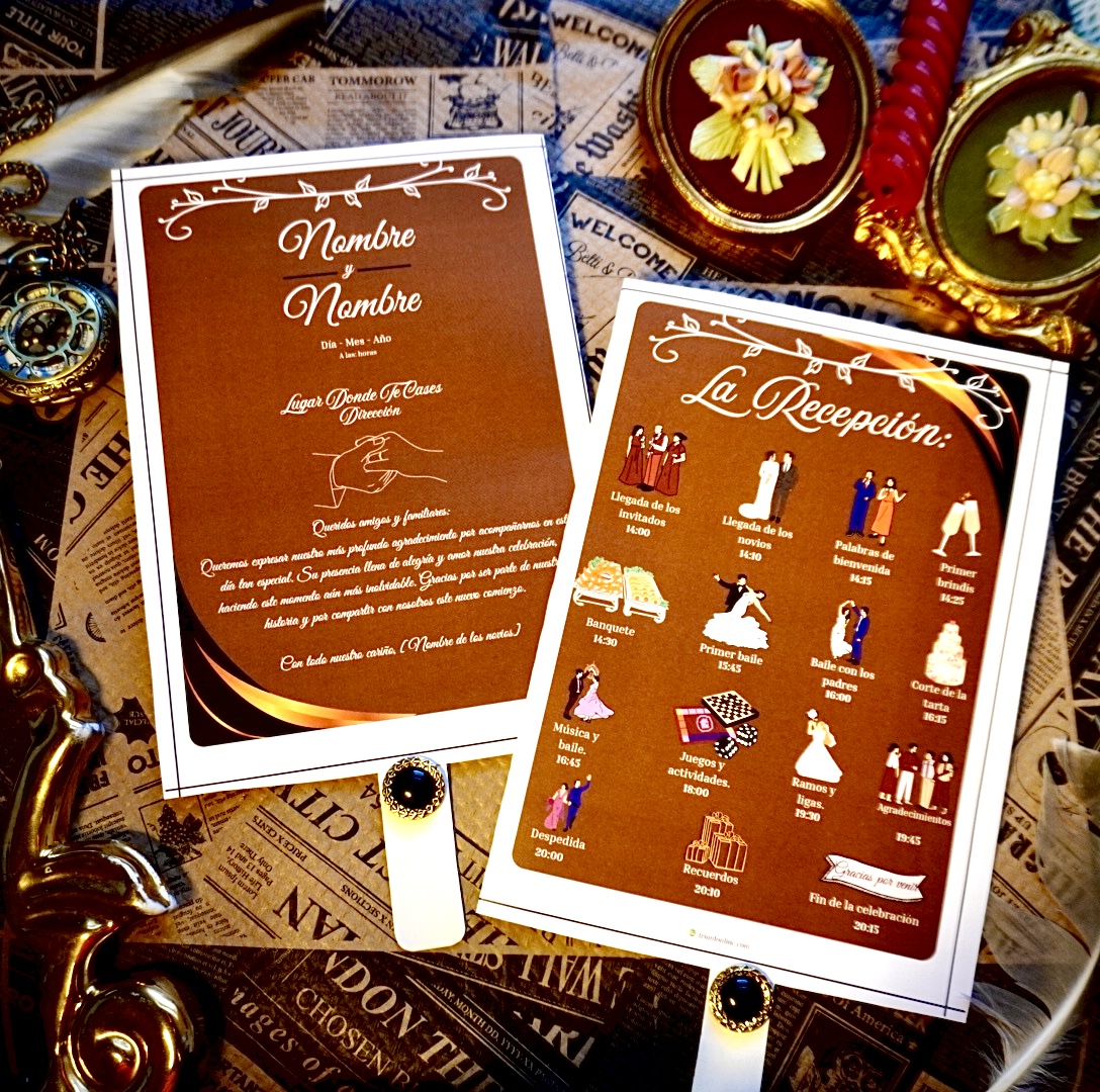 💡 Todo personalizable con nombres, lugar, fecha y los horarios o partes únicas de tu evento. Adáptalo fácilmente a cualquier tipo de celebración.