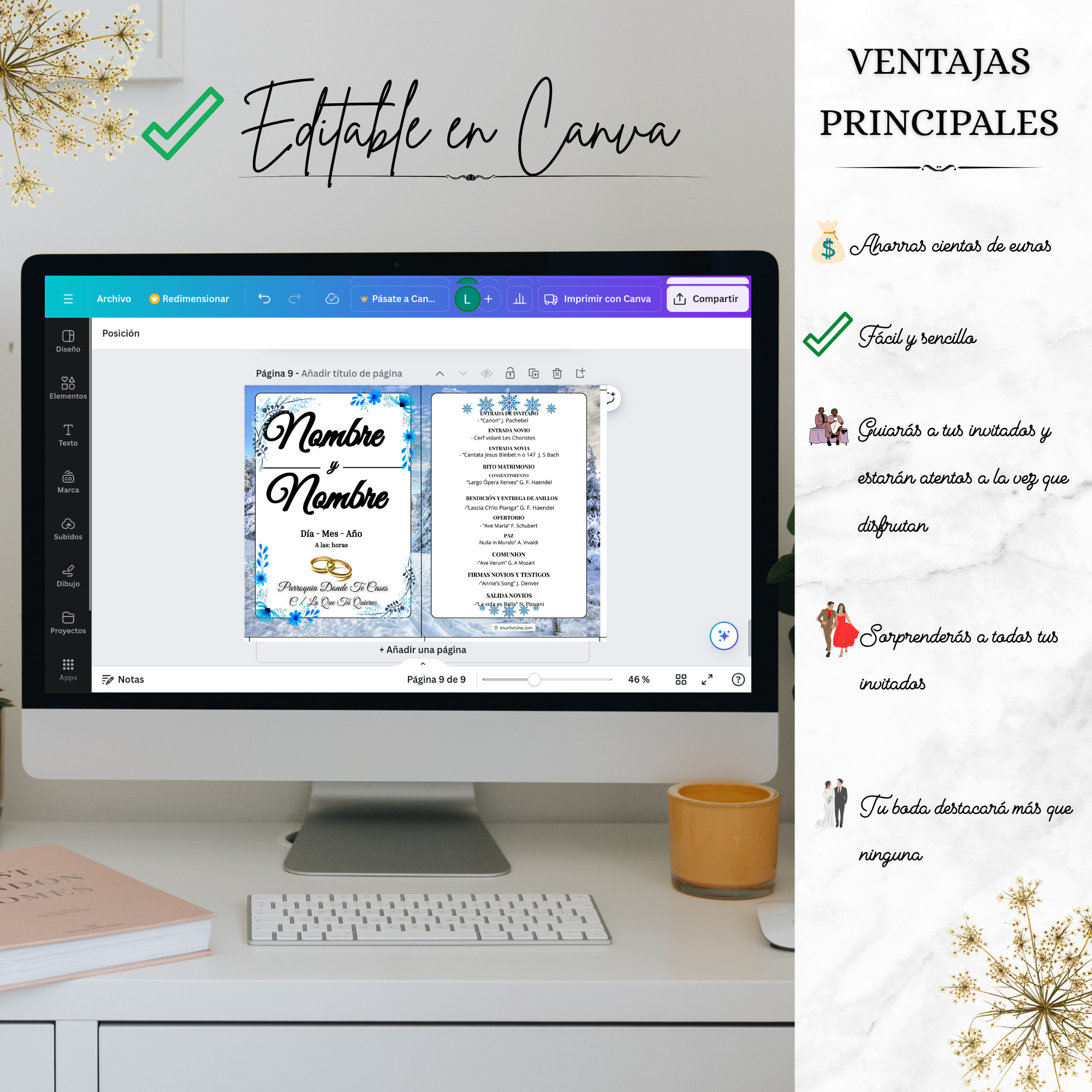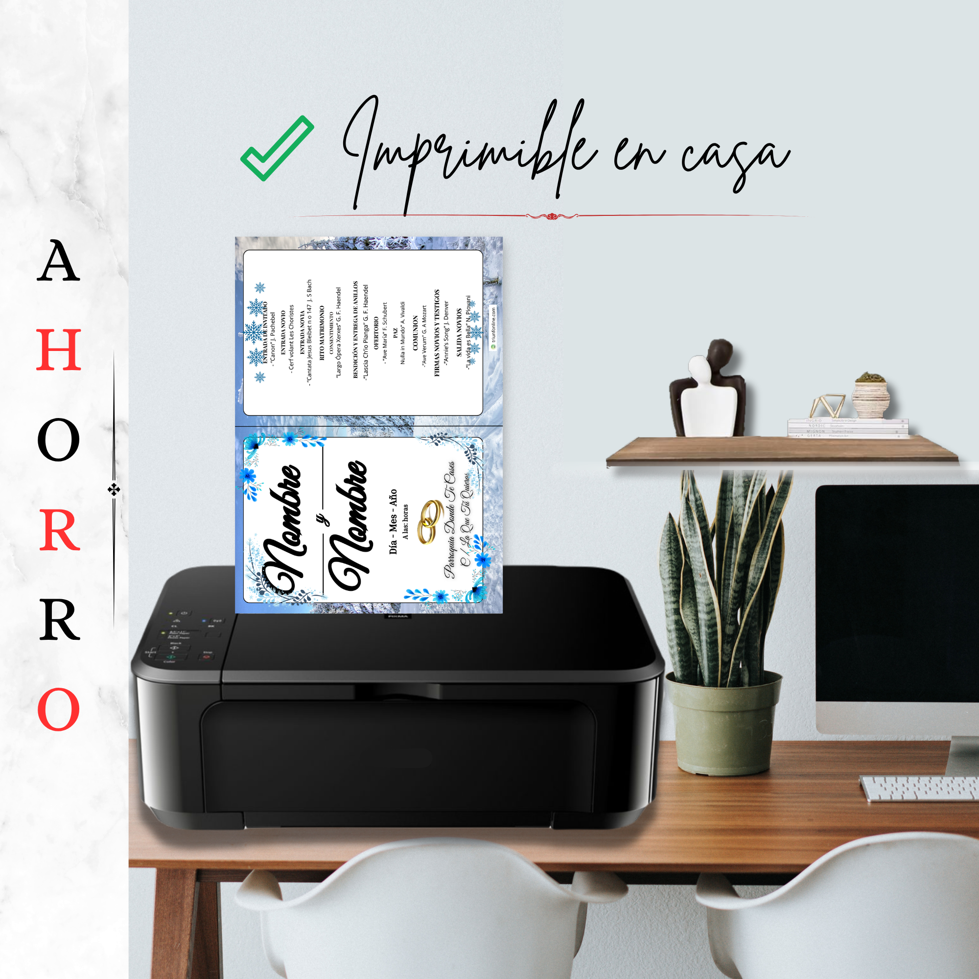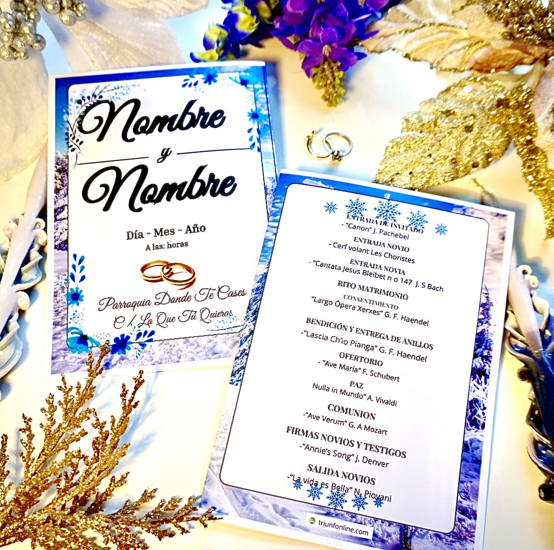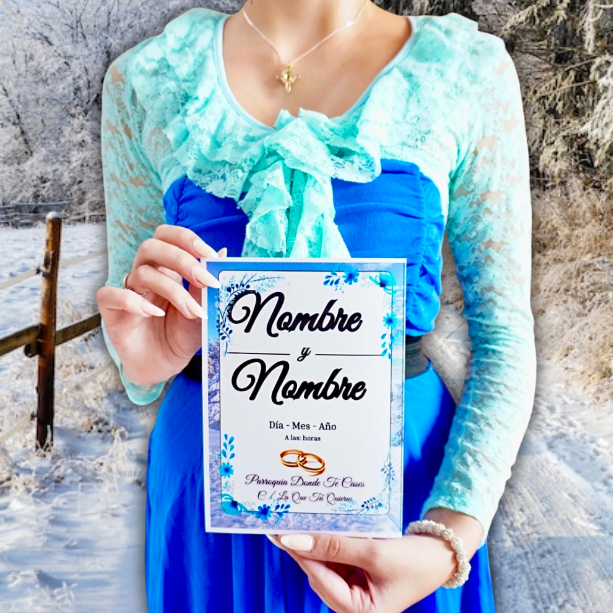 Esta opción captura la elegancia fría y mágica del invierno: fondo en tonos azules suaves y profundos, con detalles florales azulados y copos de nieve que transmiten una atmósfera serena, elegante y envolvente. Ideal para bodas celebradas en invierno o con temática nevada.