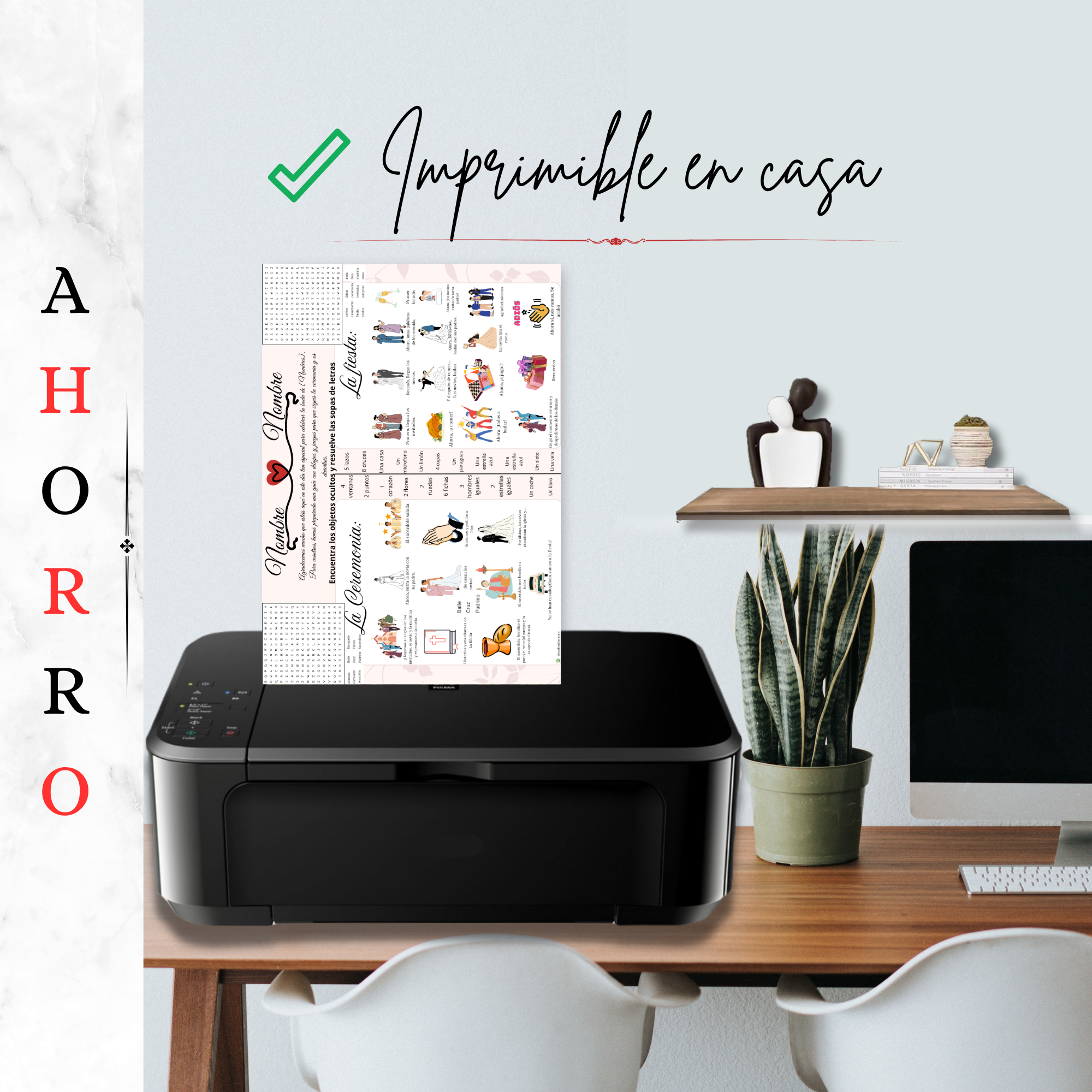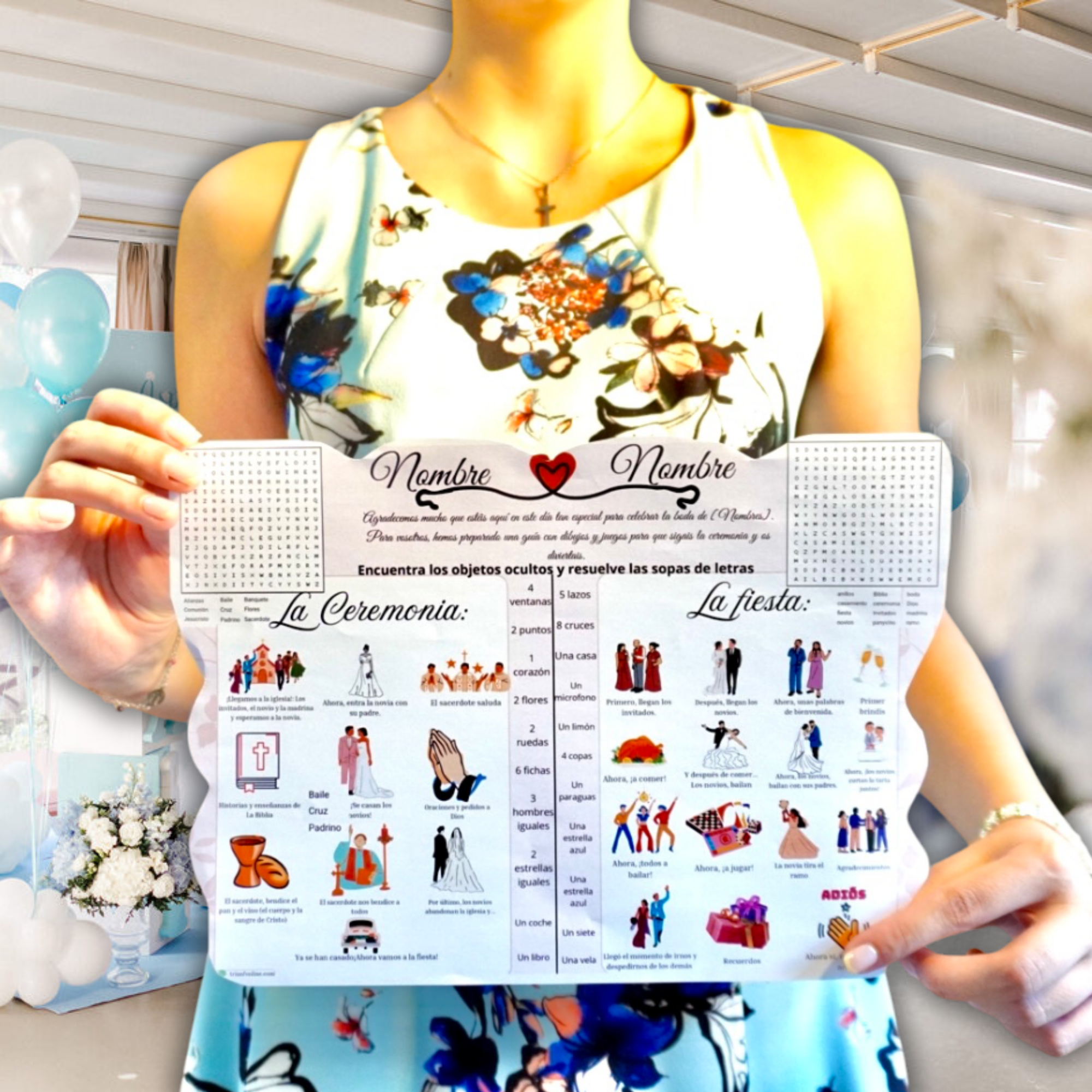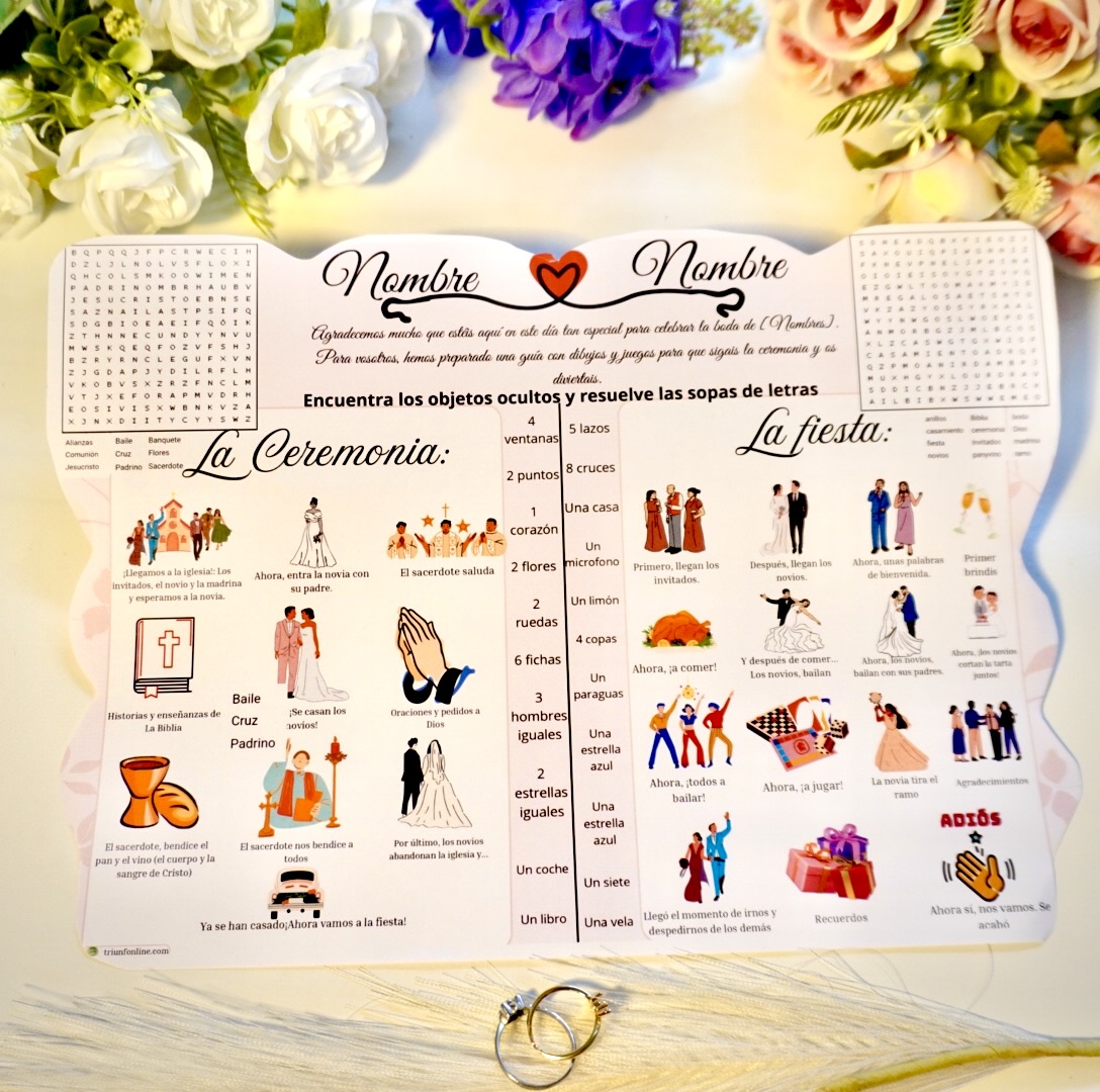 📥 Entrega digital editable, personalizada con los nombres, la fecha y el lugar, e incluye todos los dibujos y juegos adaptados a vuestra boda.