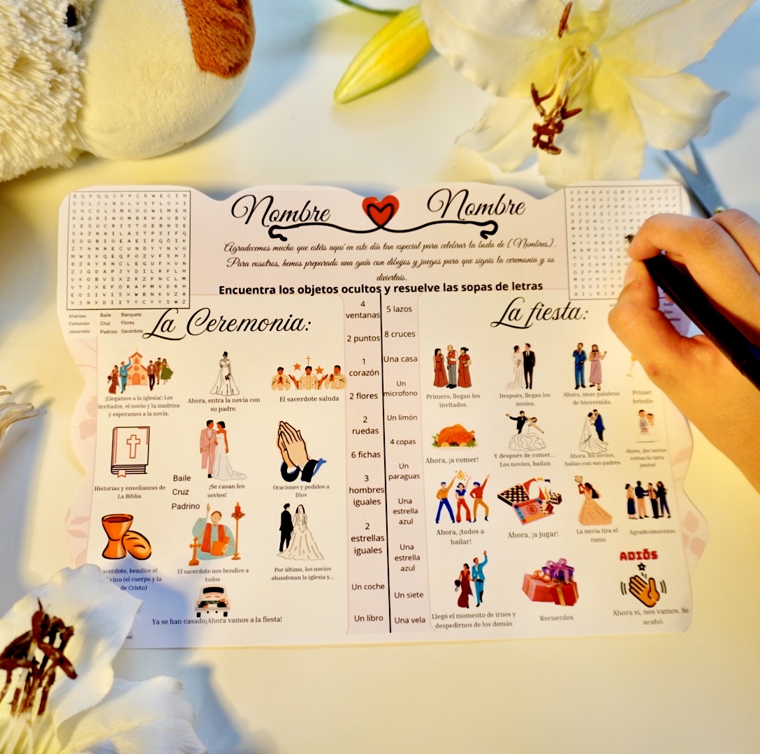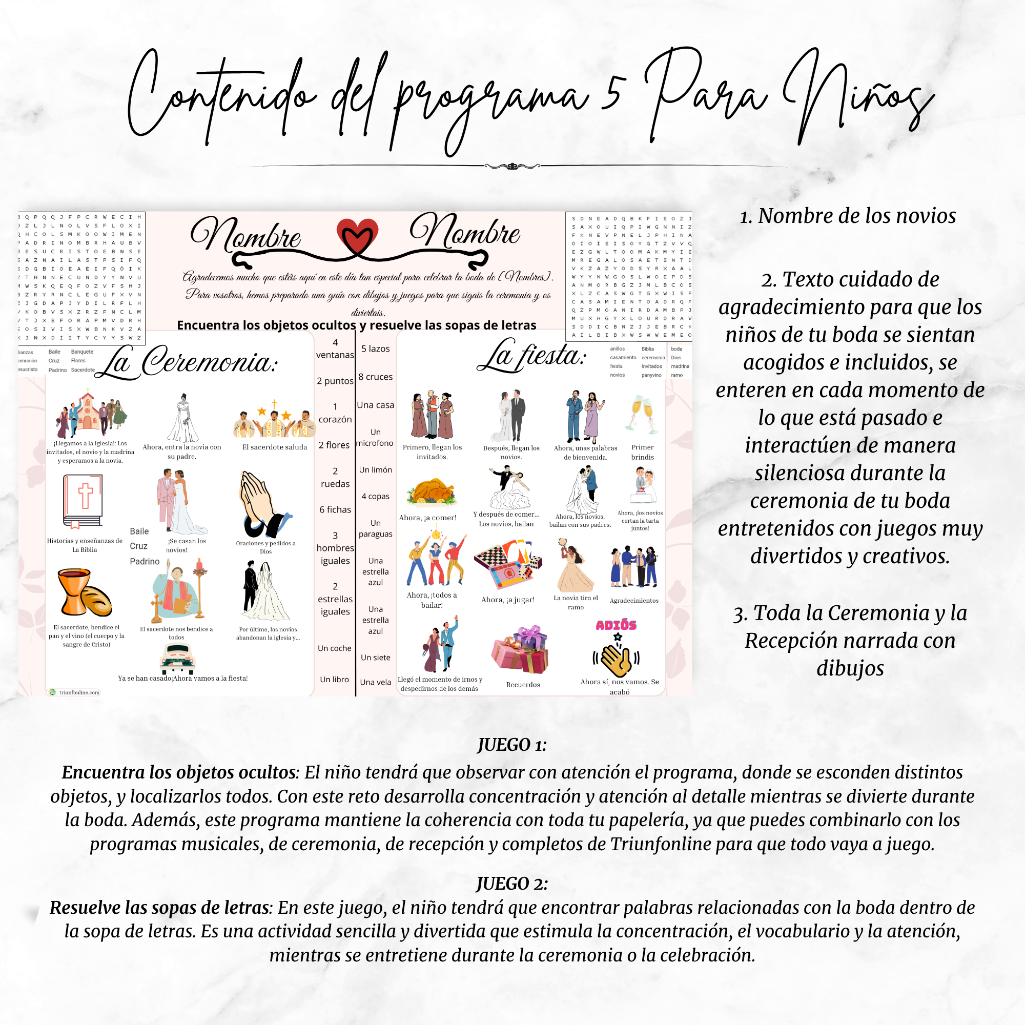 Este programa infantil está diseñado para que los niños comprendan todo lo que sucede en la boda, disfruten del evento y se mantengan entretenidos con actividades diseñadas especialmente para ellos. Cada parte está acompañada de dibujos a color, explicaciones sencillas y juegos que estimulan la observación y la concentración.