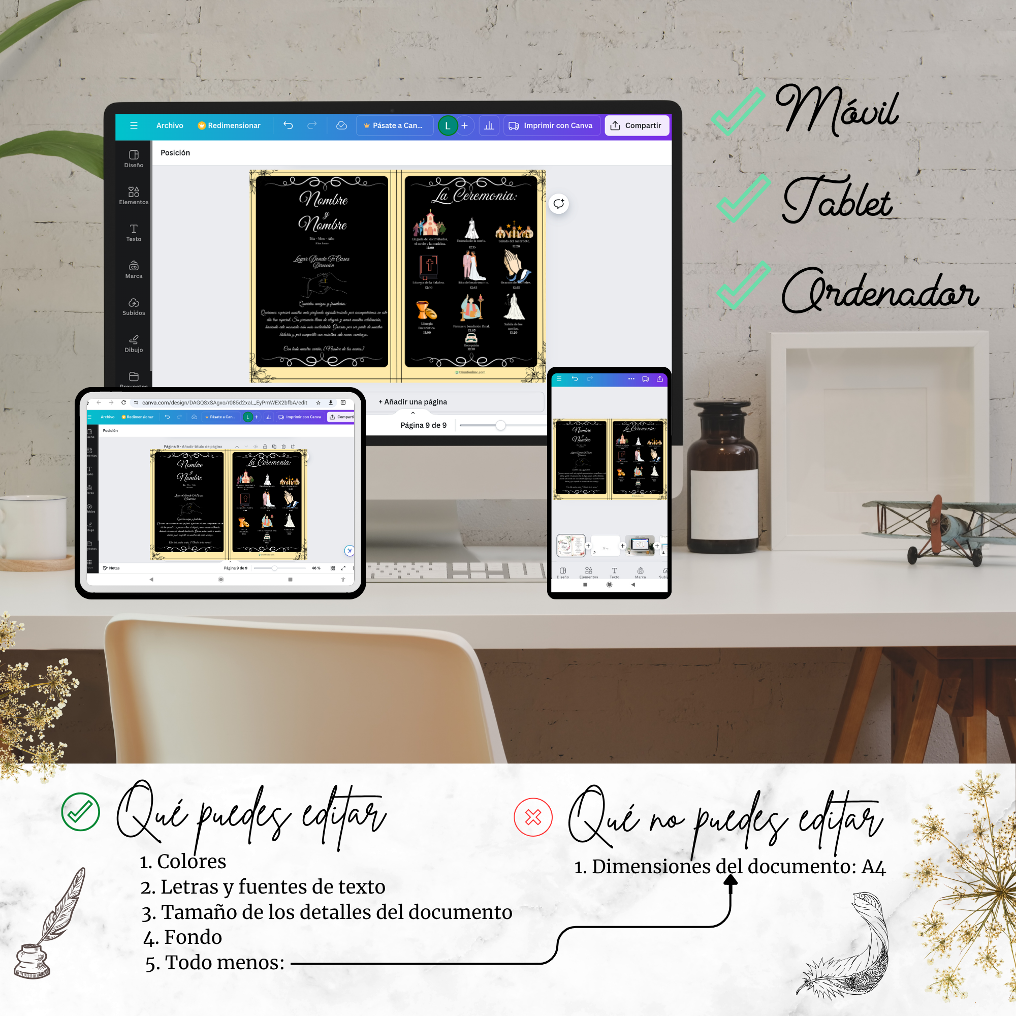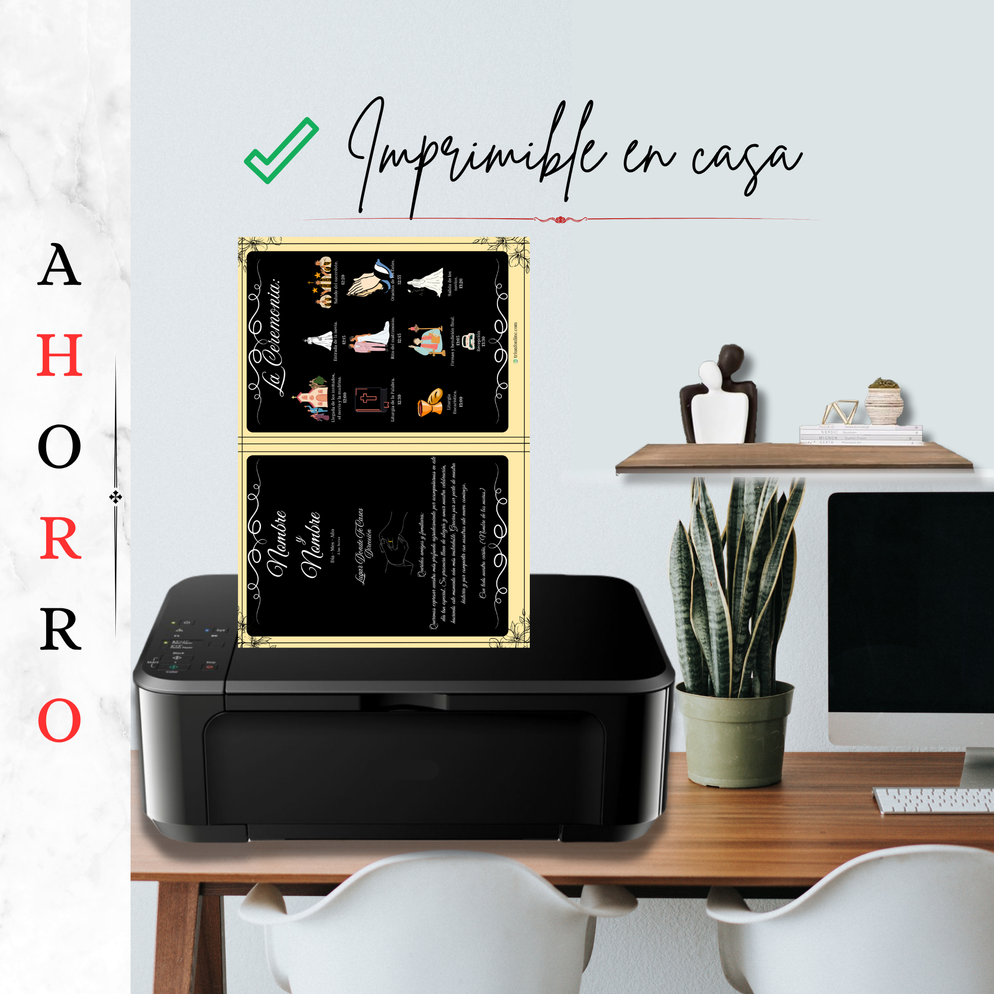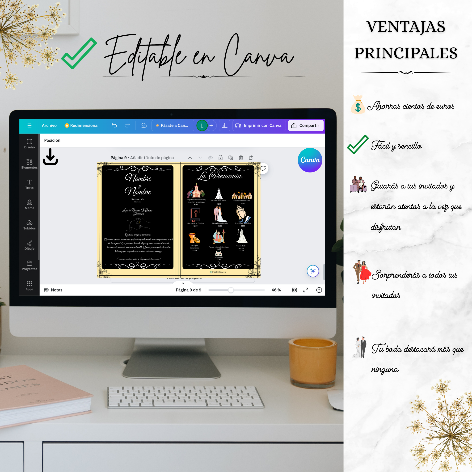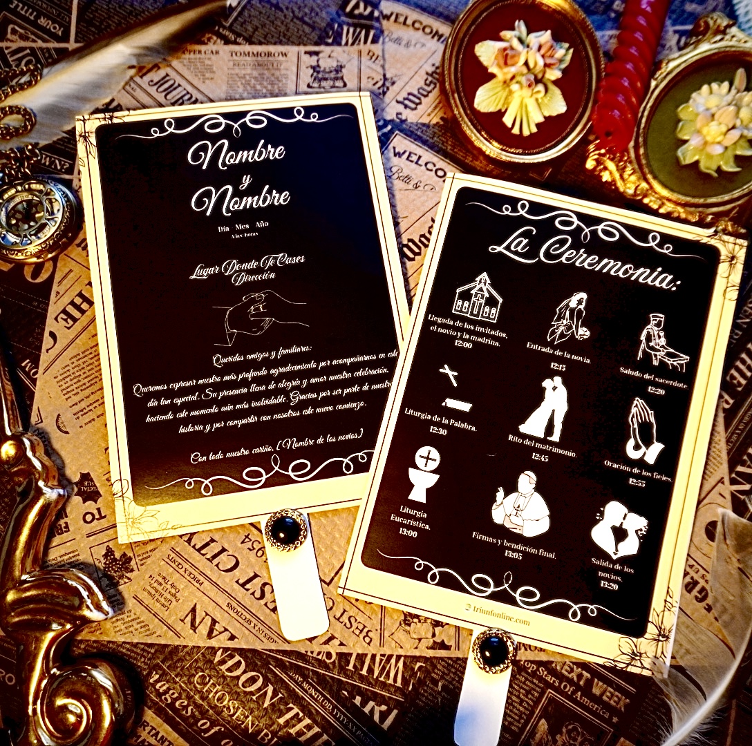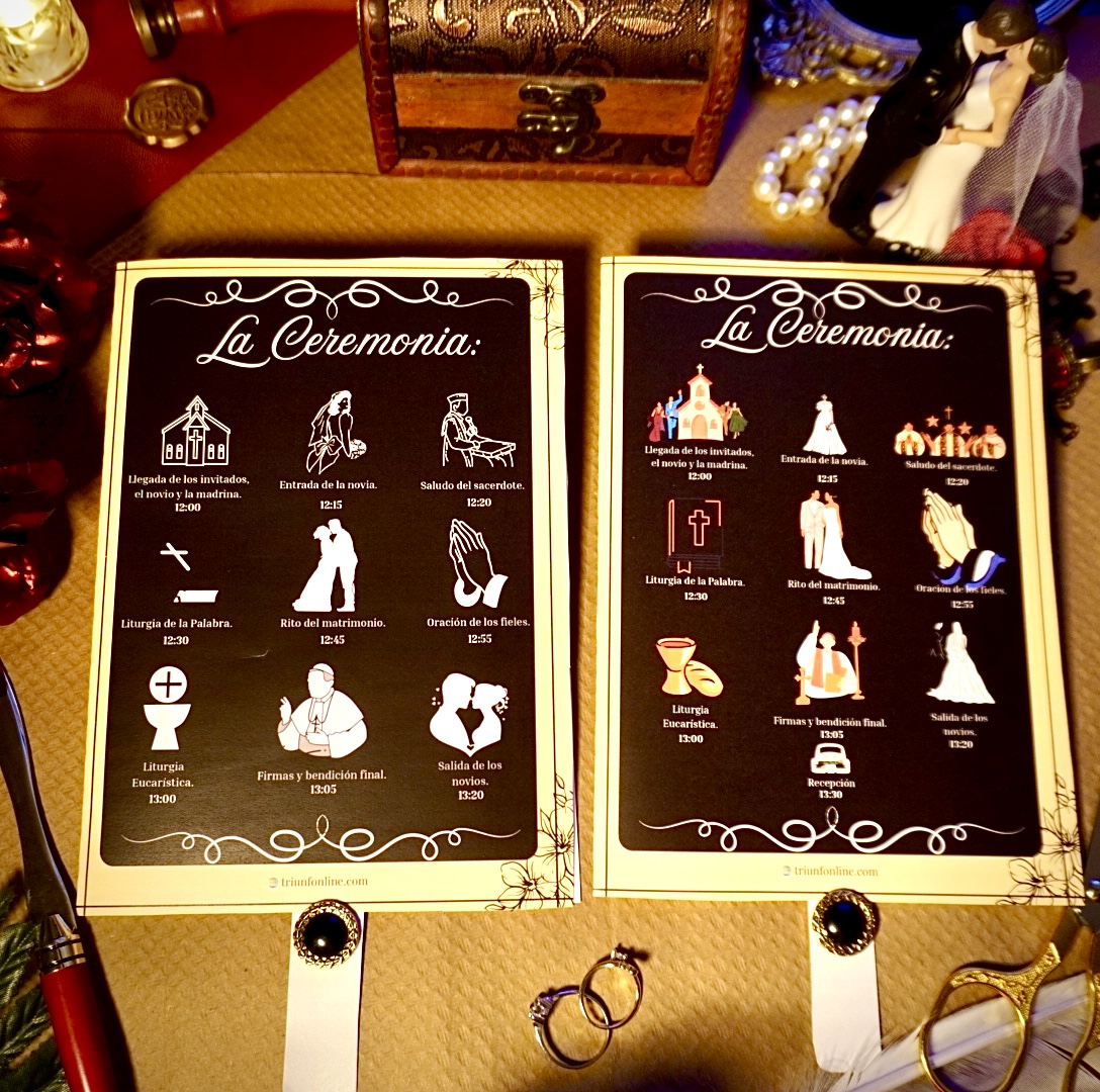 🎁 Coordínalo con sus otras opciones a la par (programa musical, de recepción y completo) para conseguir un conjunto visual que respira unidad, elegancia y personalidad desde el primer al último detalle.
