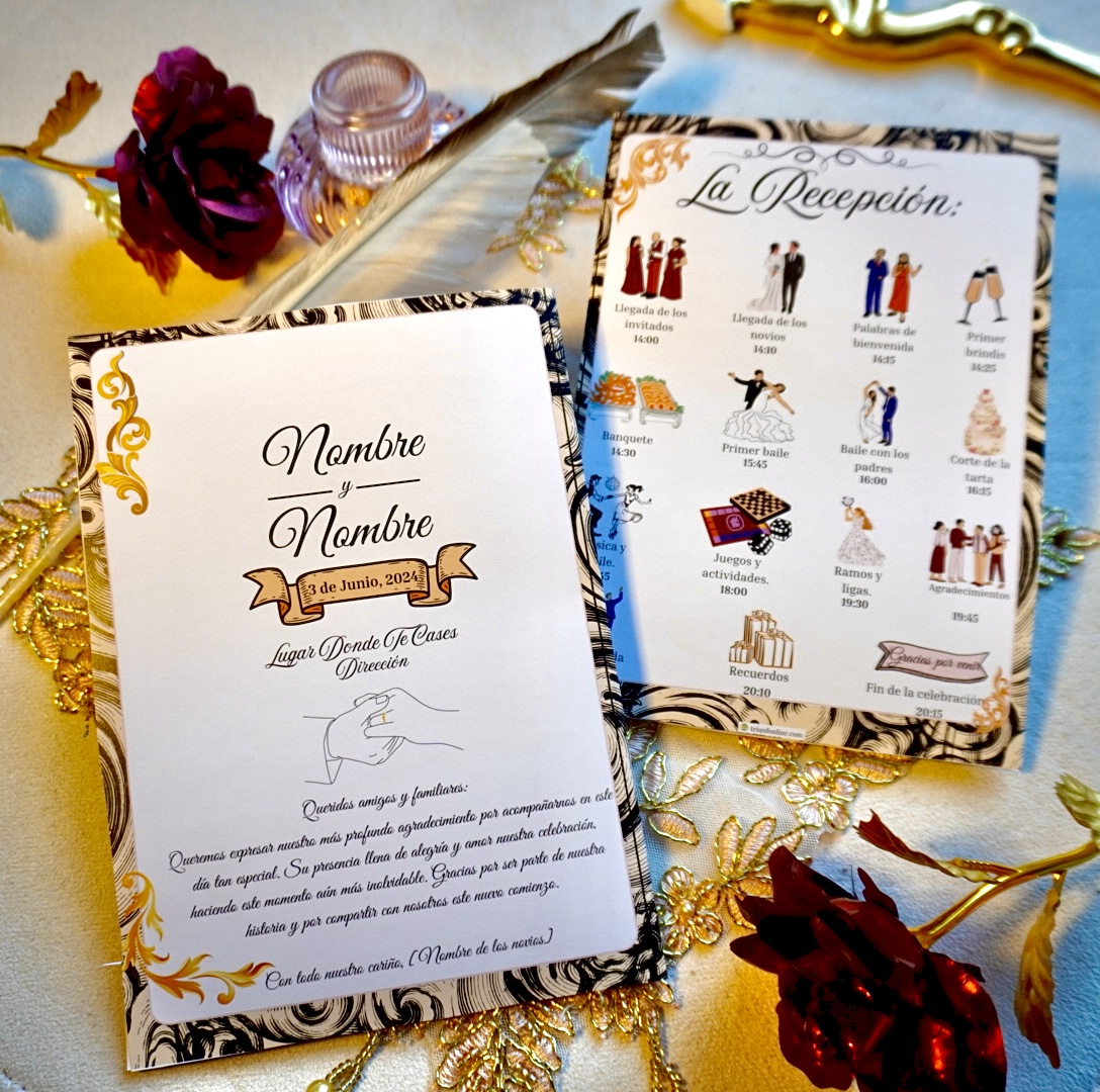 Fondo crema con decoraciones negras y detalles dorados. Una combinación refinada y armónica que transmite elegancia atemporal. Ideal para recepciones luminosas con una estética barroca sutil y delicada.