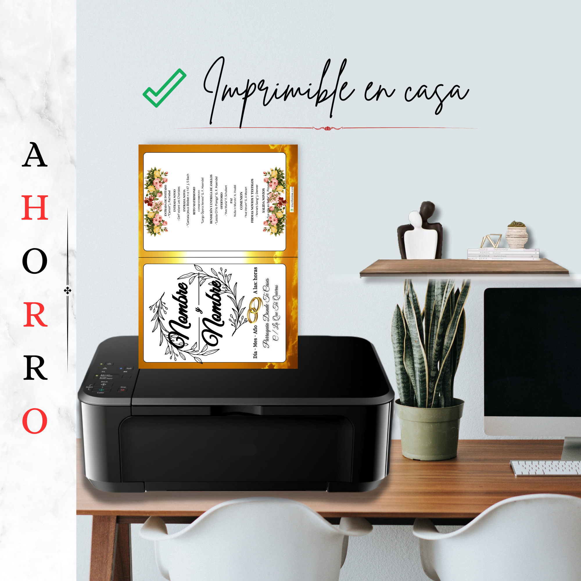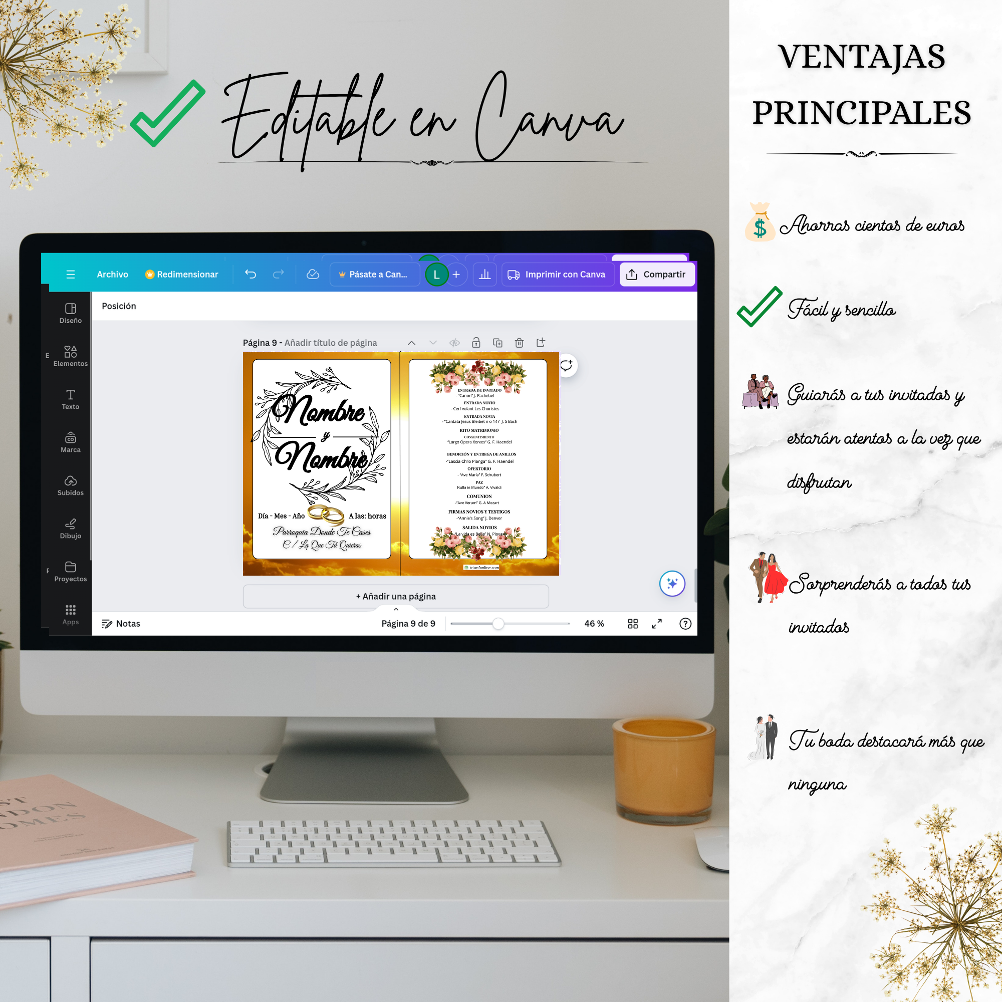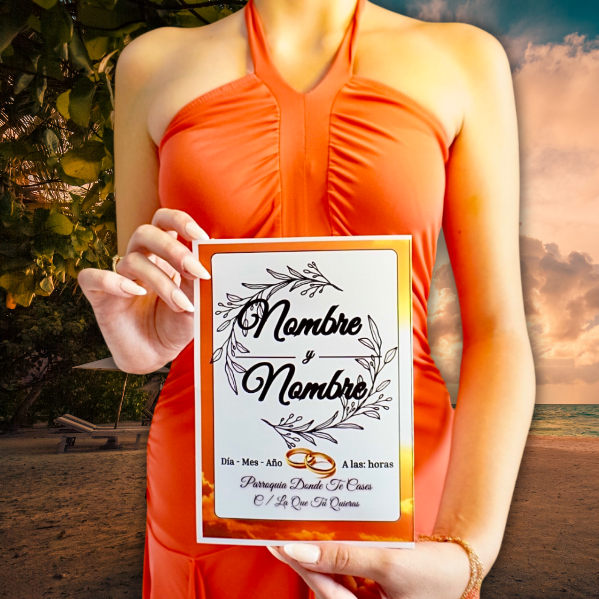 Esta opción transmite toda la energía y vitalidad del verano: un fondo cálido, luminoso y vibrante, con detalles florales propios de la temporada y sutiles contrastes en negro que enmarcan el contenido con elegancia. Perfecto para bodas alegres, al aire libre y llenas de luz.