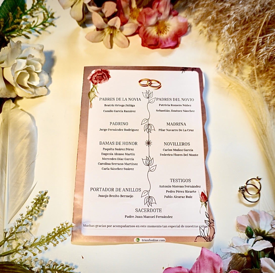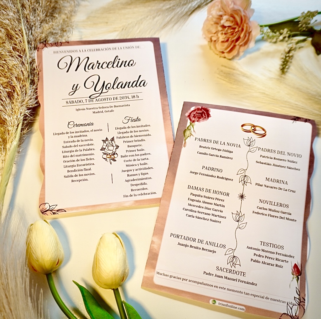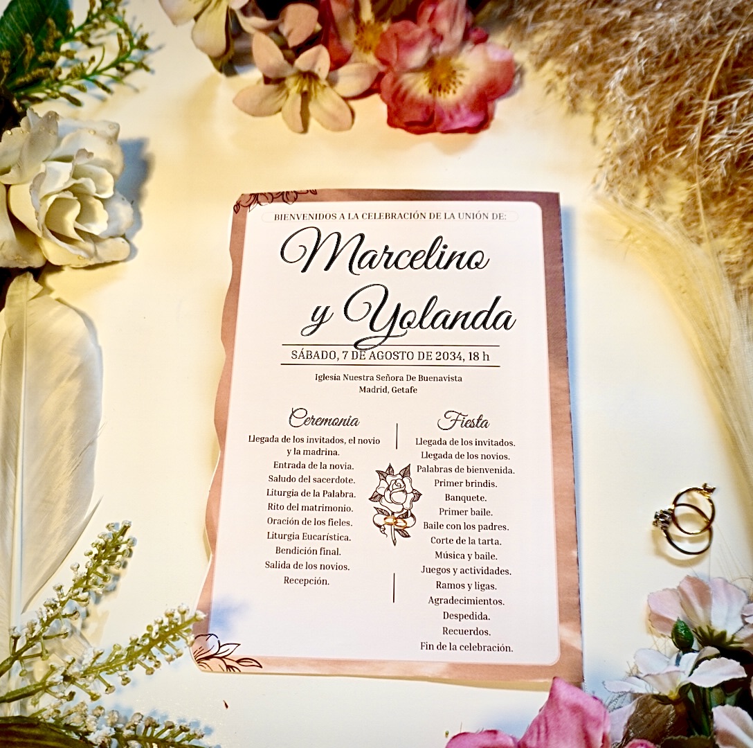 📥 Entrega digital editable, personalizada con los nombres, fecha, lugar y estructura de tu ceremonia y celebración.