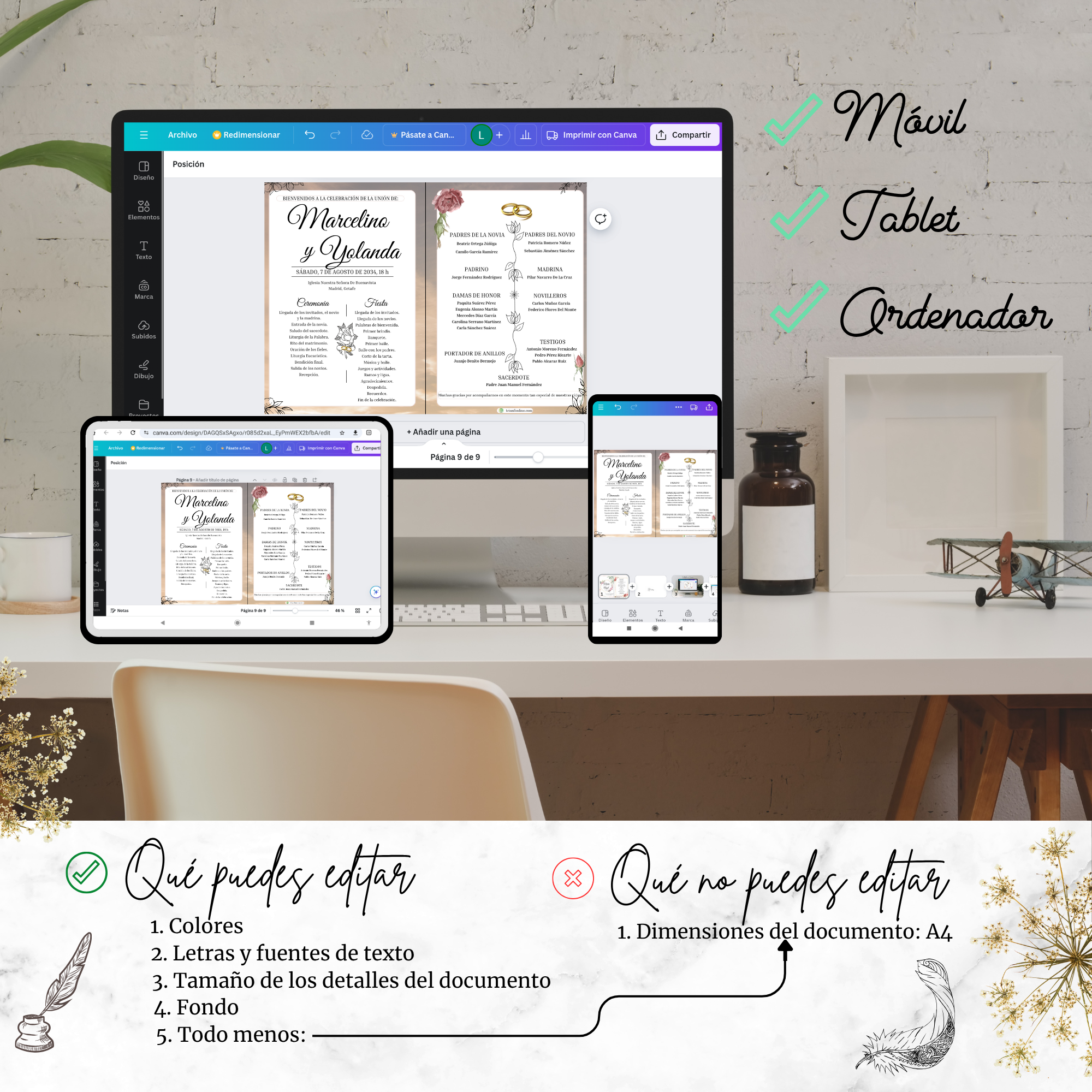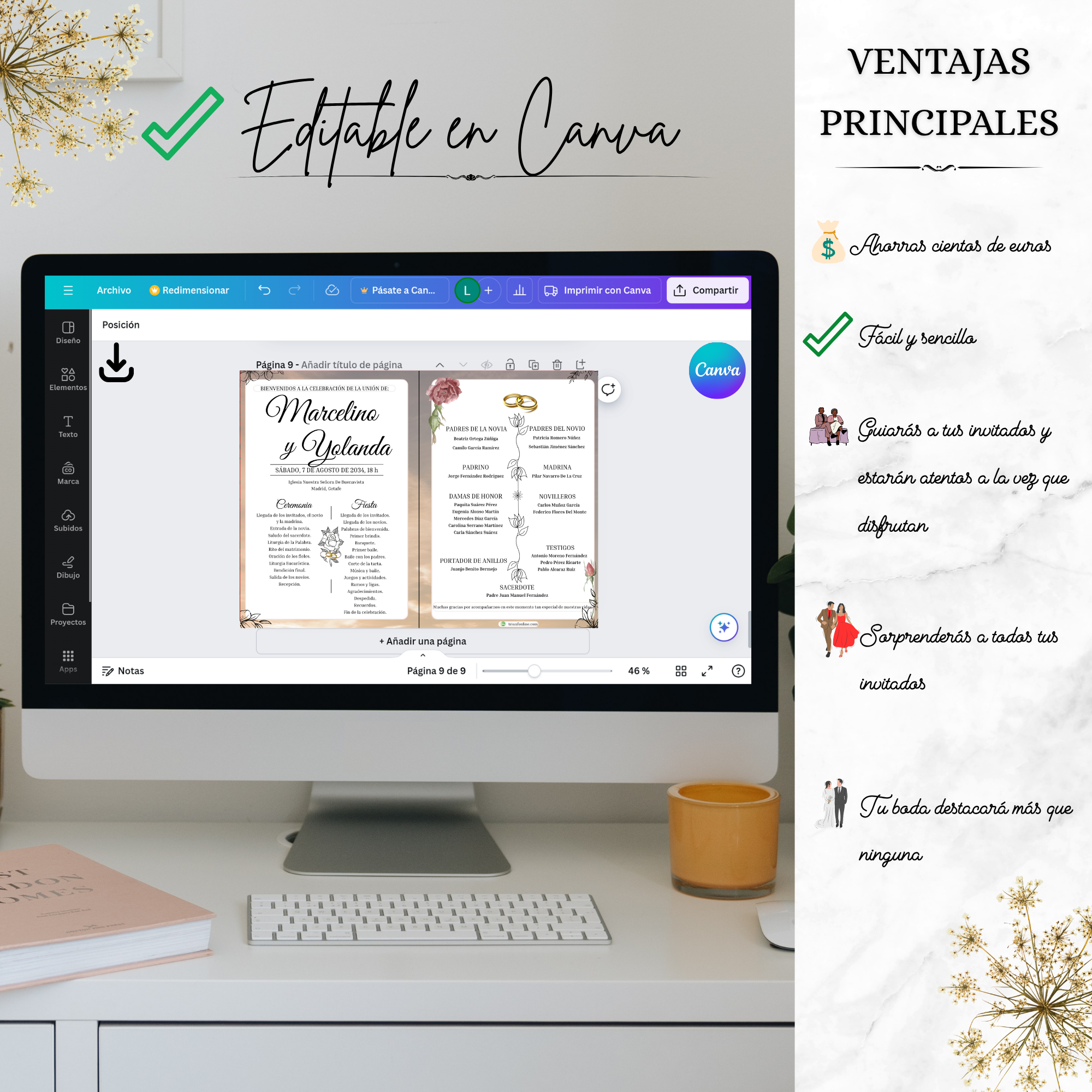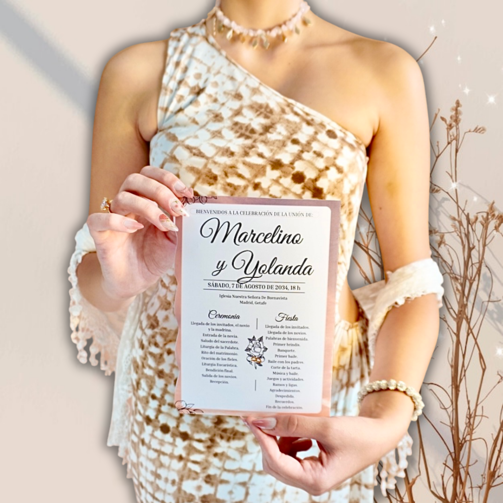 📥 Entrega digital editable, personalizada con los nombres, fecha, lugar y estructura de tu ceremonia y celebración.