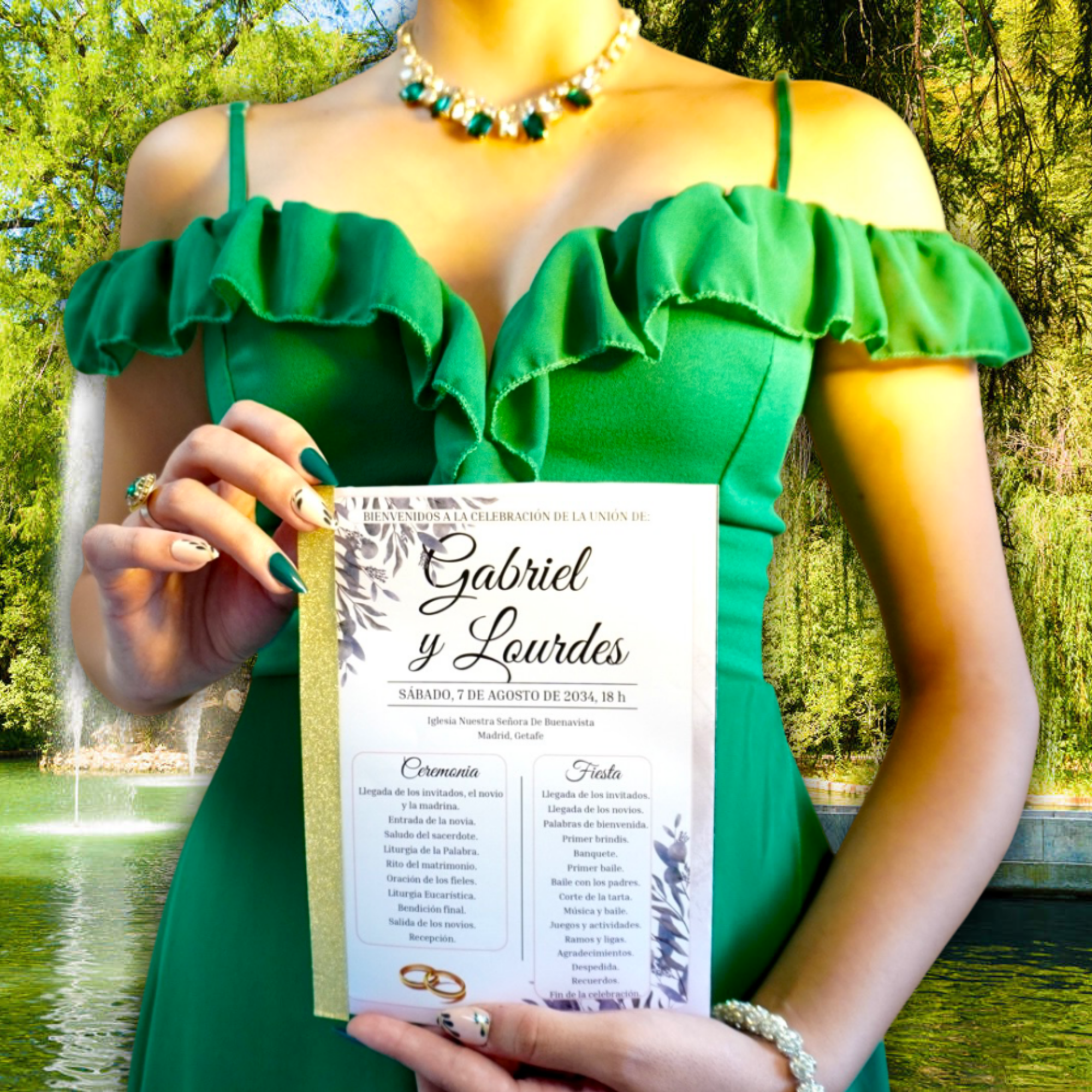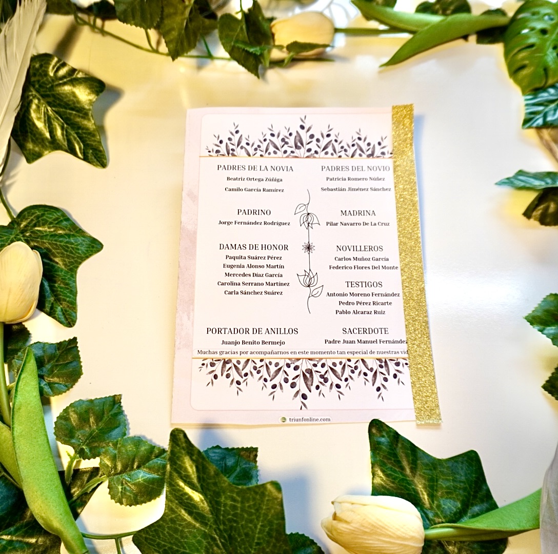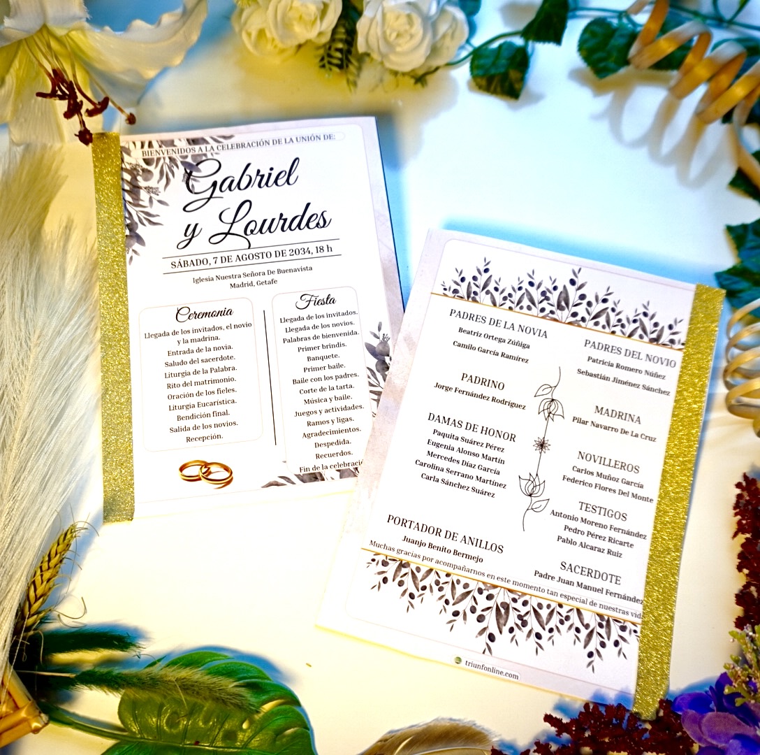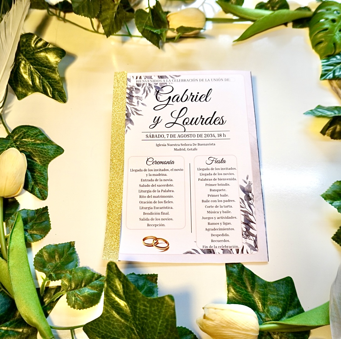 📥 Entrega digital editable, personalizada con los nombres, fecha, lugar y estructura de tu ceremonia y celebración.
