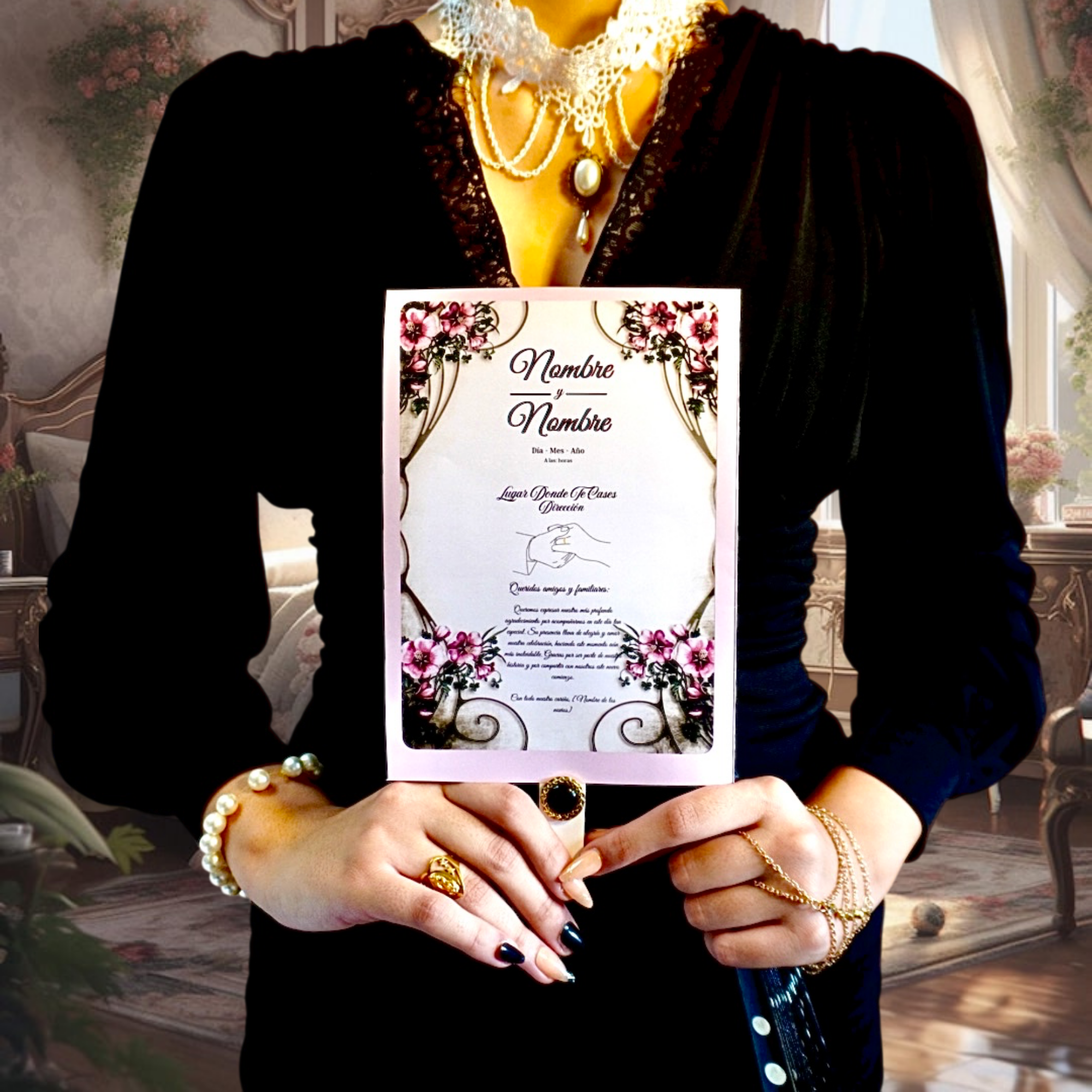 El fondo principal es de un rosa vintage suave, con un bloque de contenido en rosado más profundo con detalles decorativos florales muy sutiles. La tipografía blanca y los acabados gráficos completan un diseño romántico, envolvente y especial.