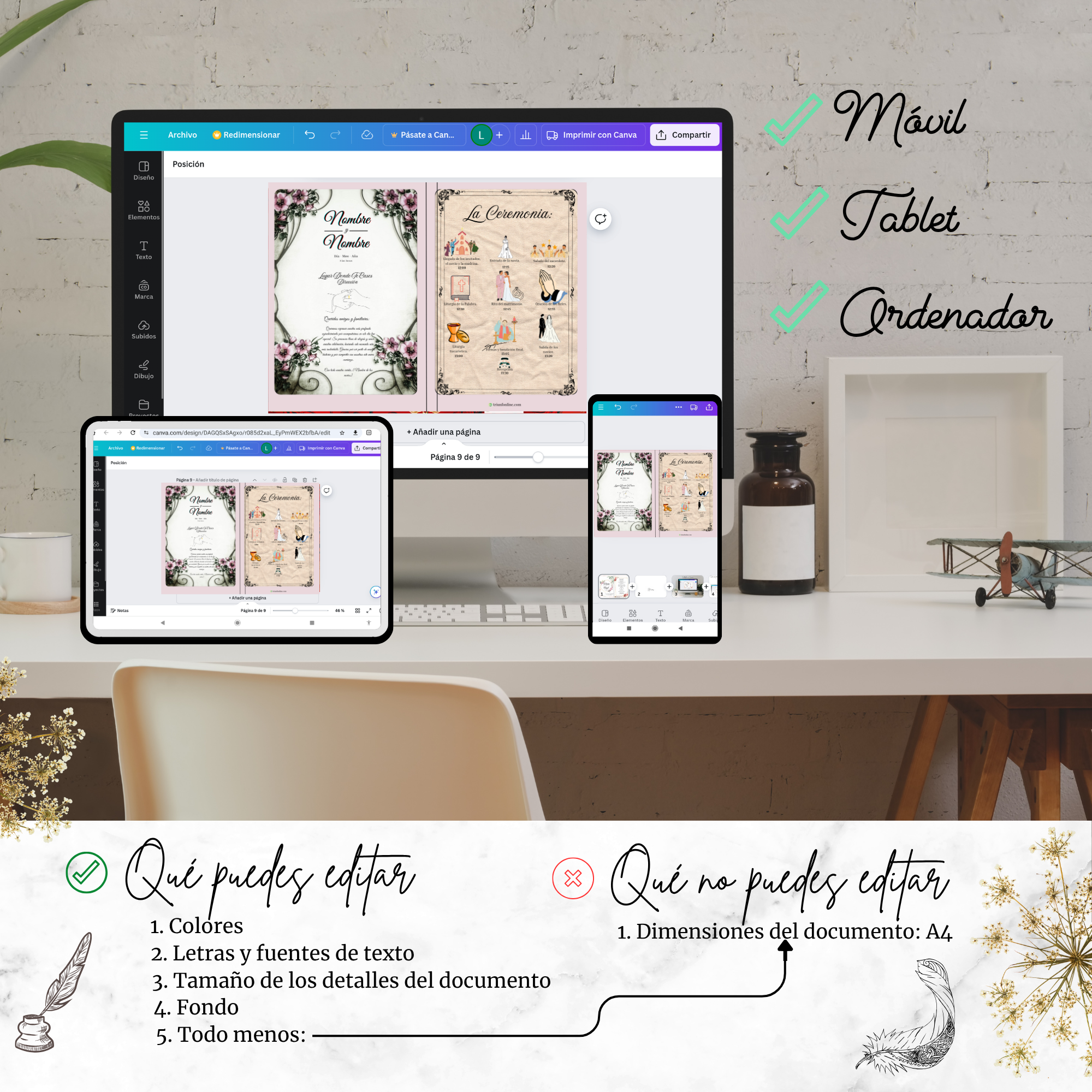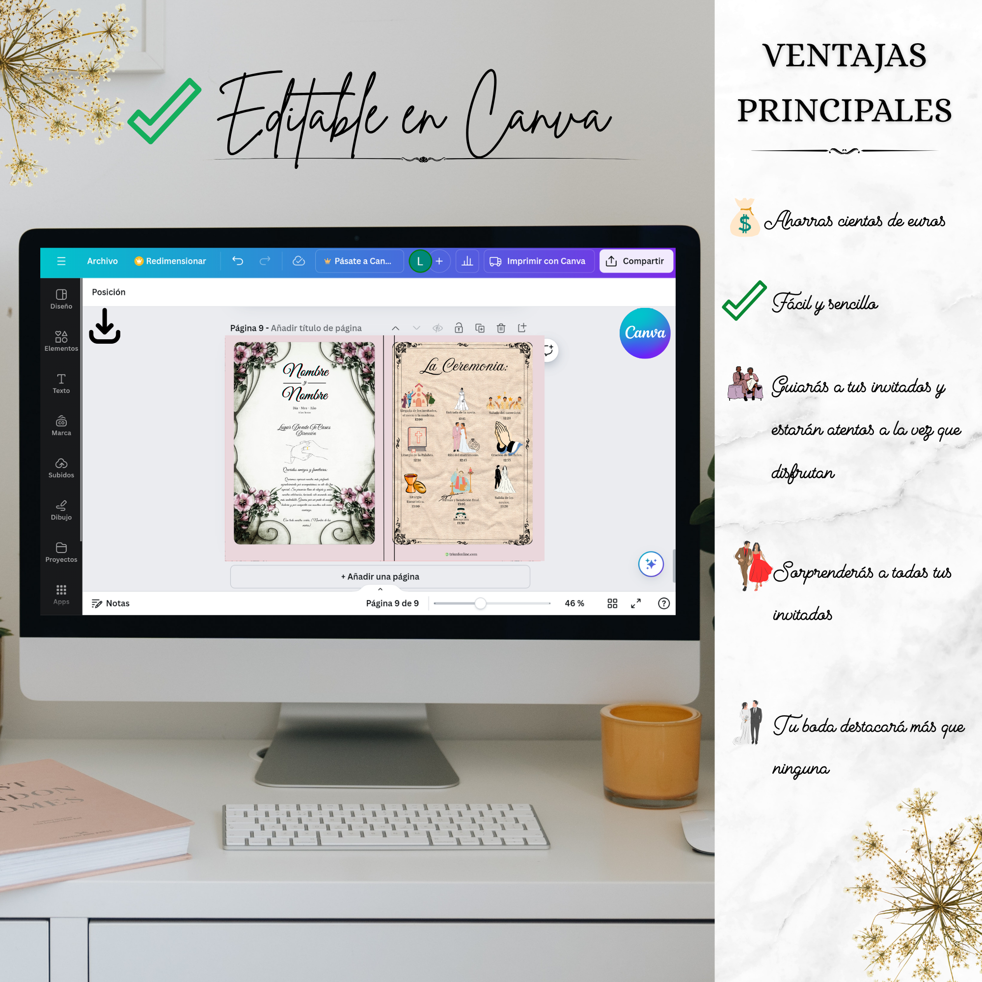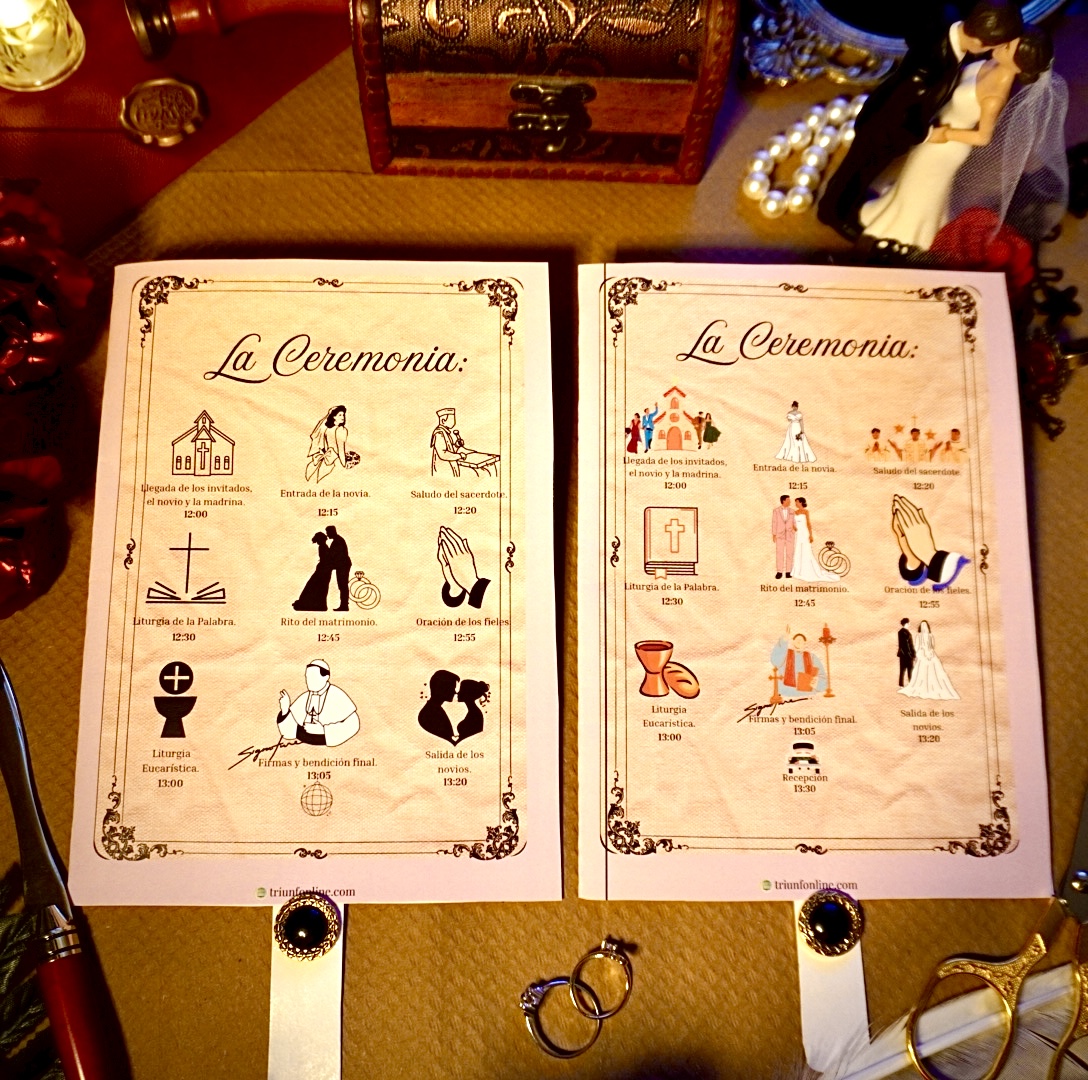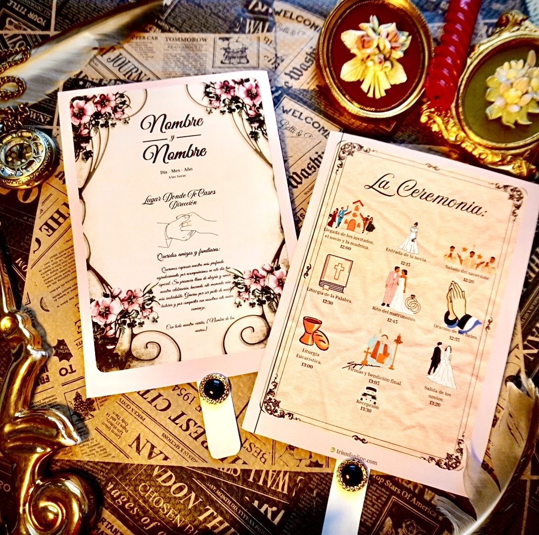 🎁 Coordínalo con sus otras opciones a la par (programa musical, de recepción y completo) para conseguir un conjunto visual que respira unidad, elegancia y personalidad desde el primer al último detalle.
