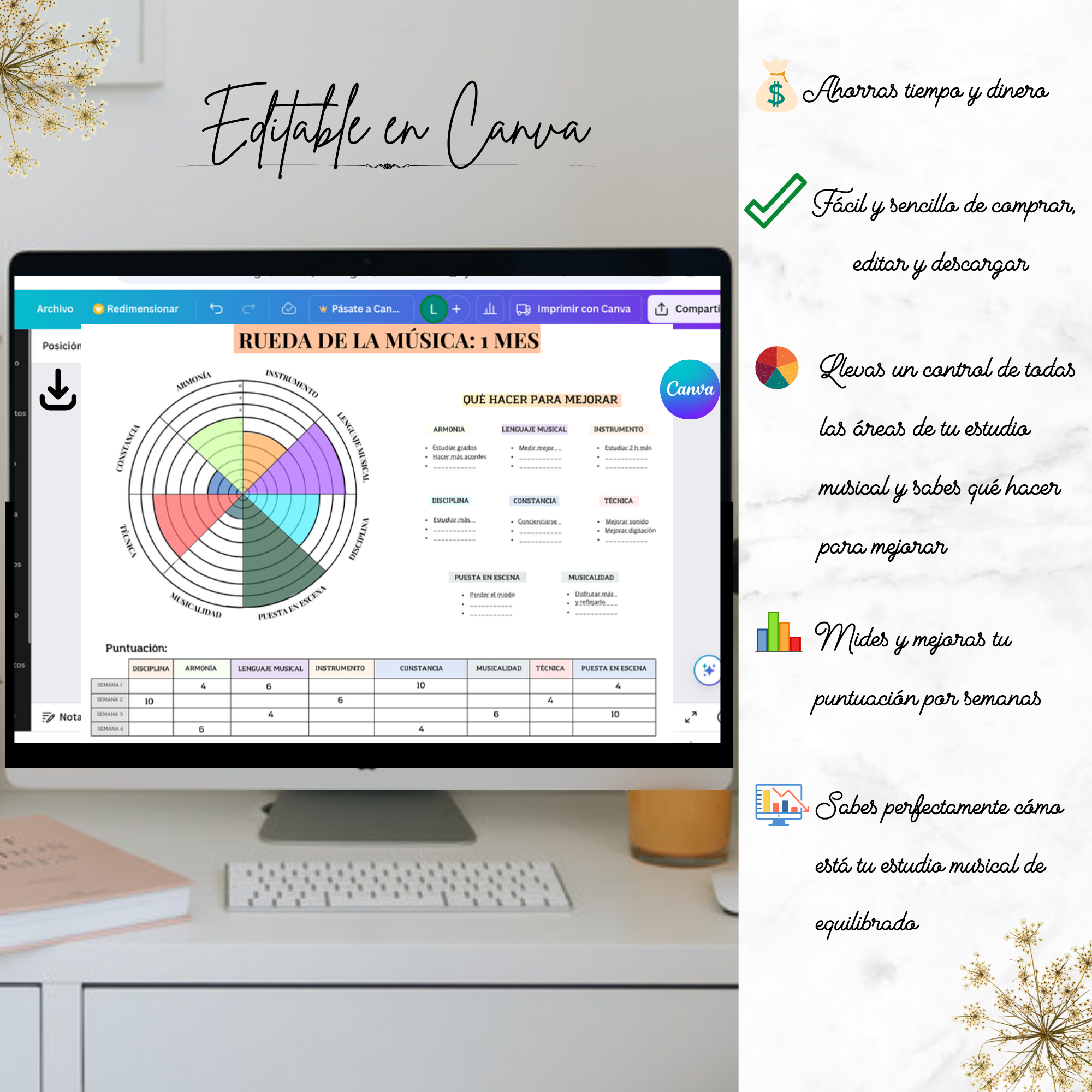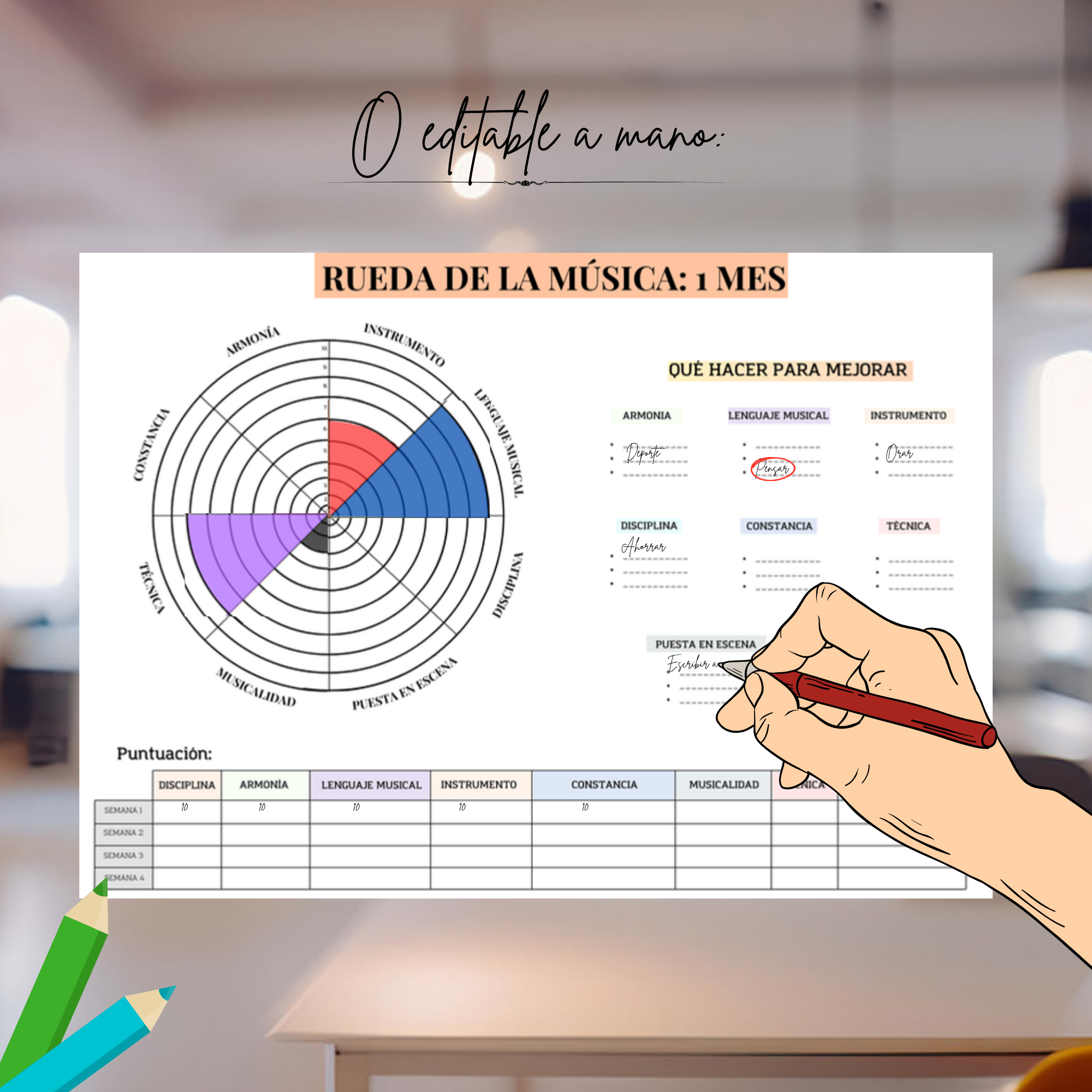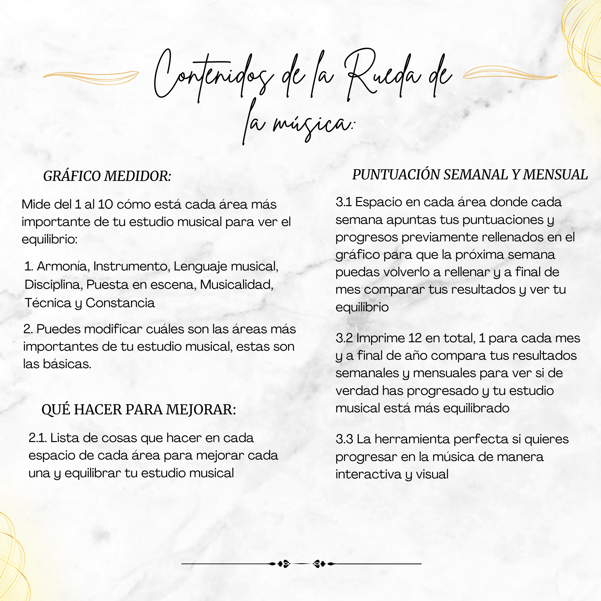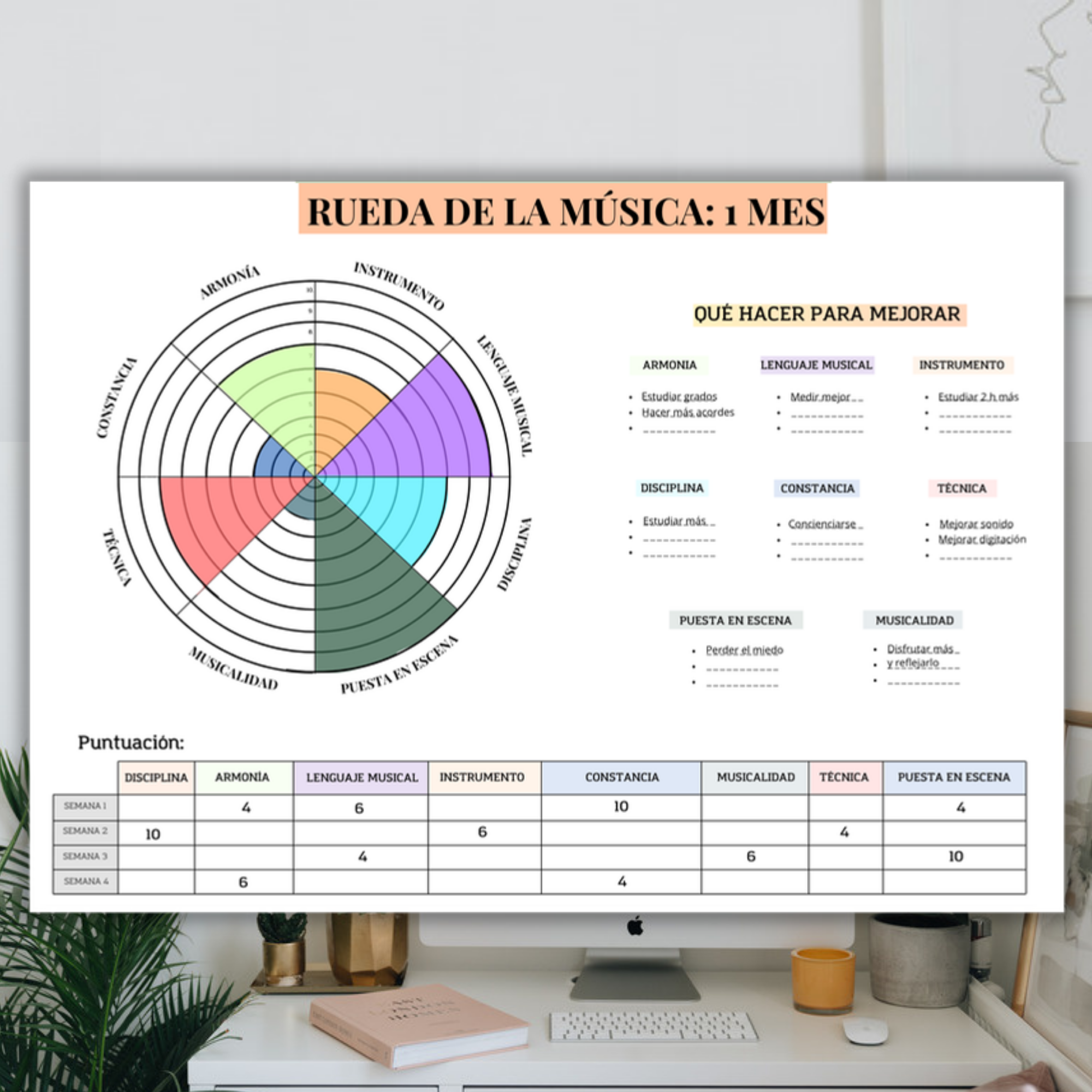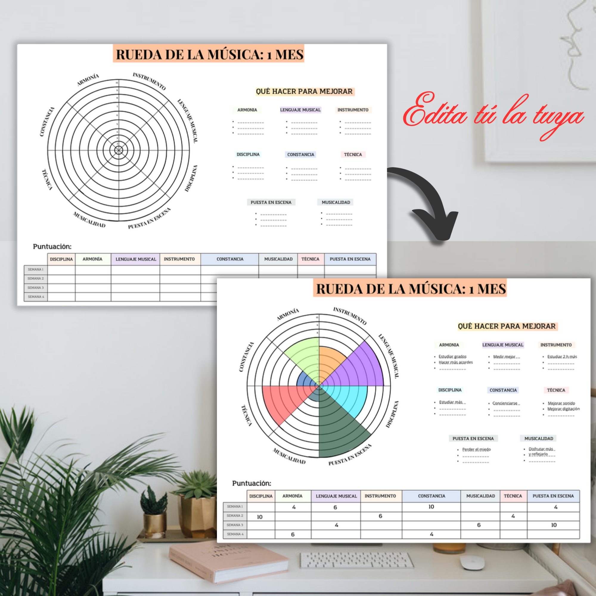 🎶 Lleva tu progreso musical al siguiente nivel con esta Plantilla de Rueda de la Música, diseñada para ayudarte a medir, analizar y mejorar las áreas clave de tu desarrollo como músico. Esta herramienta visual y práctica es ideal para estudiantes, profesionales y apasionados de la música que buscan crecer de manera integral.